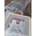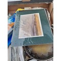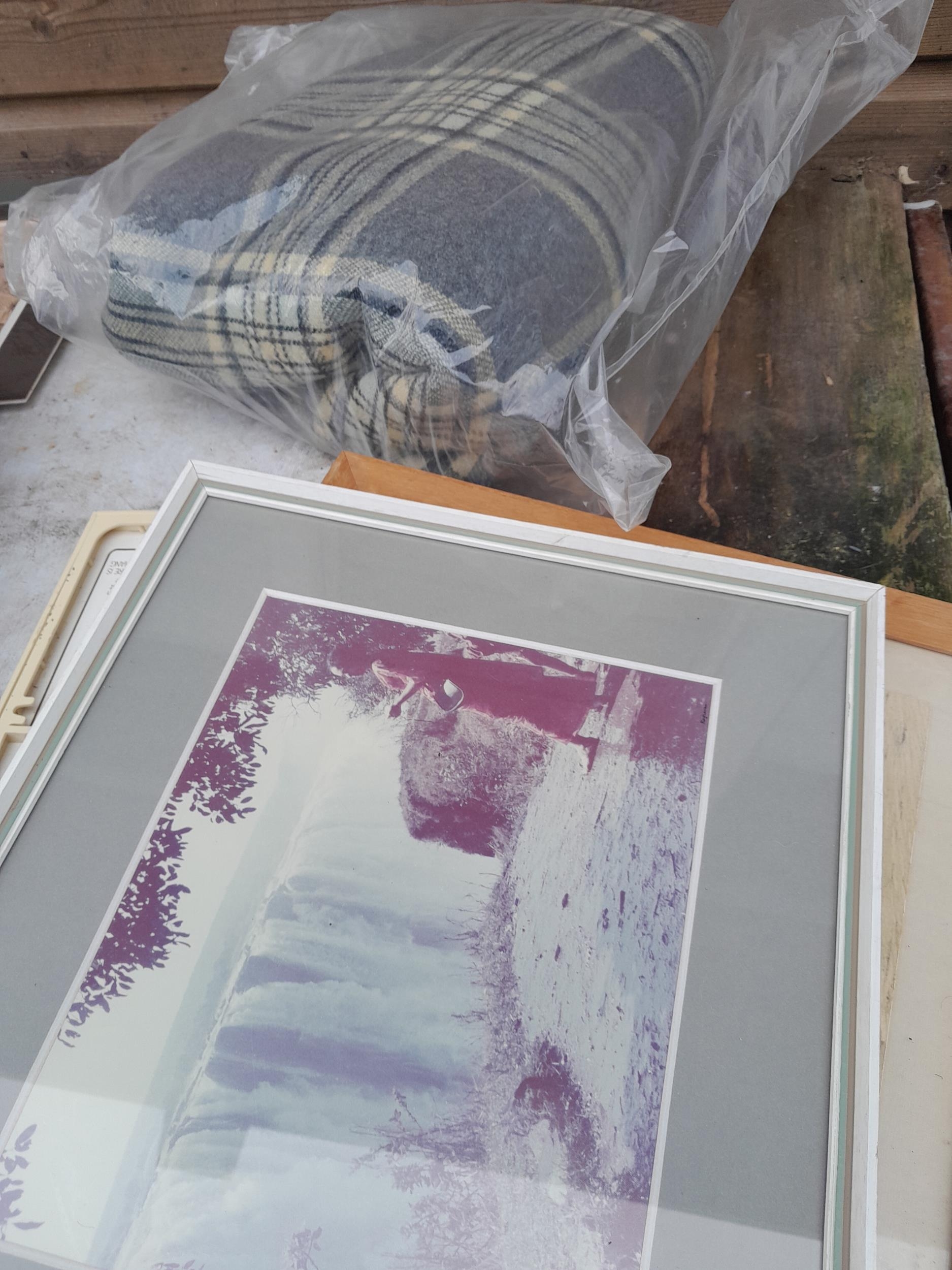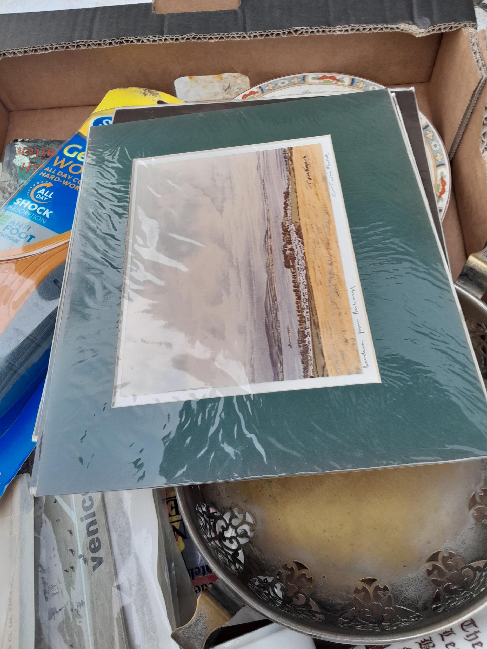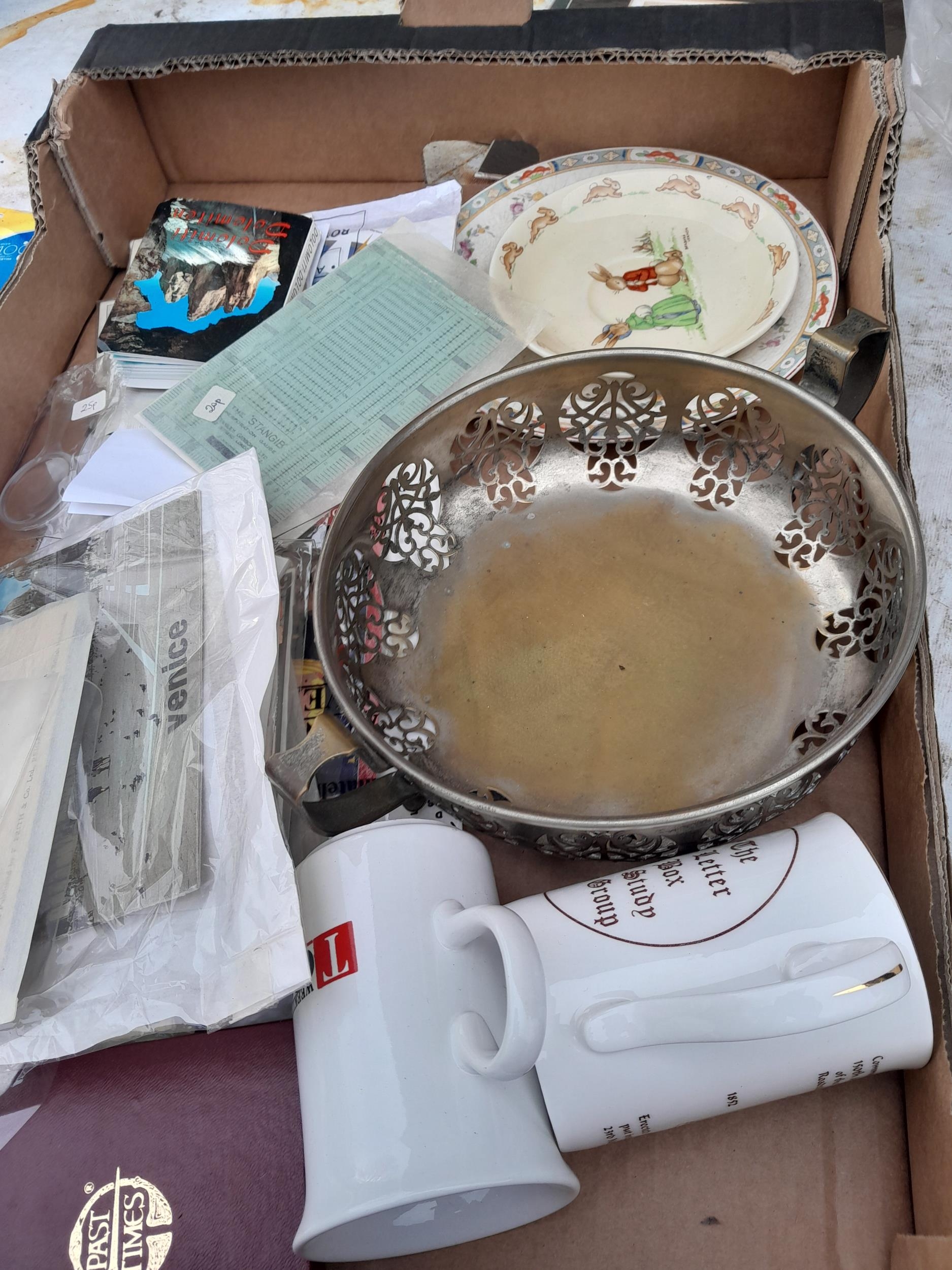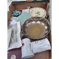 Box of oddments : blanket, plated dish postcards etc.