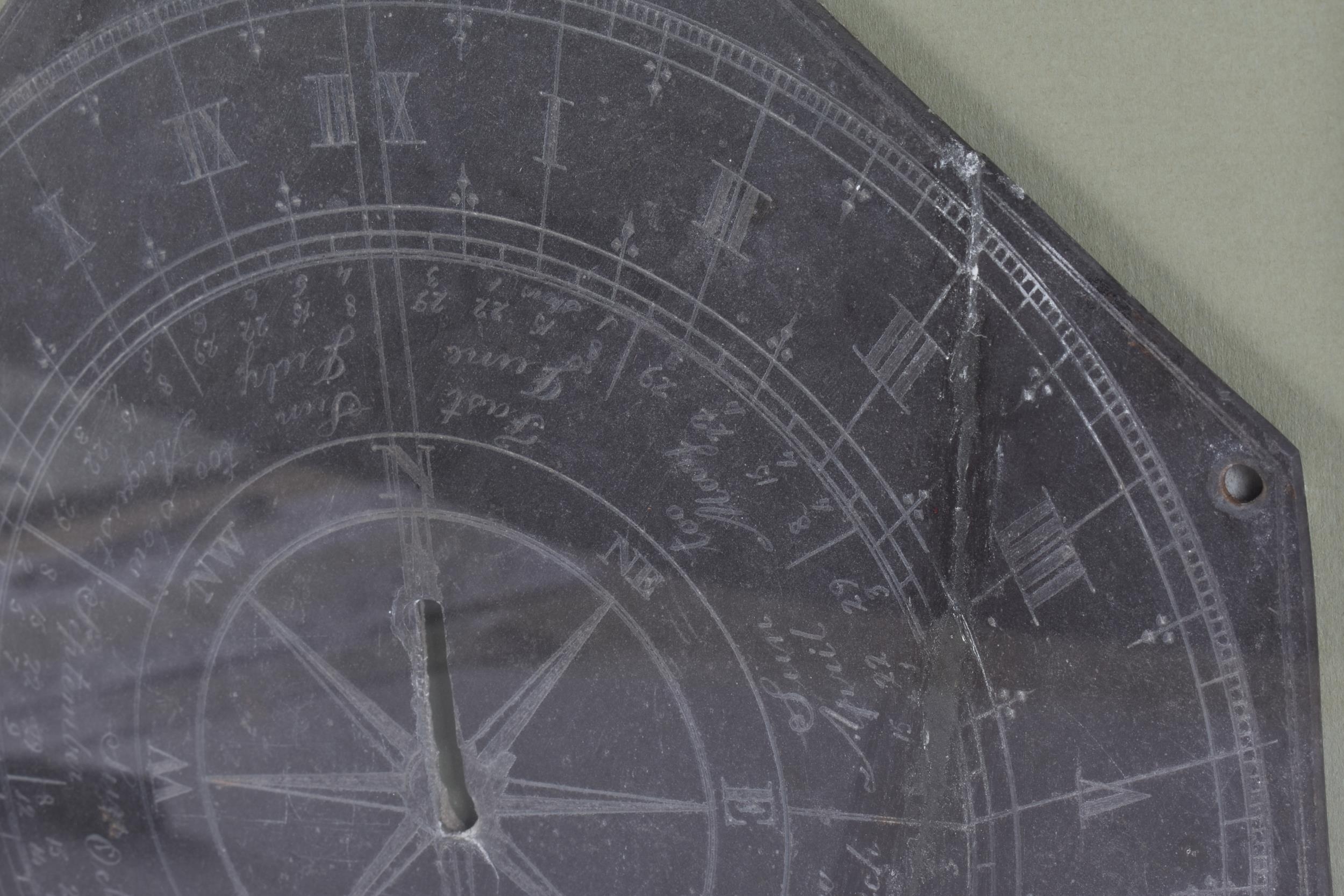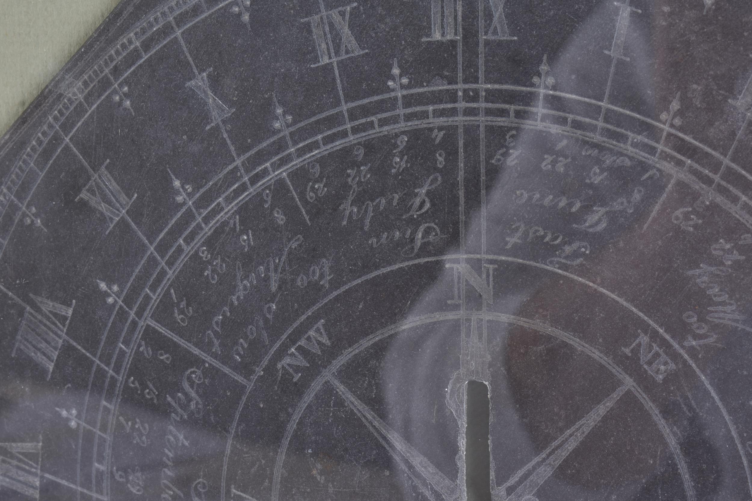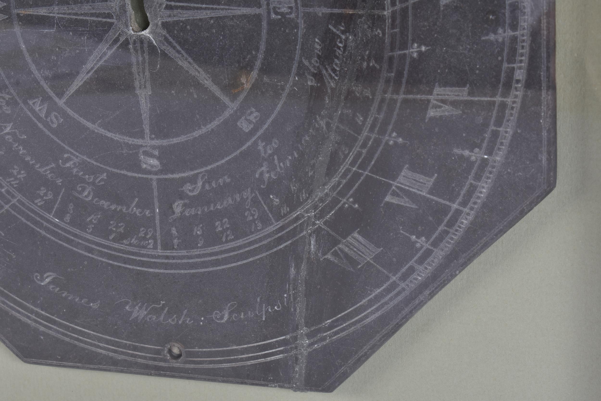 A FRAMED GEORGE III JAMES WALSH SLATE SUNDIAL. 38 cm square, slate 25.5 cm wide.