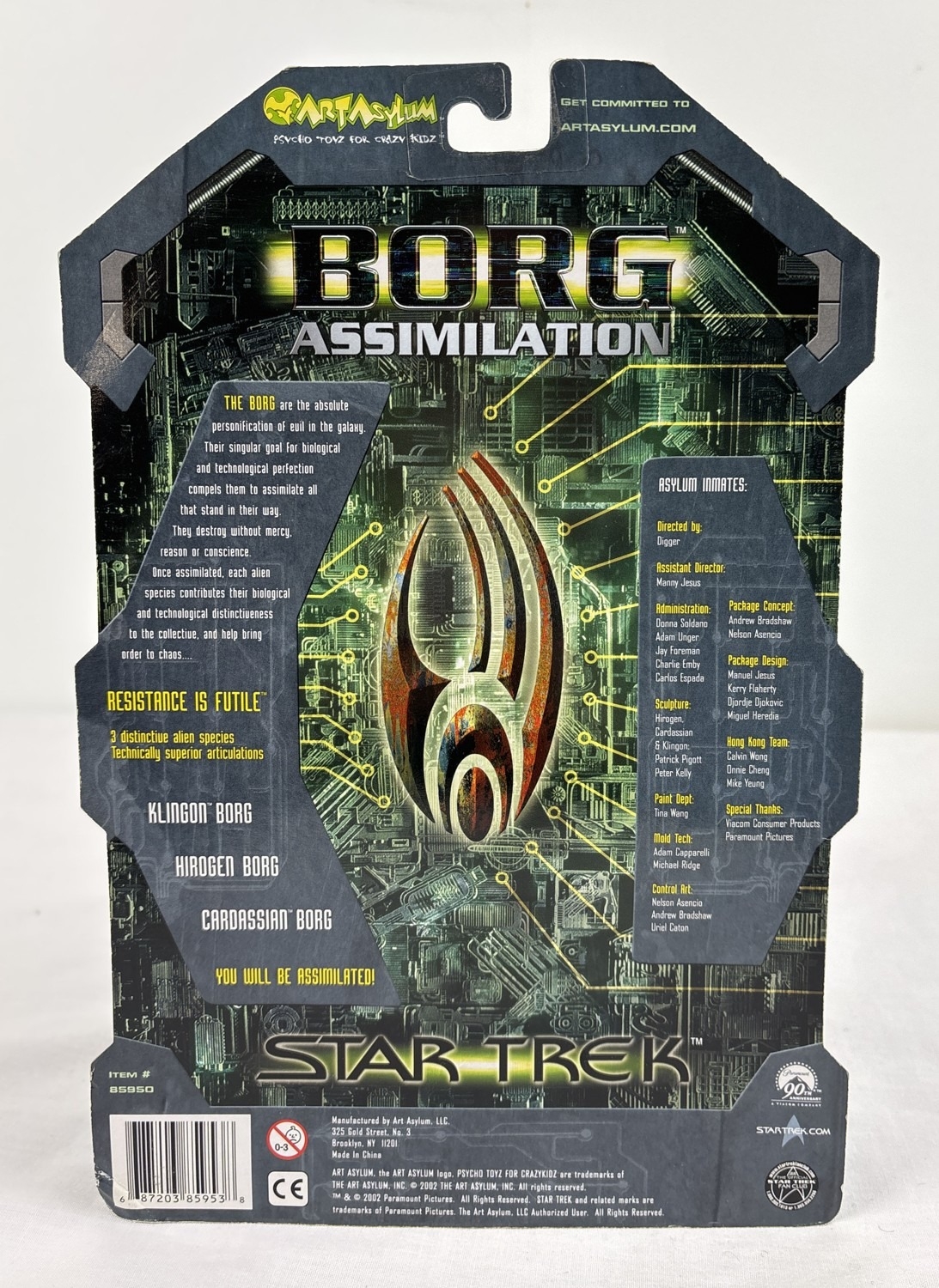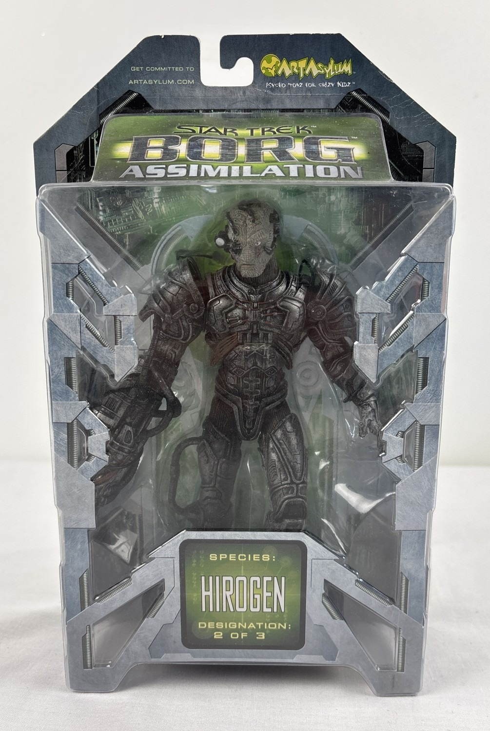Star Trek Borg Assimilation 8" figure Hirogen #85950, from Art Asylum 2002, in sealed blister pack. One of a set of 3 figures made. Comes with display stand and collectable token.
