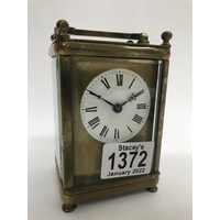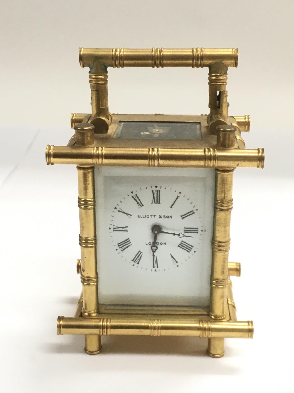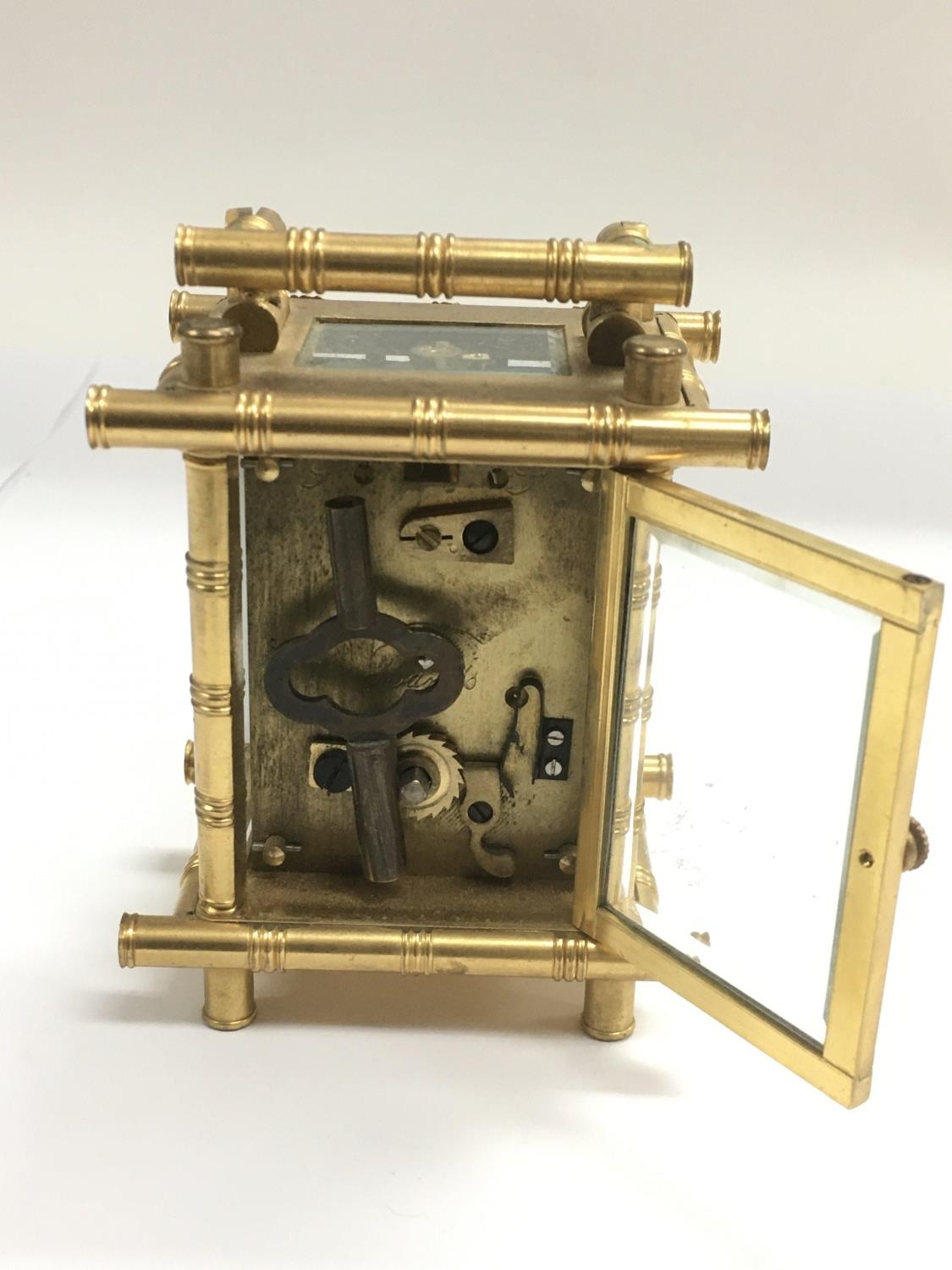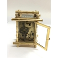 A small brass carriage clock with bamboo style decoration, approx height 11cm.
