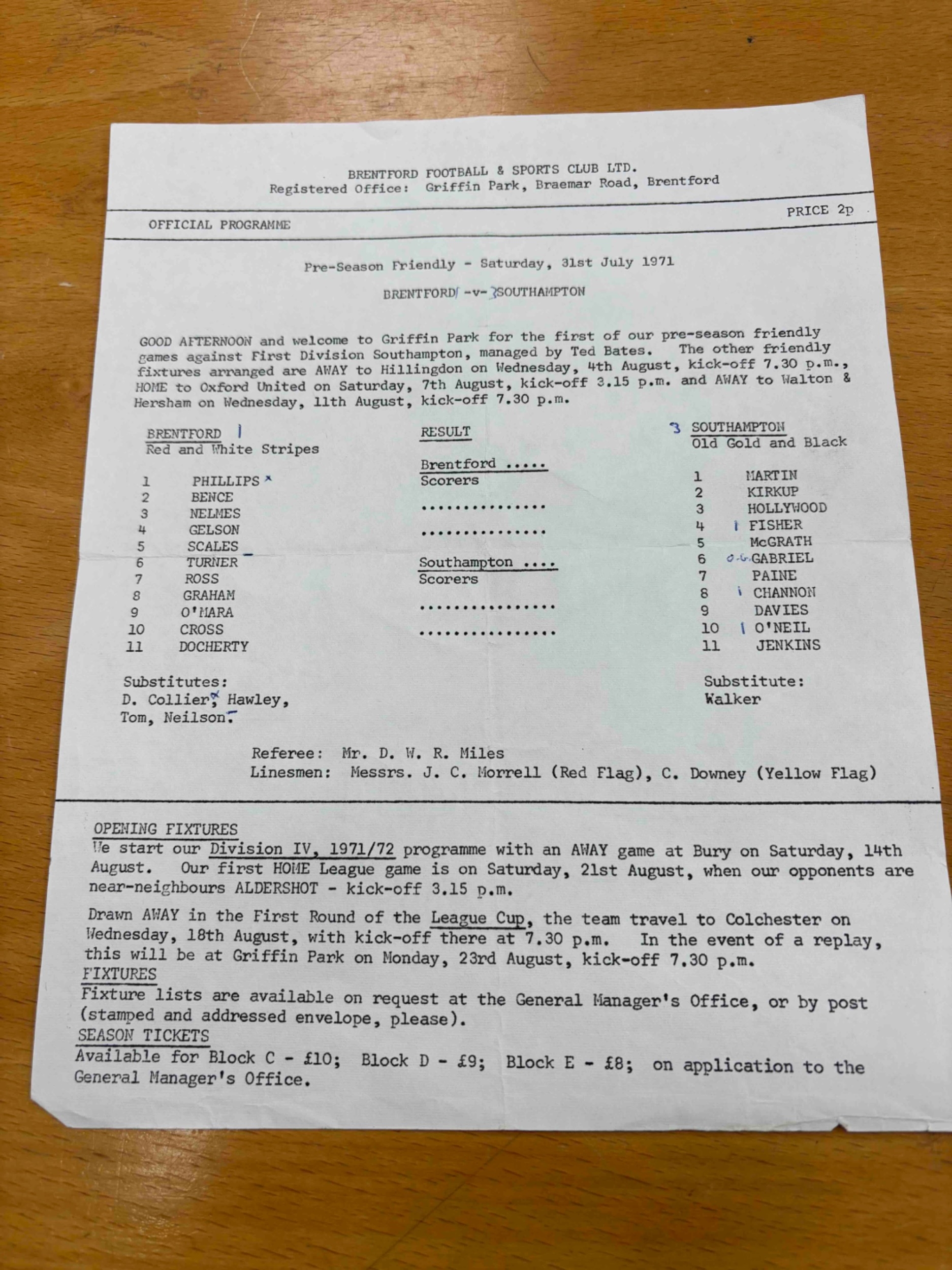1971 Brentford v Southampton, friendly. S/S