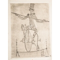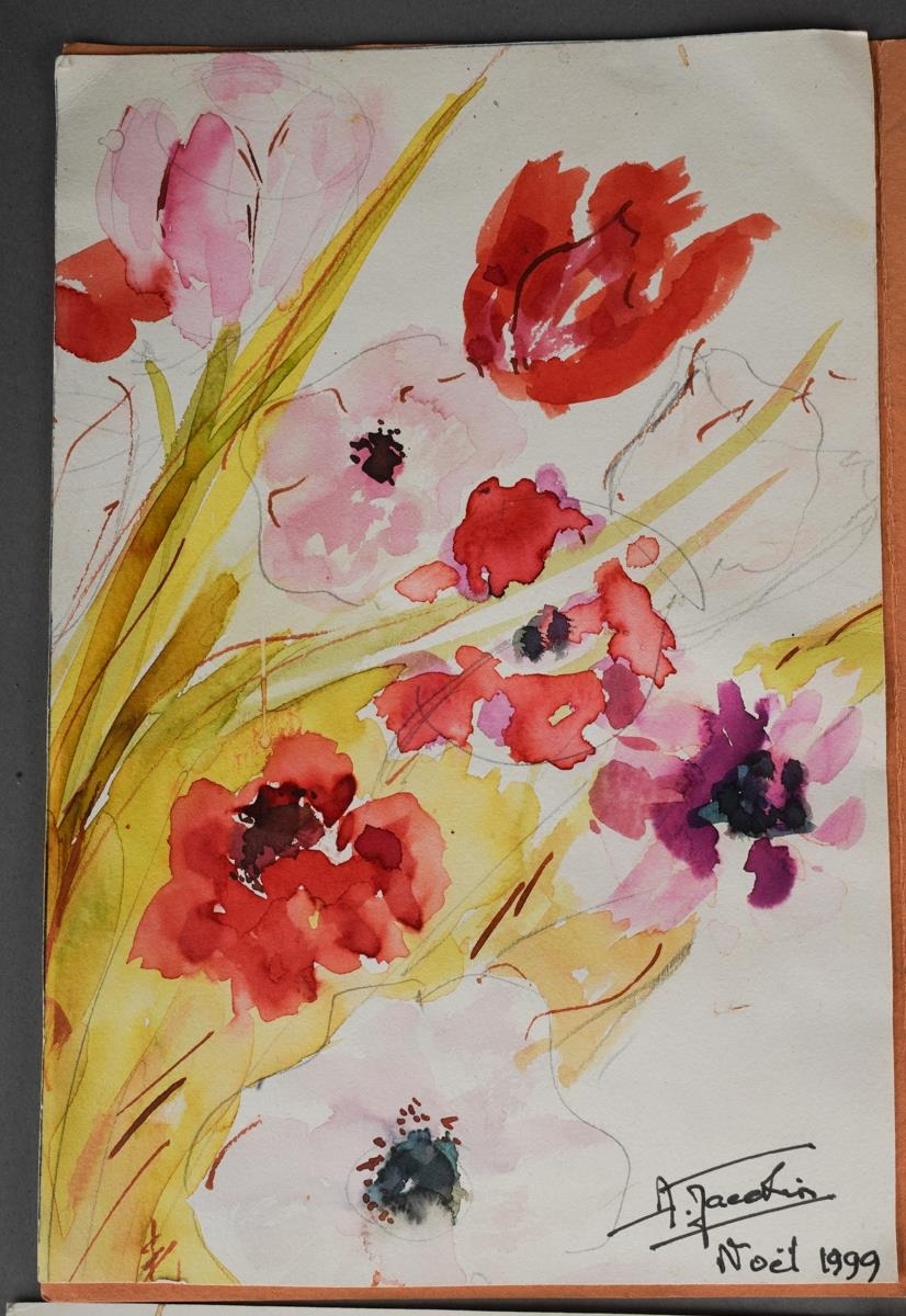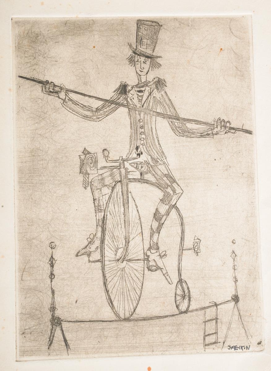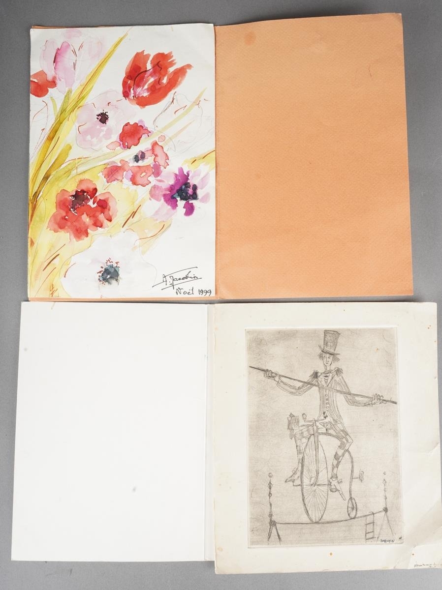 Two original drawings, one watercolour of flowers, signed A. Jaeckin Noel 1999 and other pencil sketch of a man on a penny farthing balancing on a tightrope. Signed Jaeckin. Both believed to have been done by Just Jaeckin director of Emmanuelle, Michael Radford, Arnaud Desplechin, Claude Pinoteau, Emir Kusturika, Alexandre Aja and Etienne Chatilliez - the vendors family and Jaeckin family where family friends for many years. Inspection advised.