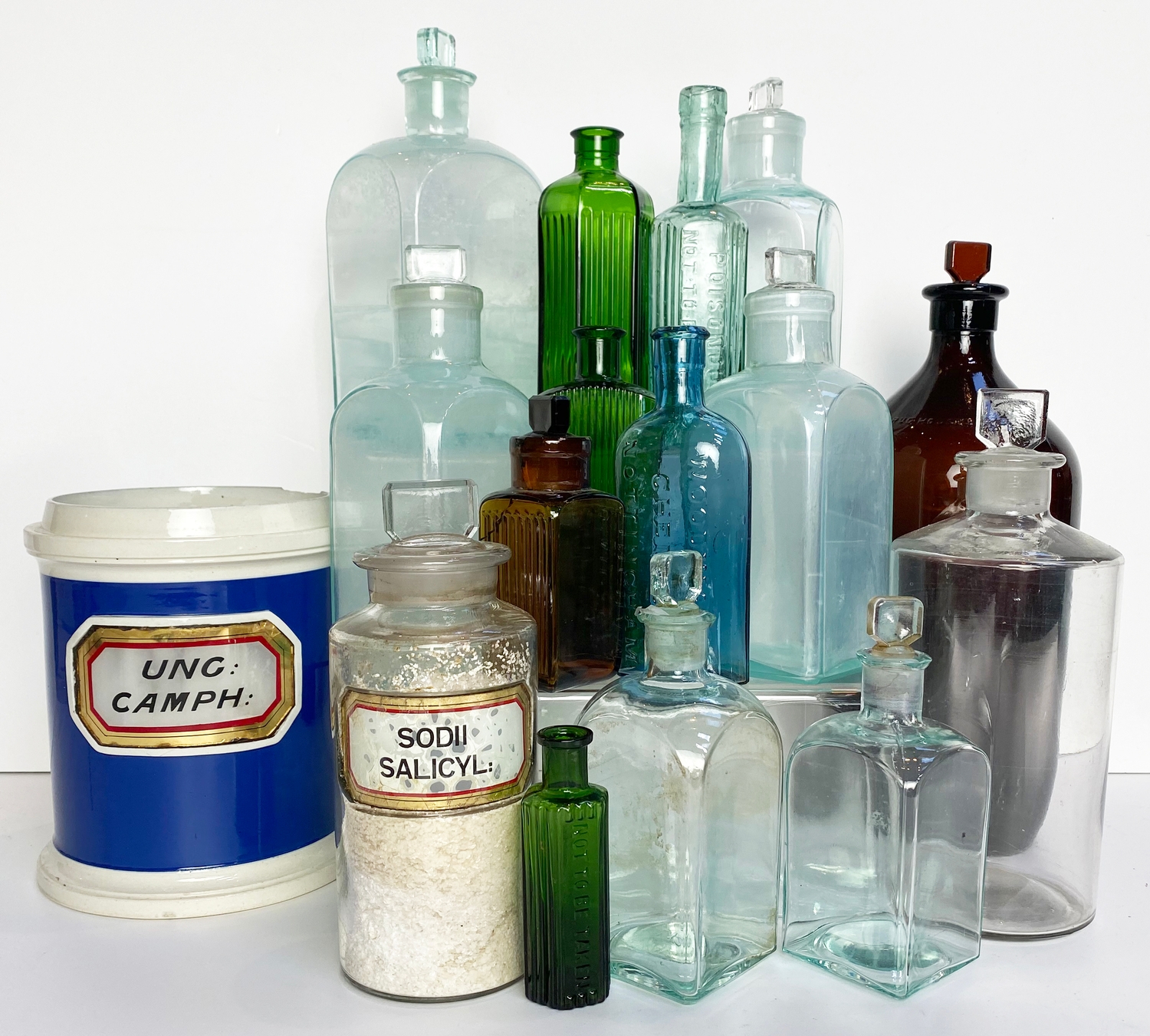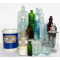 MIXED GLASS GROUP. Tallest 12ins. Brown, green, blue & clear glass Inc. Chemist rounds label under glass, embossed bottles & poisons. Damages. (16)