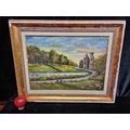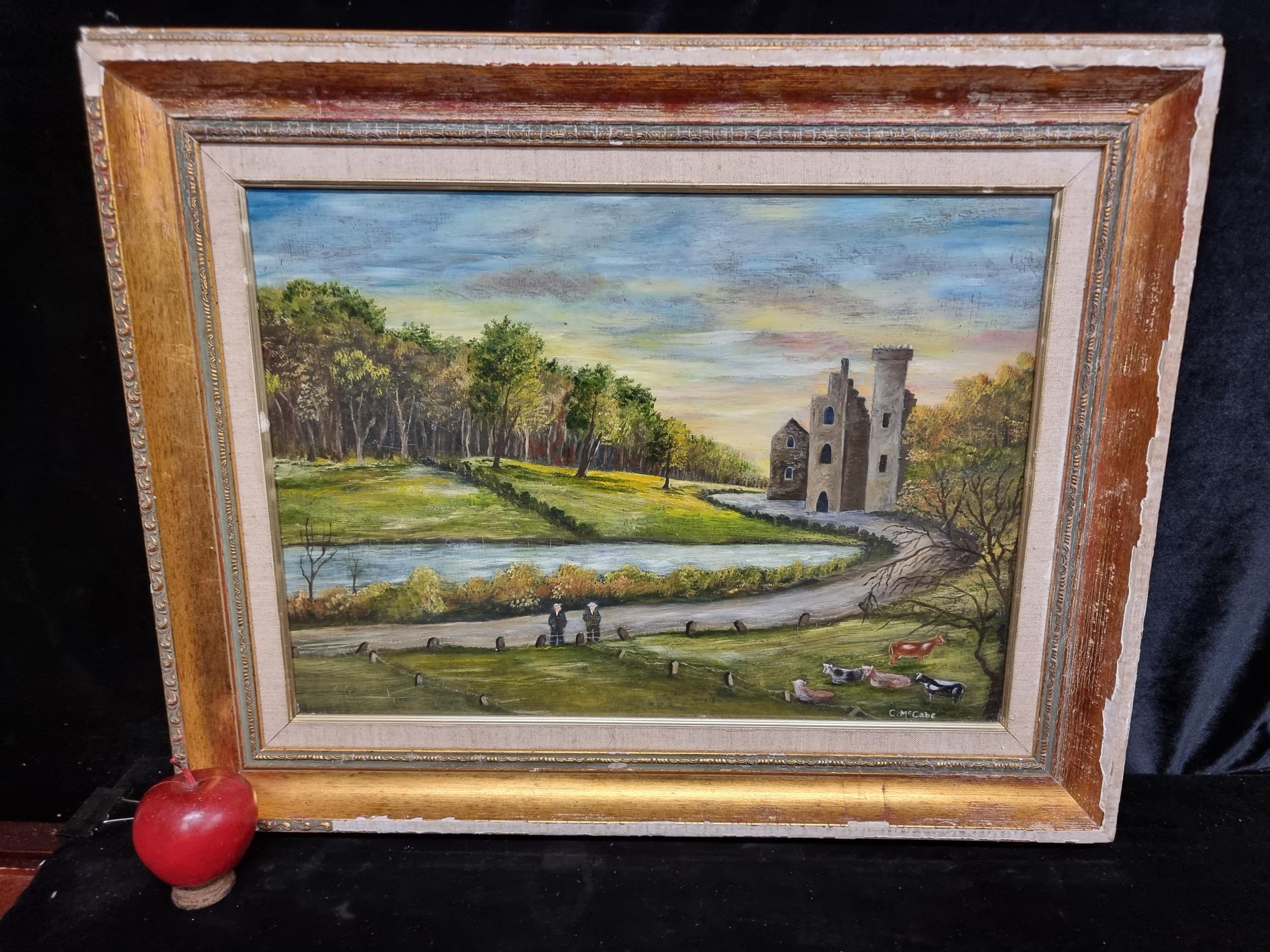 A detailed vintage original oil on board painting. Features a riverside landscape with two farmers discussing their cattle. Signed C McCabe bottom right and housed in a gilt frame.