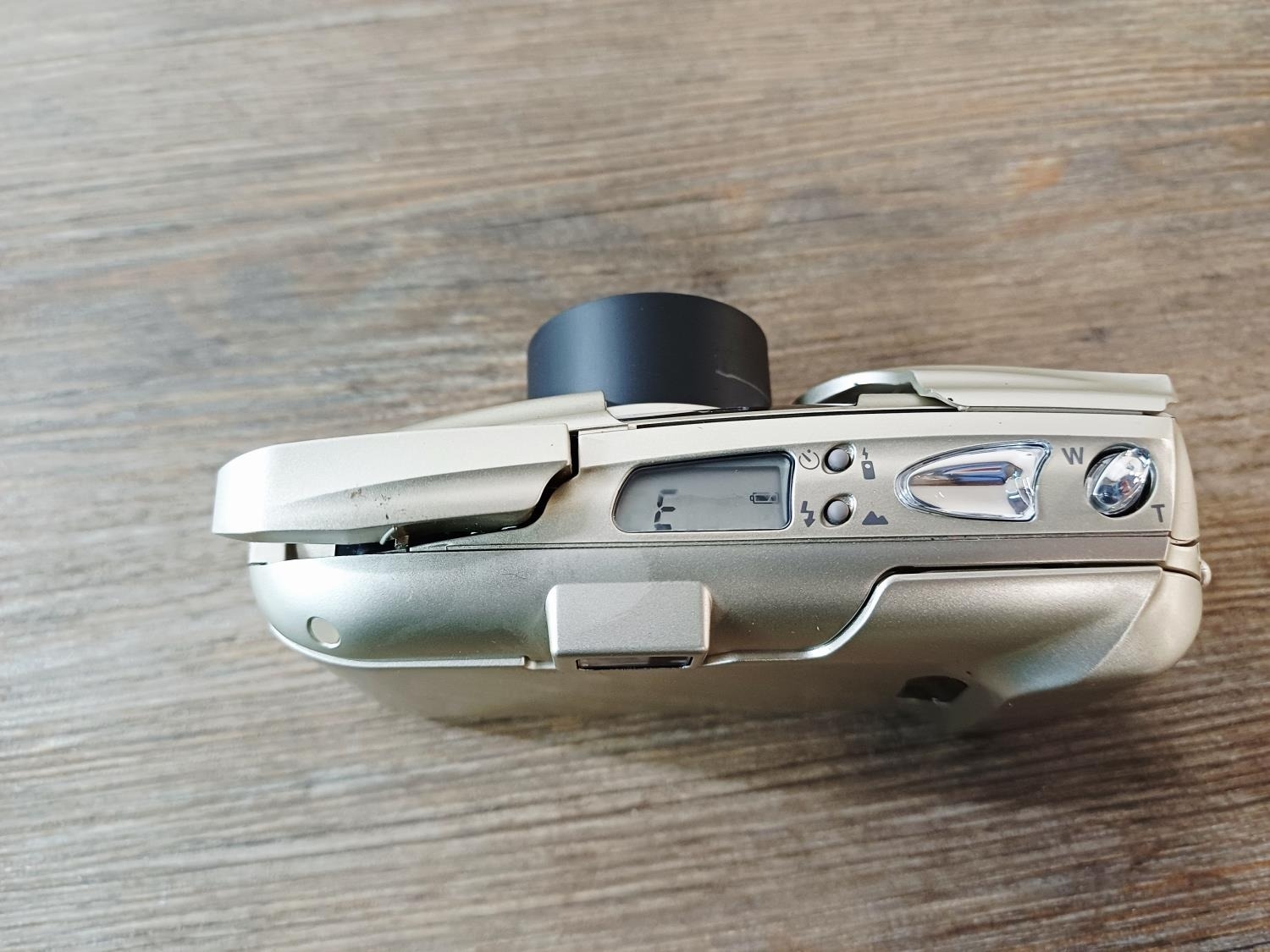 Powers up, flash rises, lens extends, flash fires, battery not included.