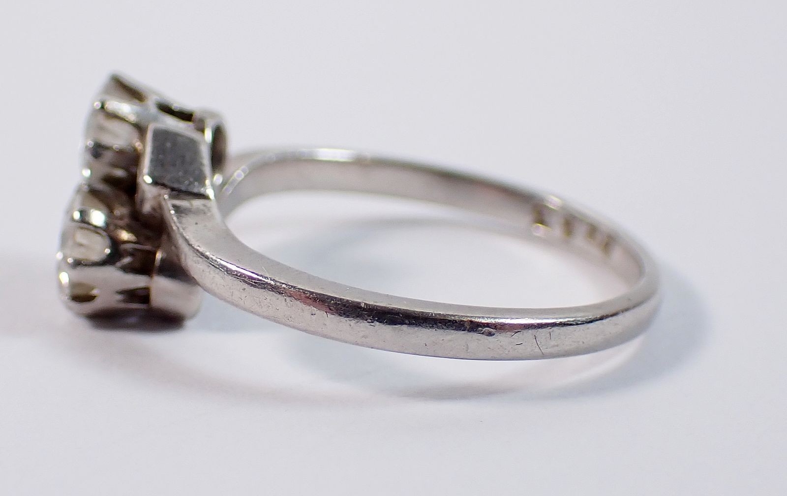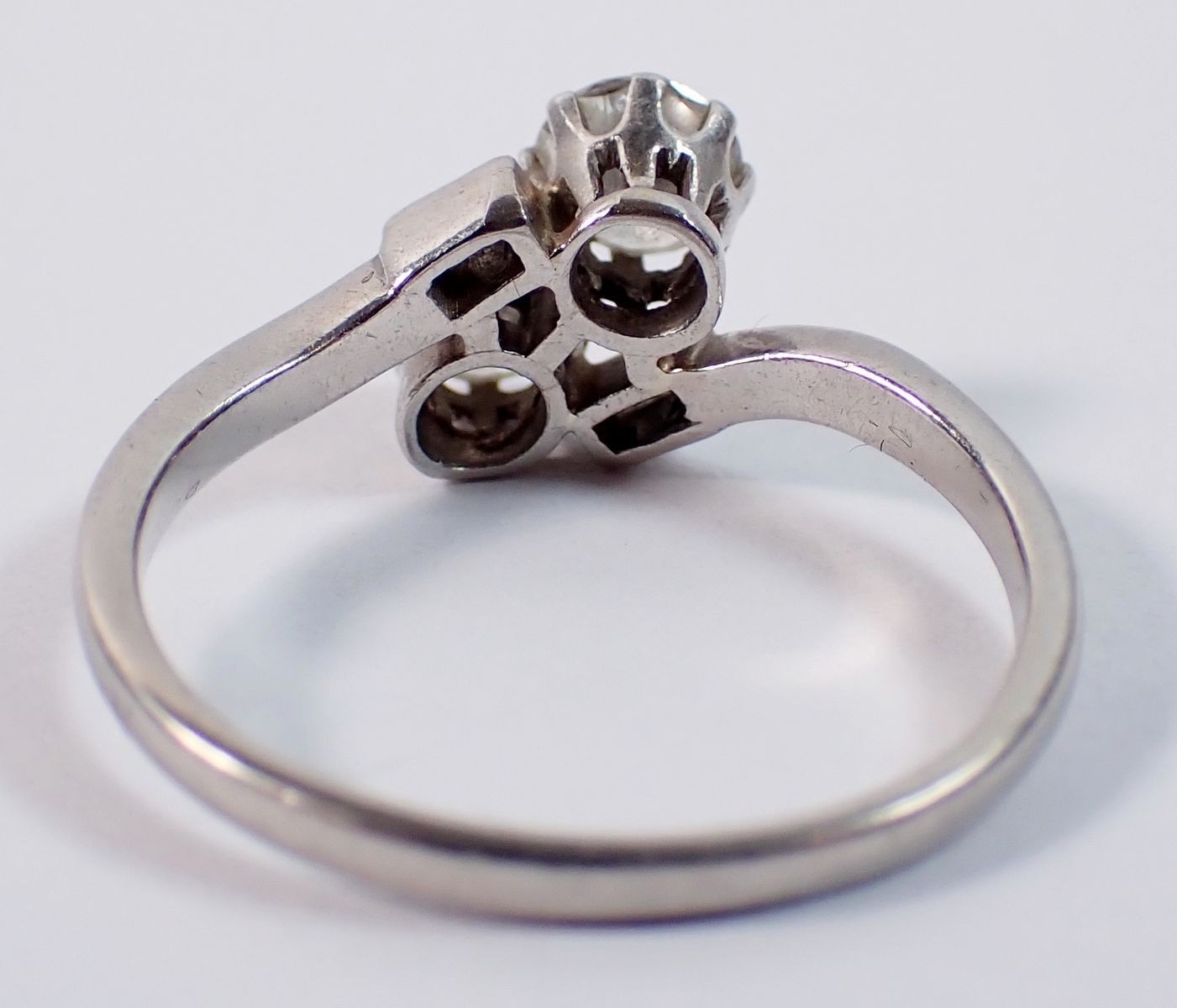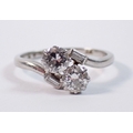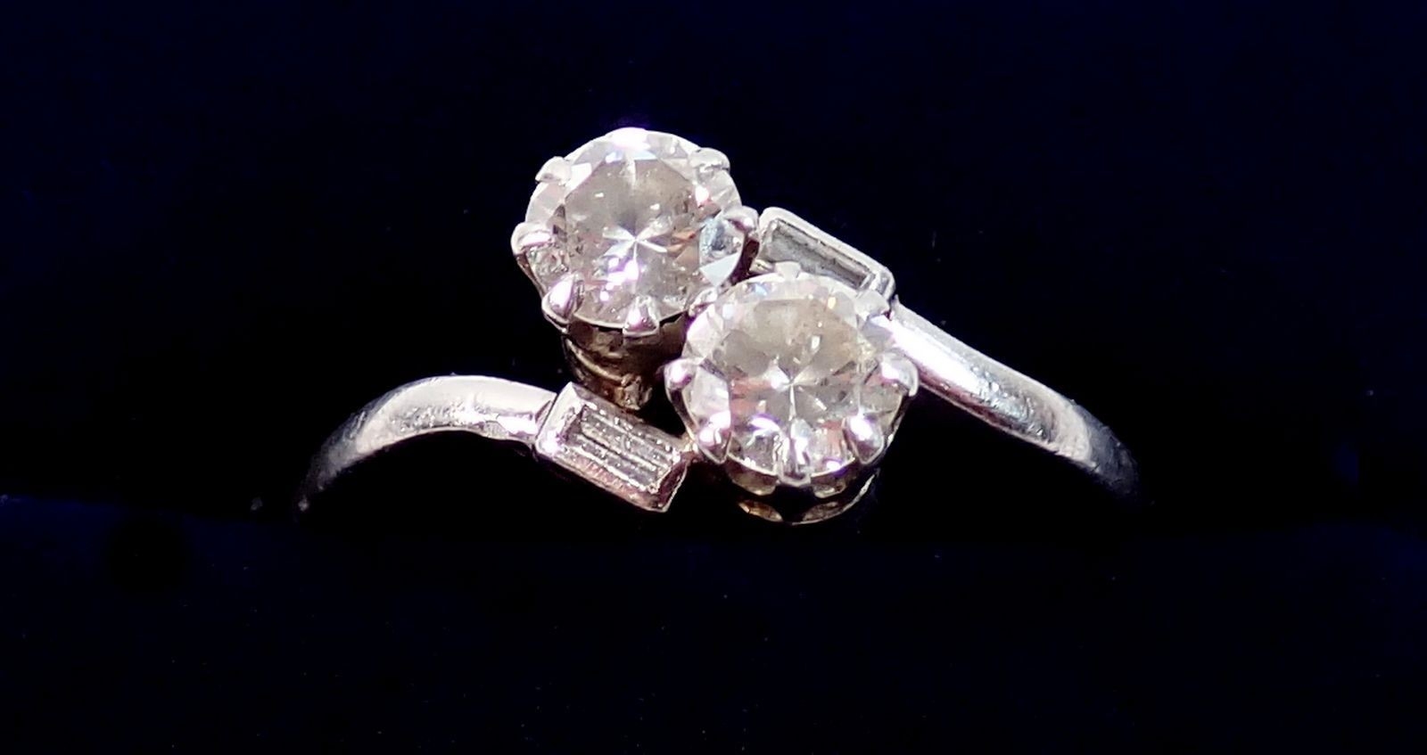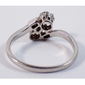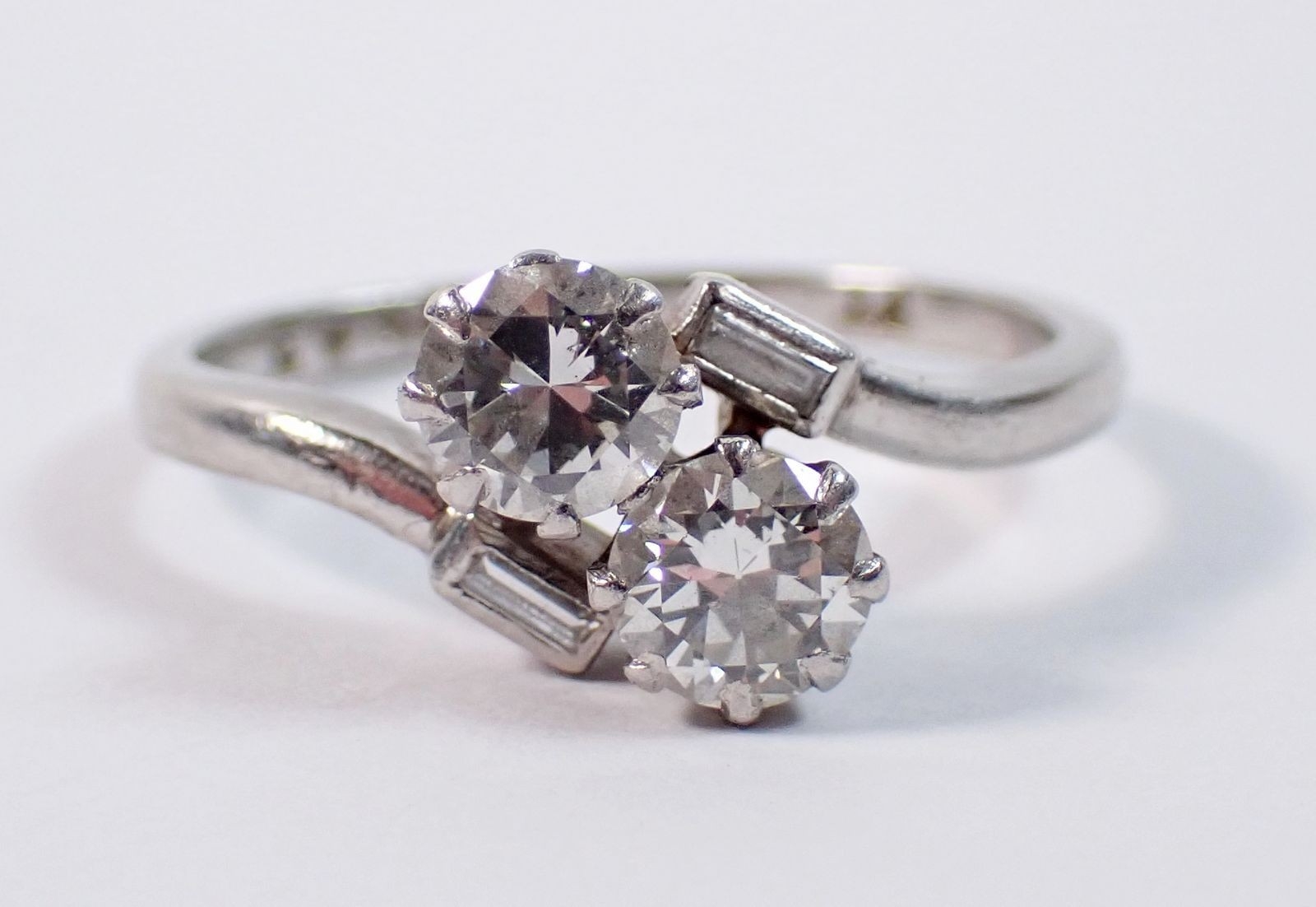 A platinum ring crossover set two brilliant cut diamonds flanked by two baguette cut diamonds, size M, 3.8g