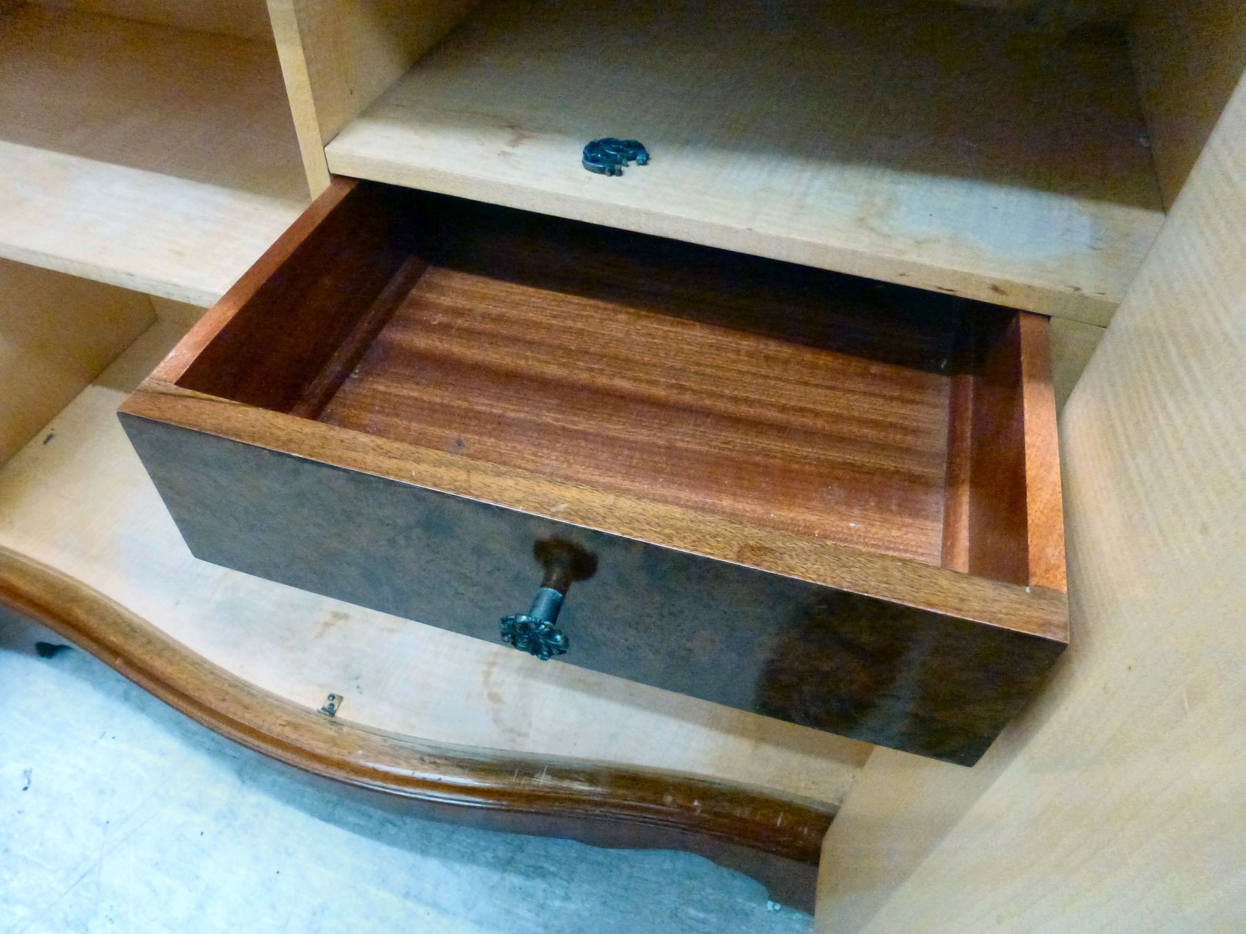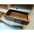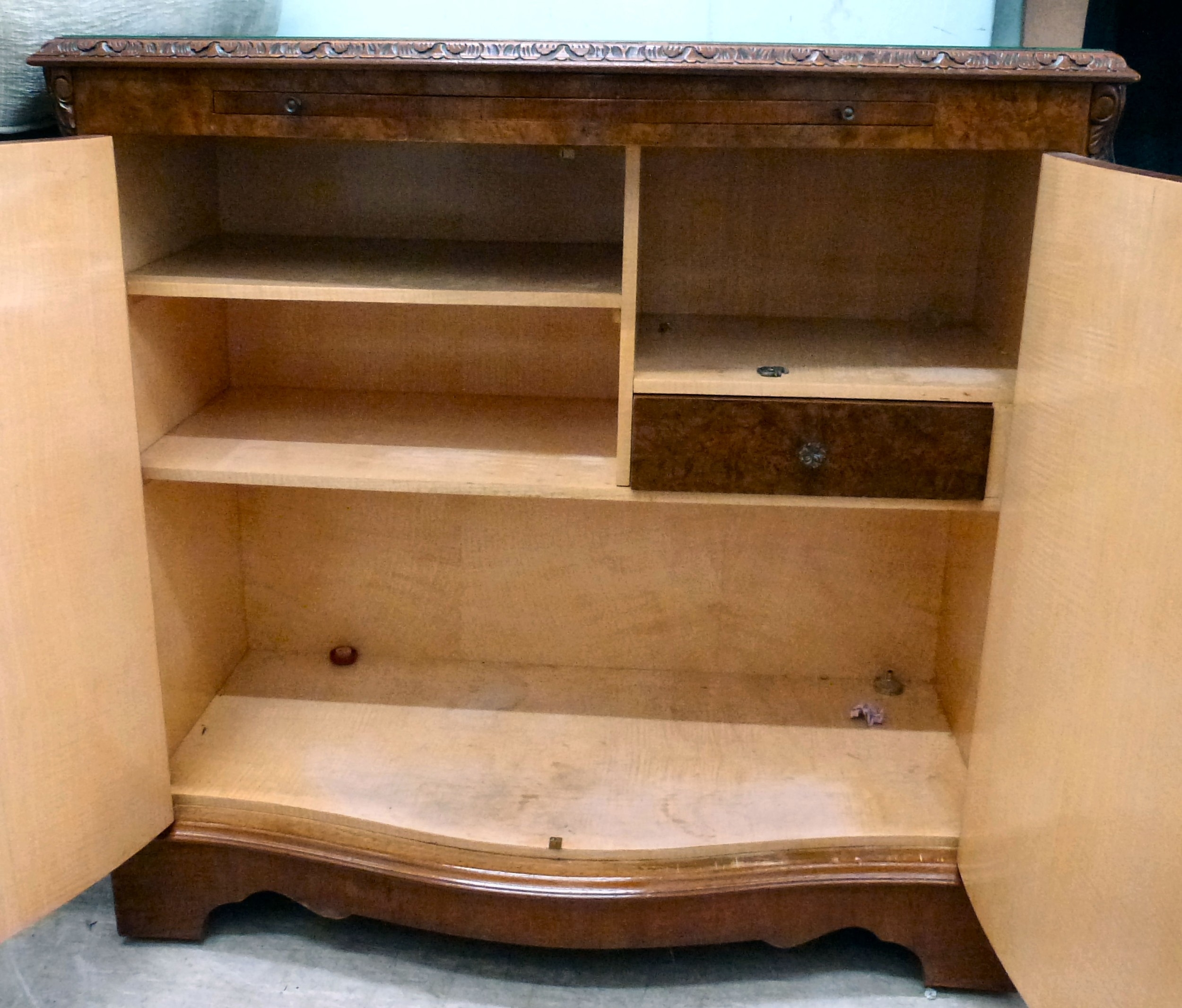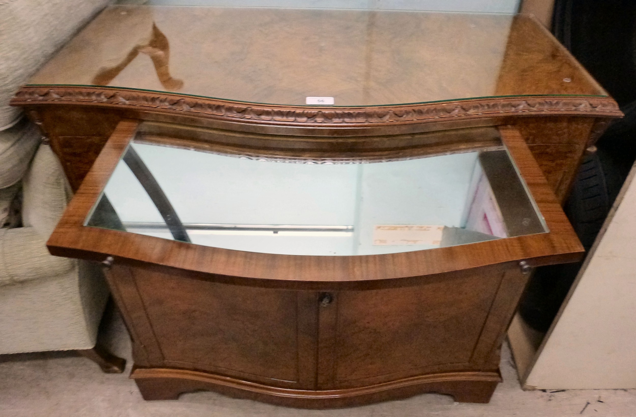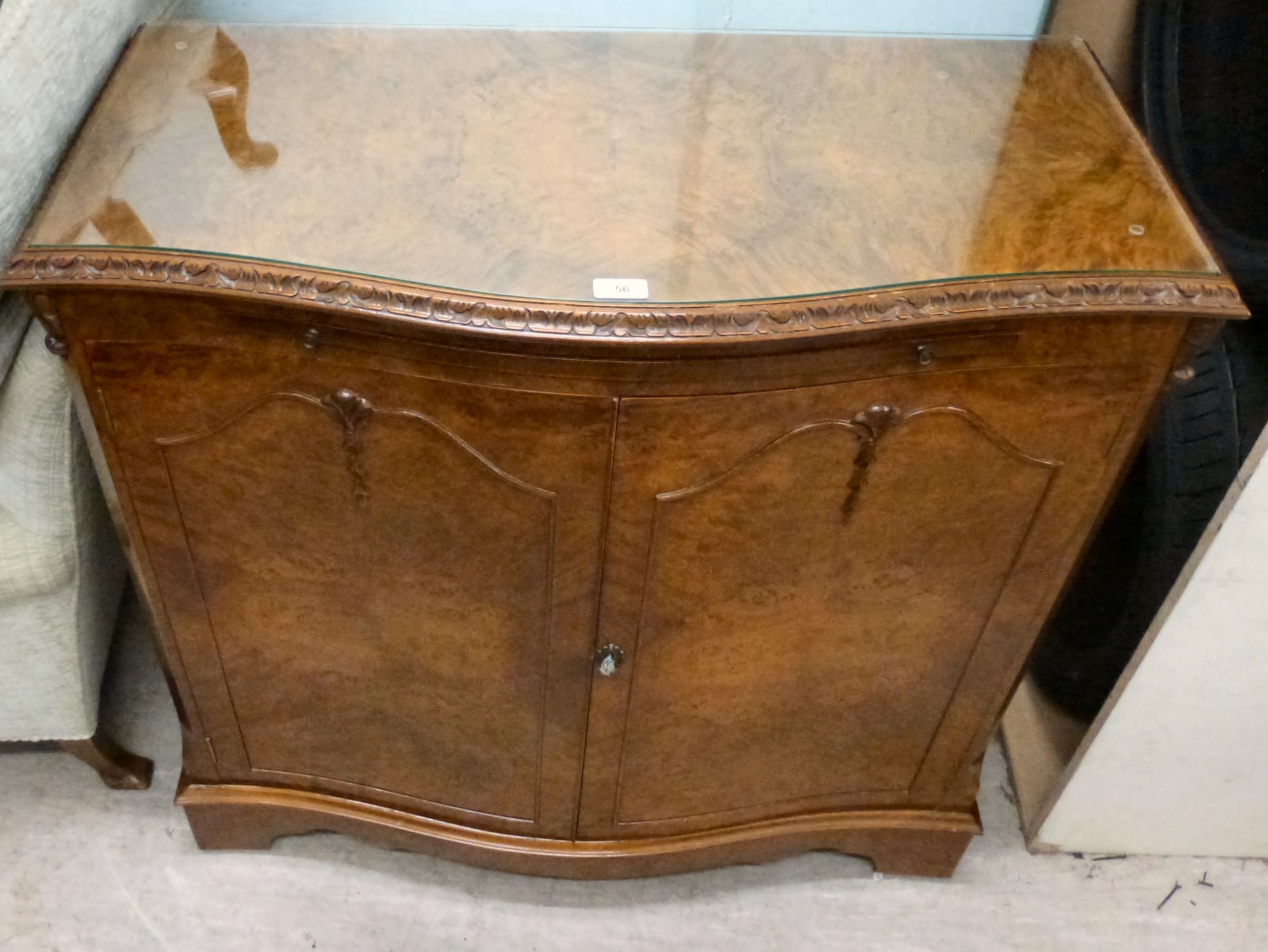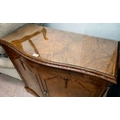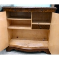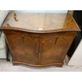 A modern walnut finished serpentine front side cabinet with two doors, raised on bracket feet 37"h 36"w
