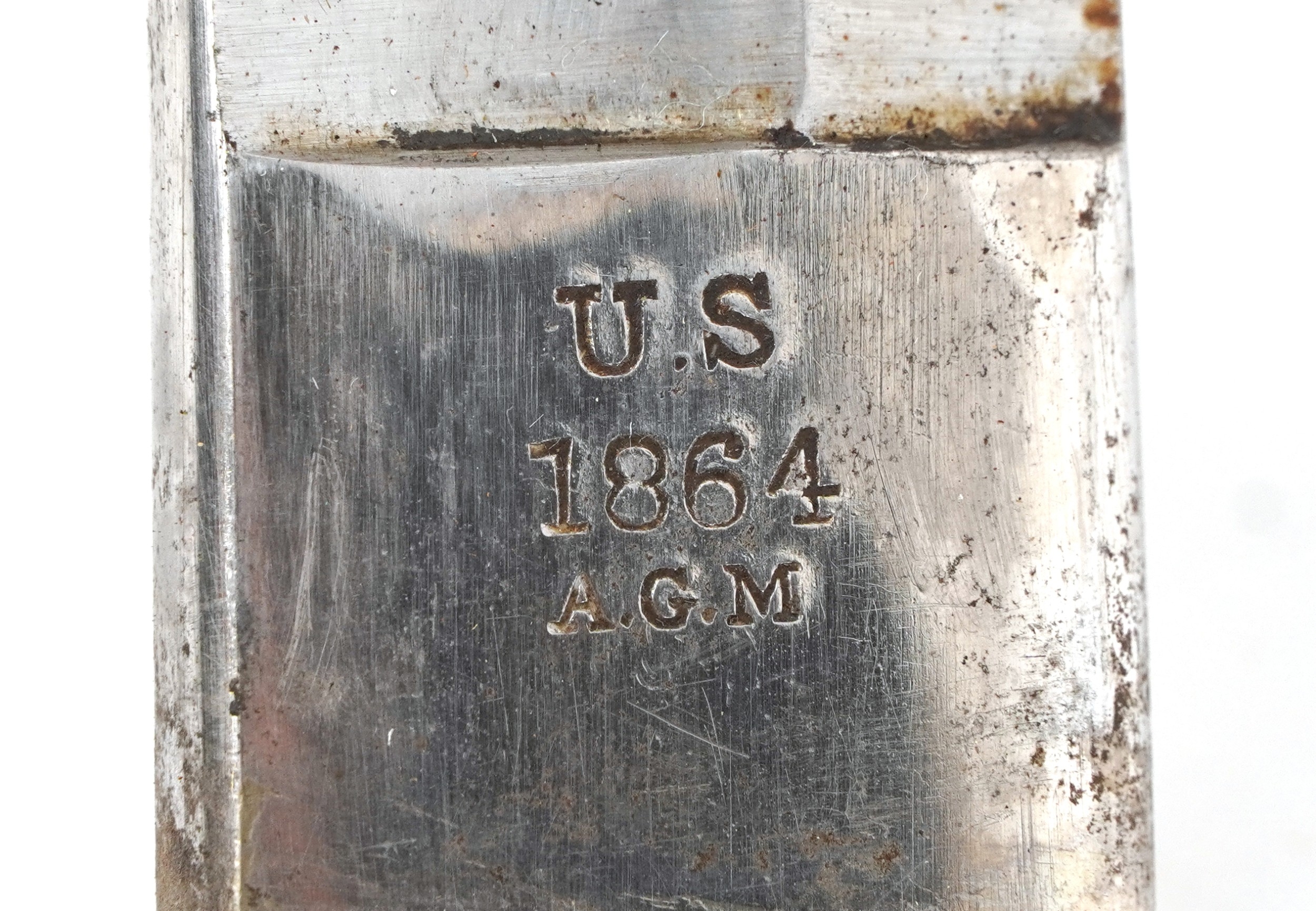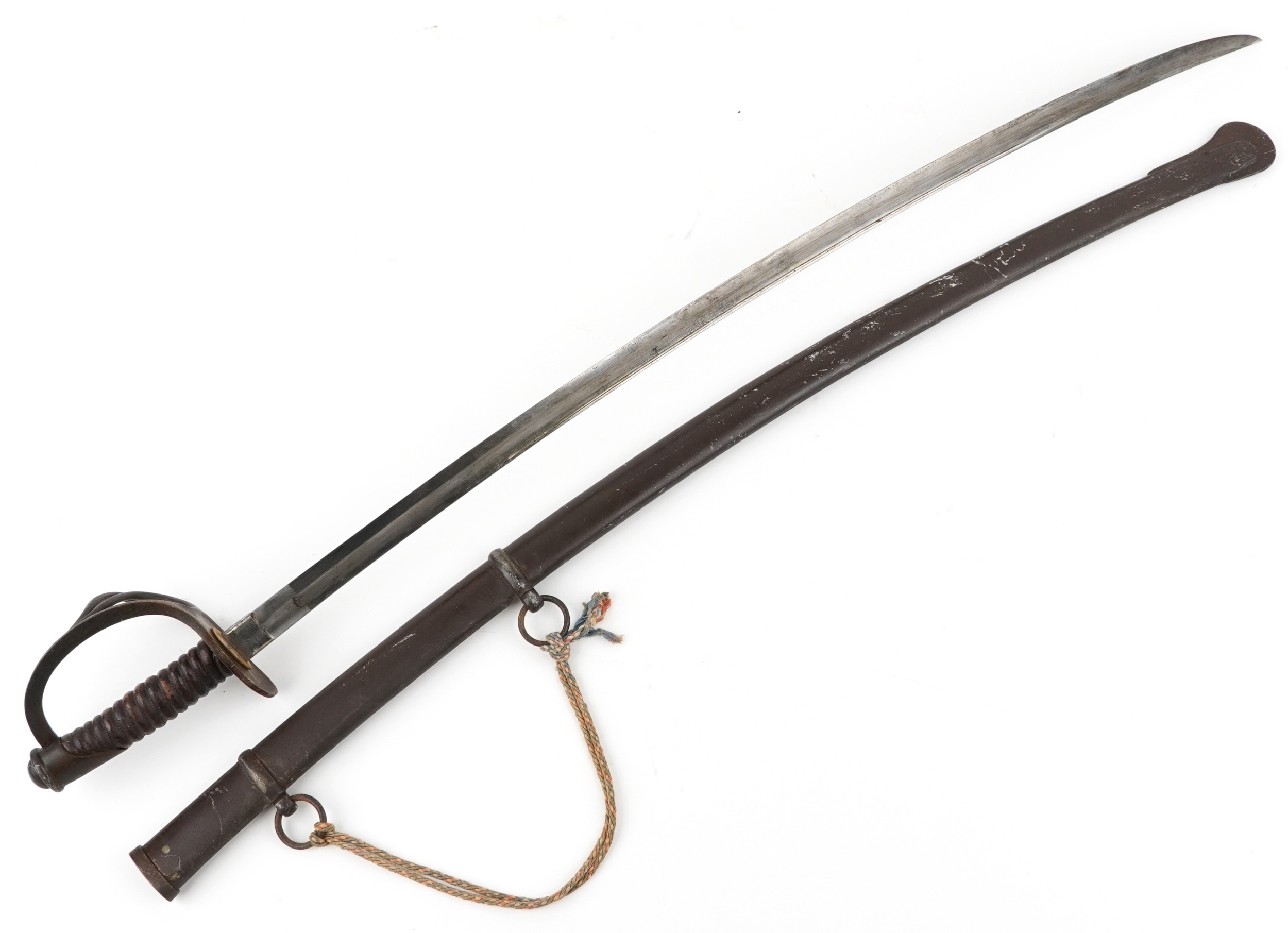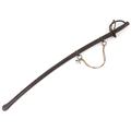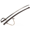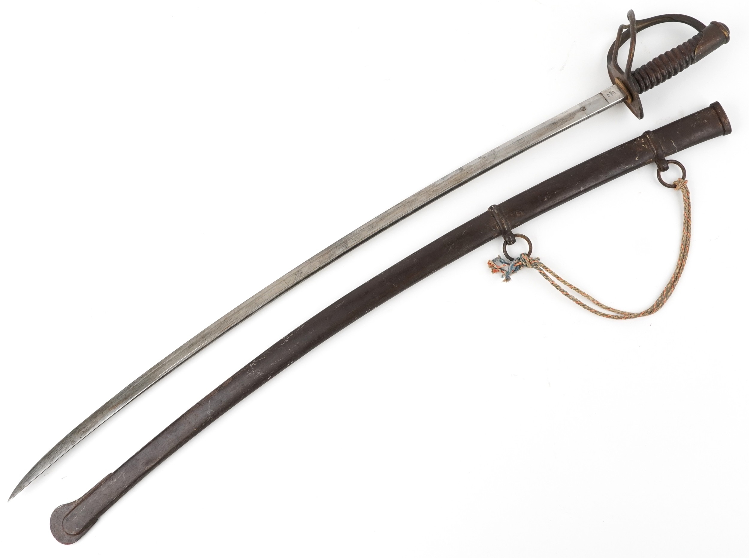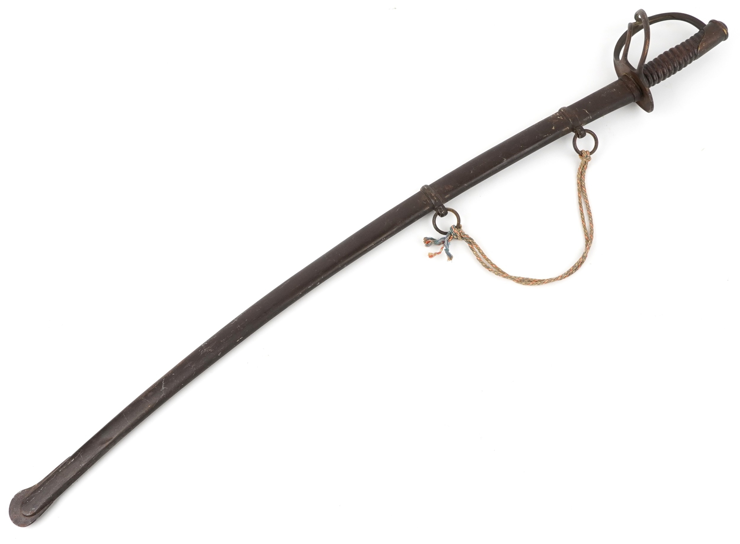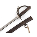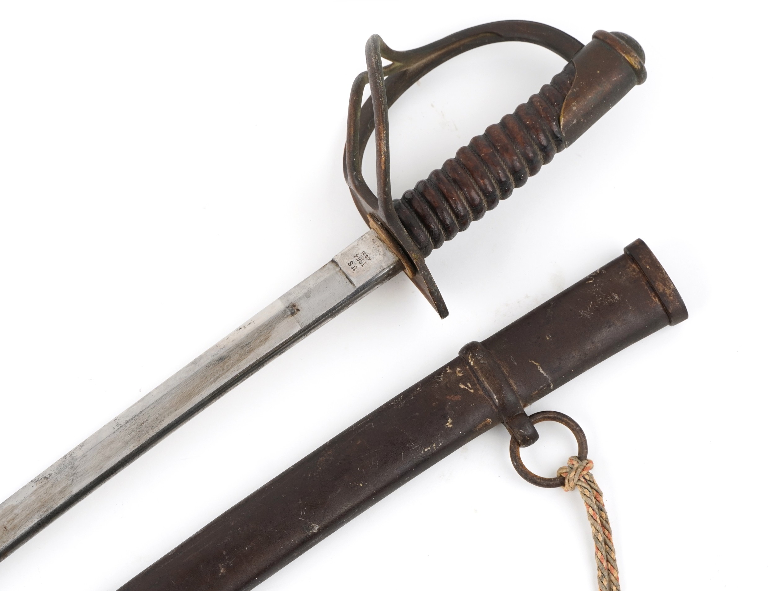 An American military interest Civil War steel bladed sword and scabbard with turned wooden grip, the blade impressed US 1864 AGM W Chelmsford, 110cm in length.