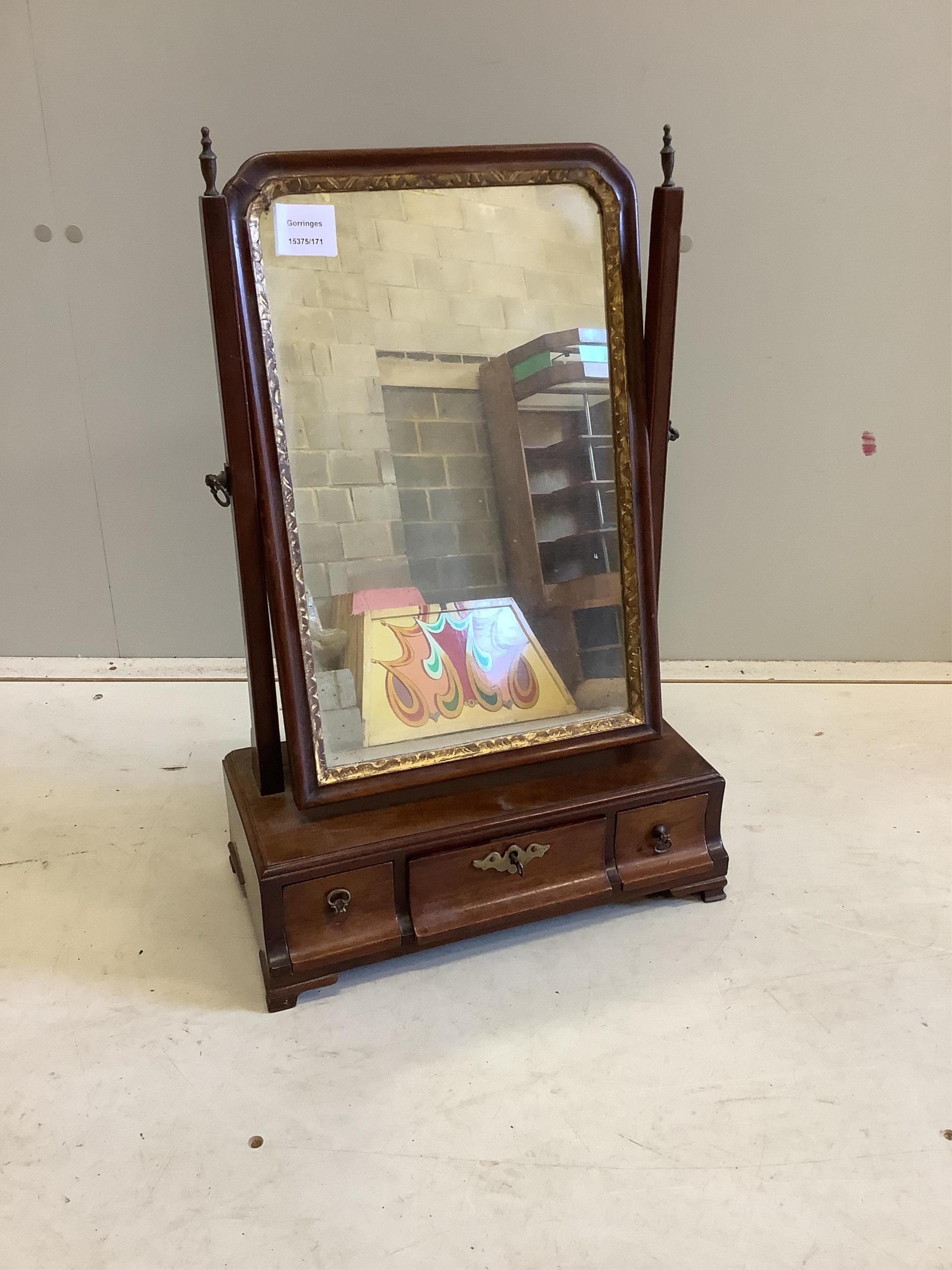 A George III mahogany toilet mirror, width 37cm, depth 19cm, height 57cm. Condition - fair