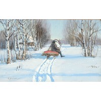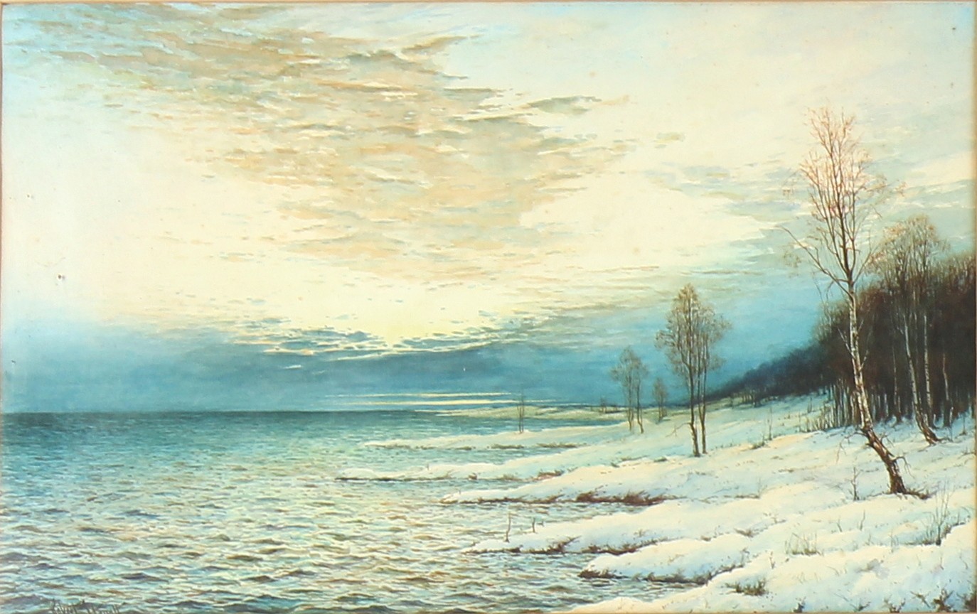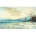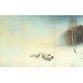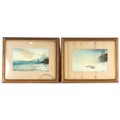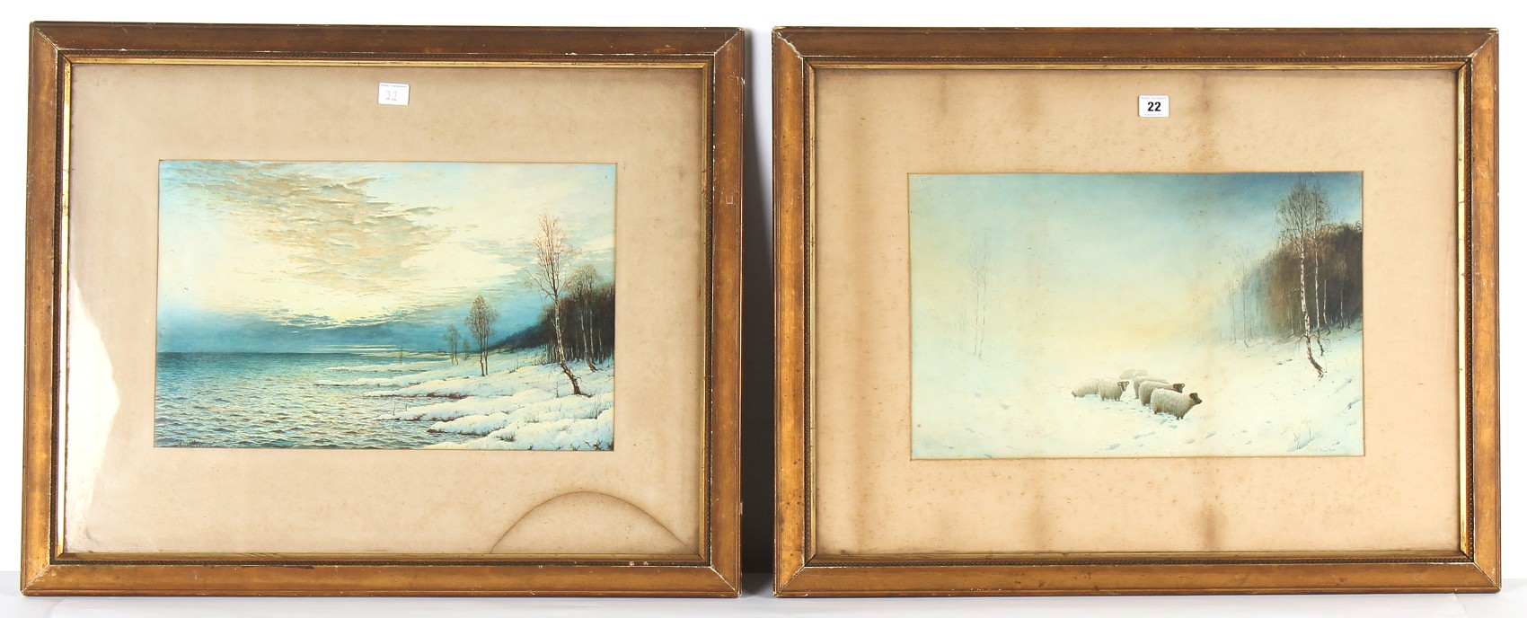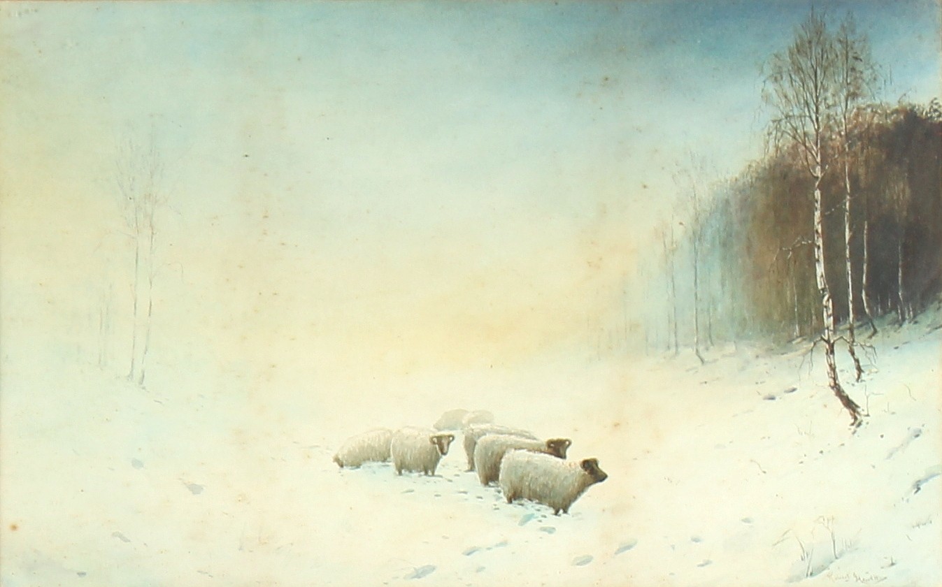 Property of a lady - Robert J Hewitt (1897-1977) - SHEEP IN SNOW and LOCH EDGE IN WINTER - a pair, watercolours, 19 by 12ins. (48.3 by 30.5cms.), in matching glazed gilt frames (one glass cracked) - both signed (2).