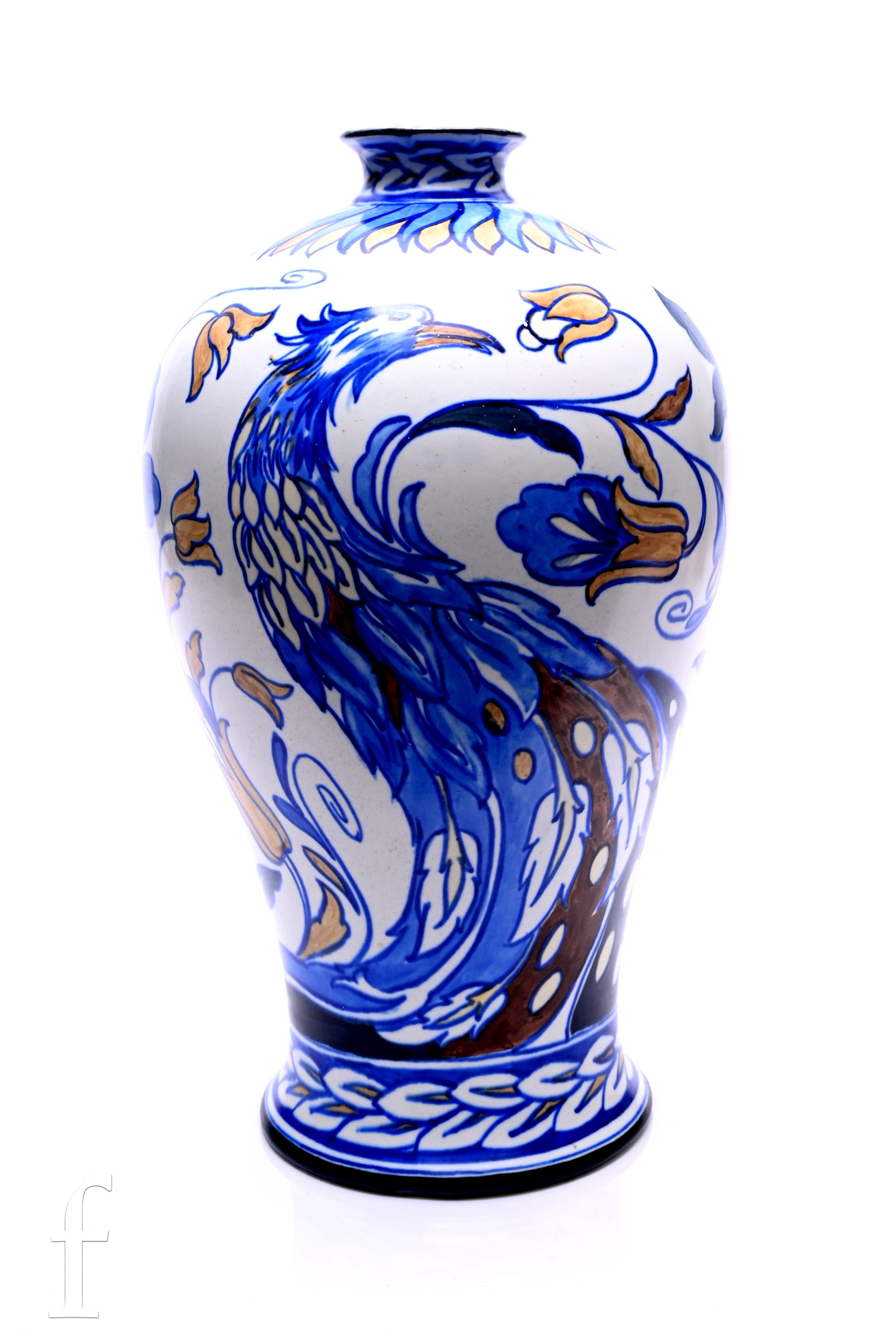An early 20th Century large Wardle Pottery vase designed by Frederick Rhead, the footed baluster form with narrow collar neck, decorated in the Indus pattern with stylised birds, flowers and foliage in tonal blue and ochre to a white glazed ground, incised and printed marks, height 35cm, slight damage.