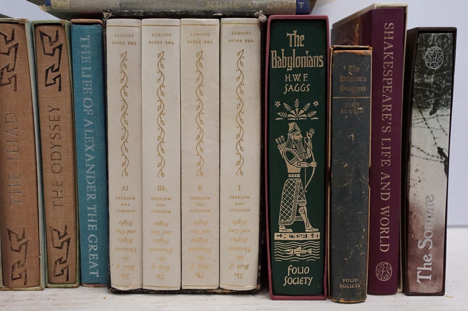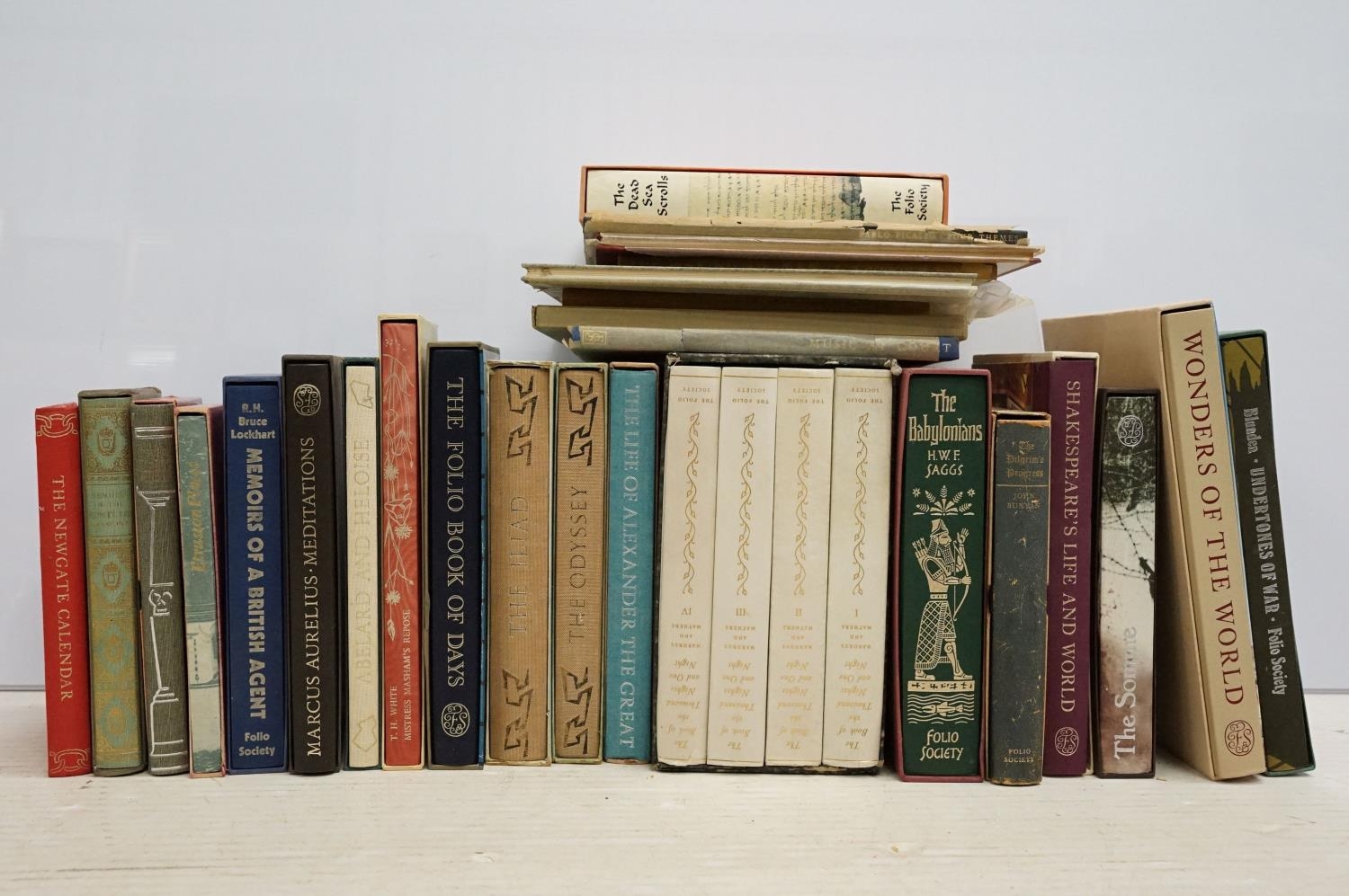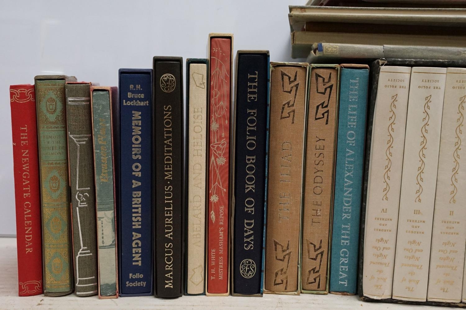 Books - A Collection of around 25 The Folio Society hardback books, many contained within card sleeves, the to include Mardrus And Mathers - The Book of the Thousand Nights and One Night box set, The Folio Book of Days, The Iliad, The Odyssey, Marcus Aureliius - Meditations, T. H. White - Mistress Masham's Repose, The Newgate Calendar, etc