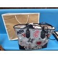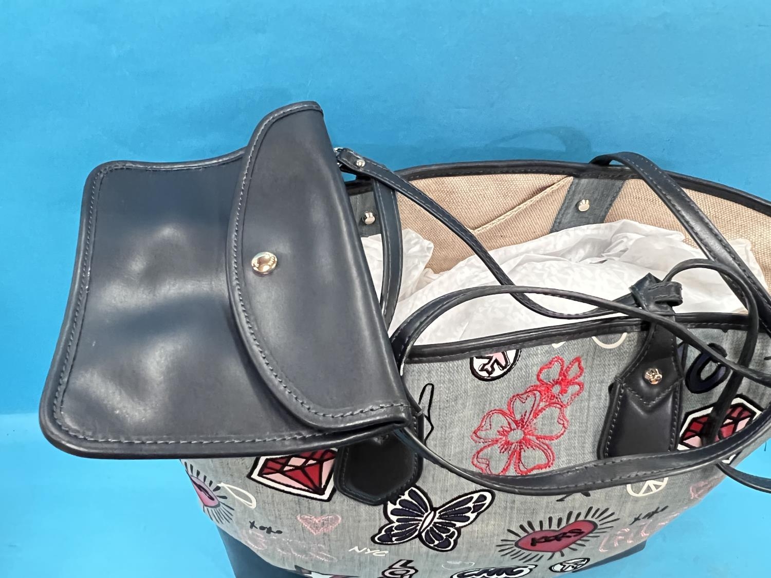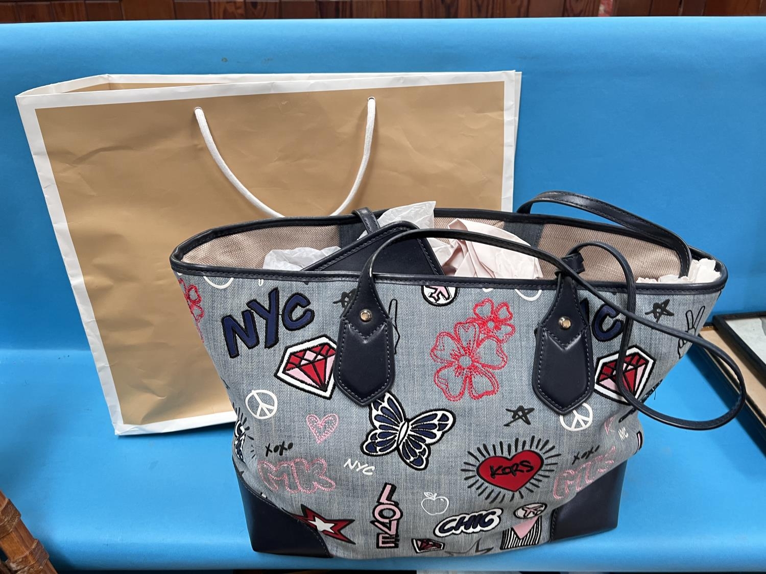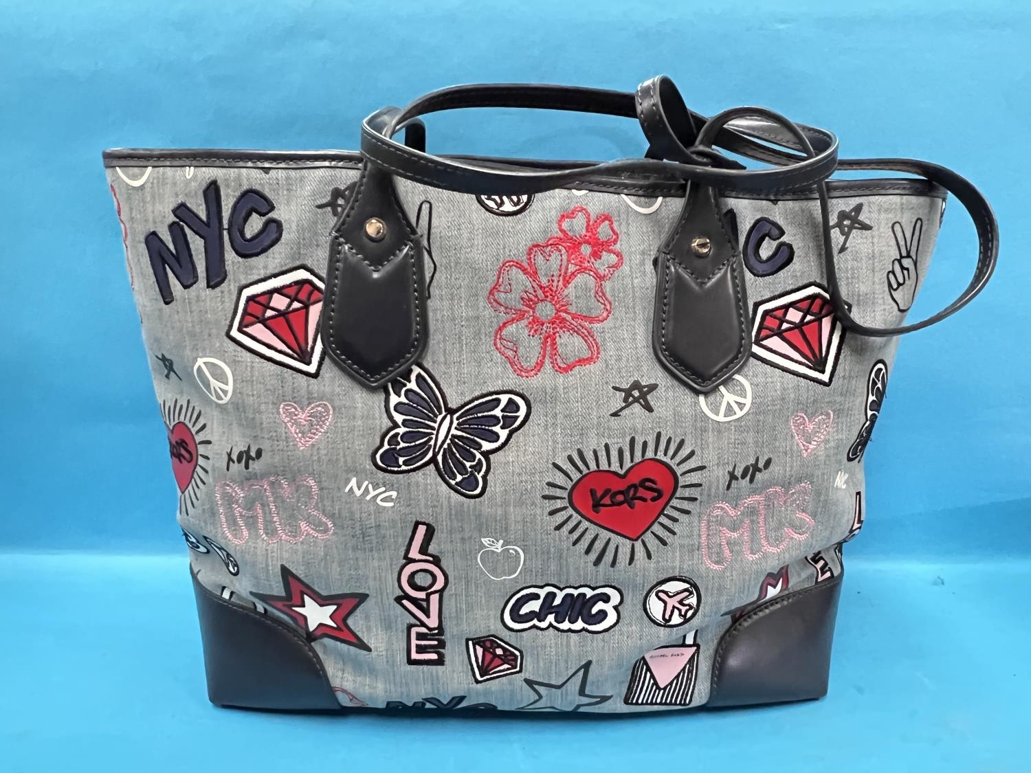 MICHAEL KORS - large blue EVA embroidered denim tote bag, interior black slip pocket, removable zip pouch with a double handle, with tags