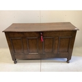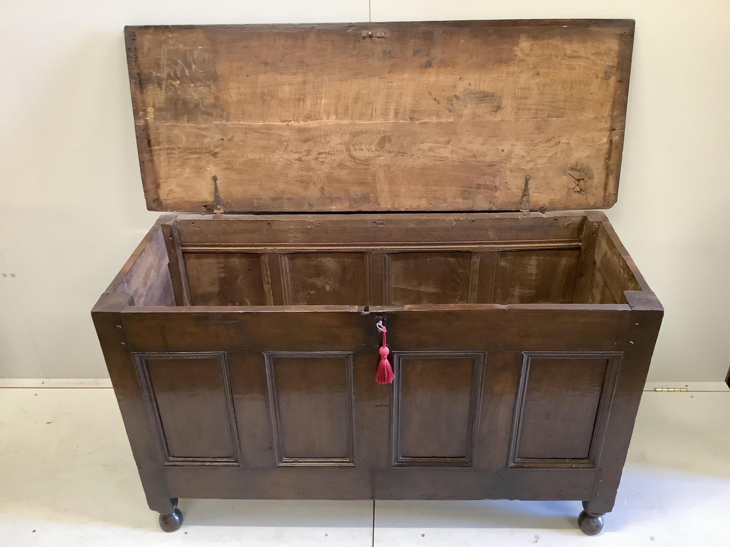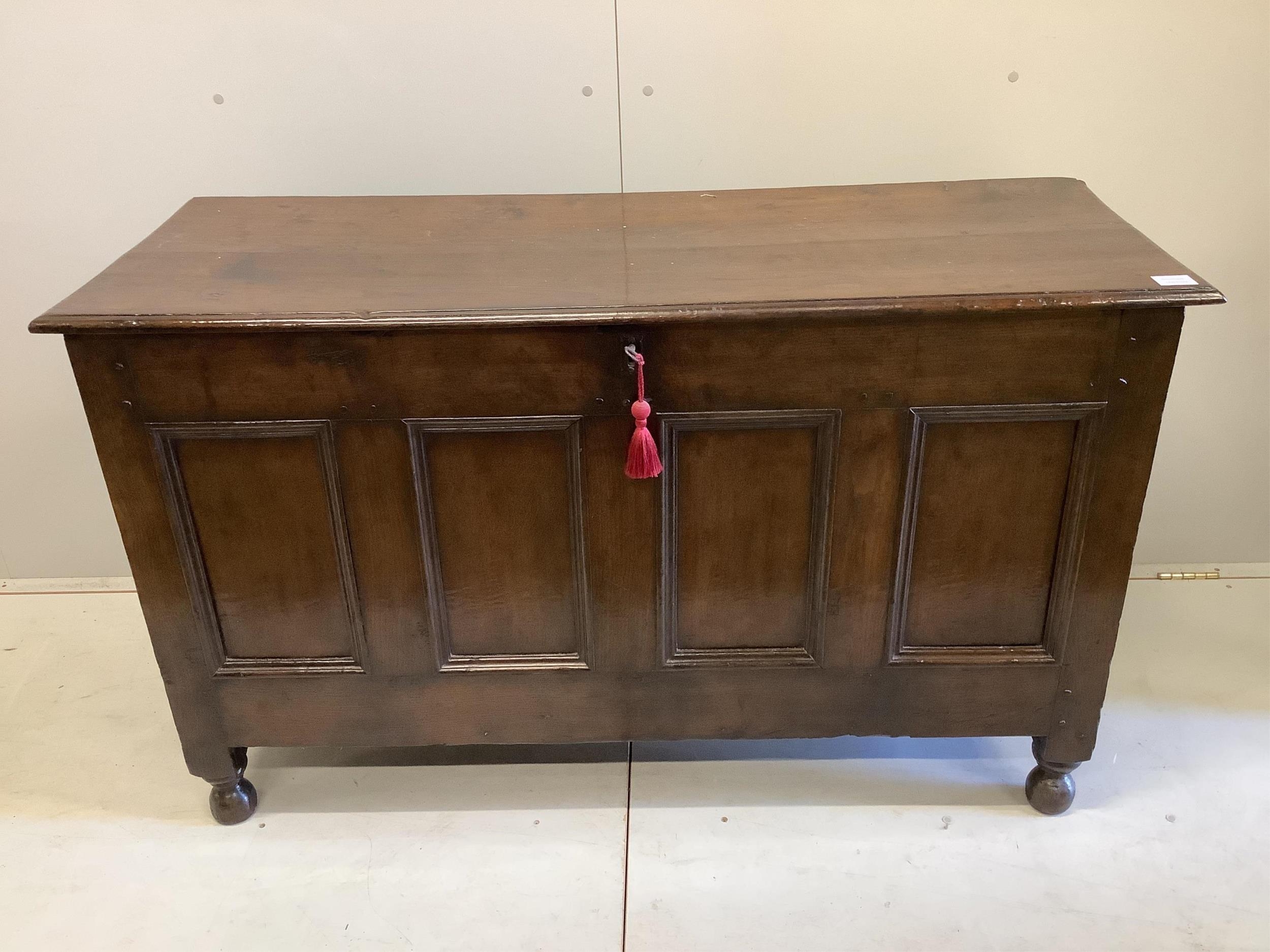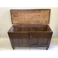 An 18th century oak fielded panelled coffer, width 131cm, depth 50cm, height 78cm. Condition - fair-good
