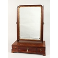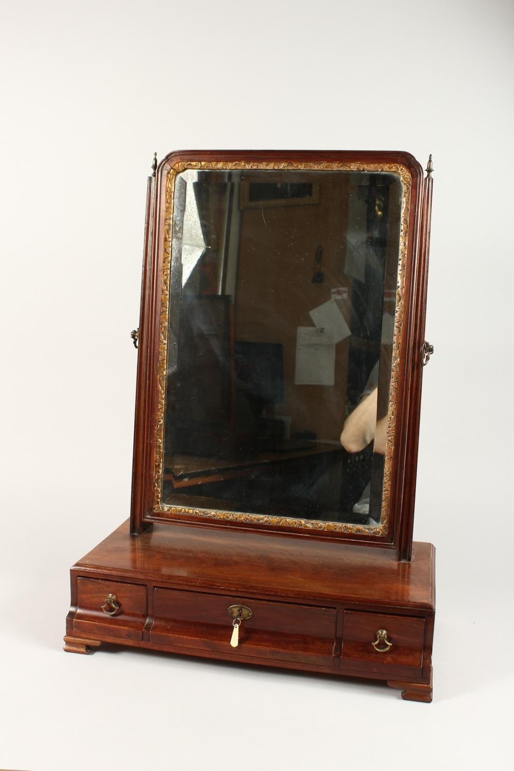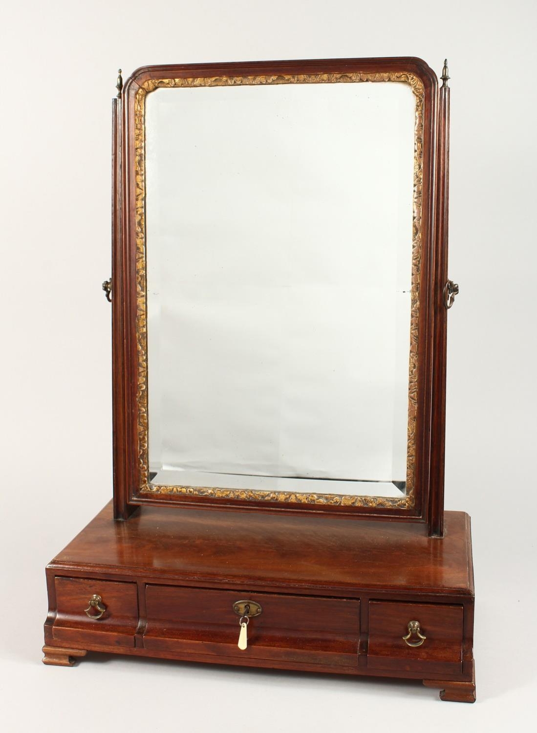 A GEORGIAN MAHOGANY TOILET MIRROR, gilded glass mirror, the base with three drawers on bracket feet.