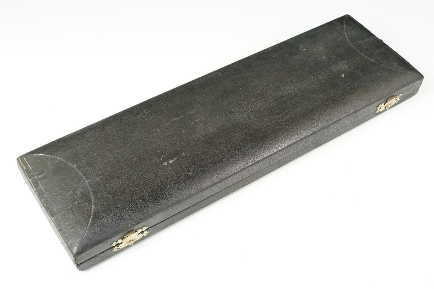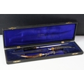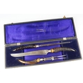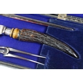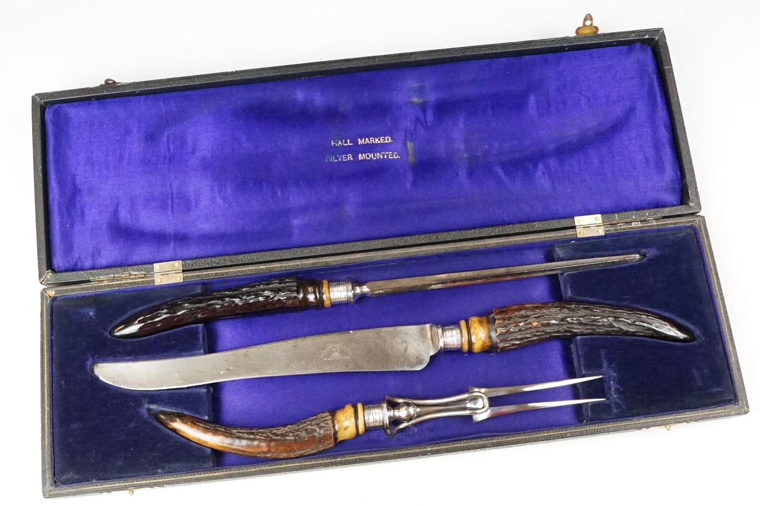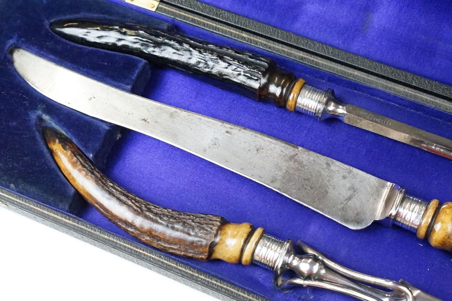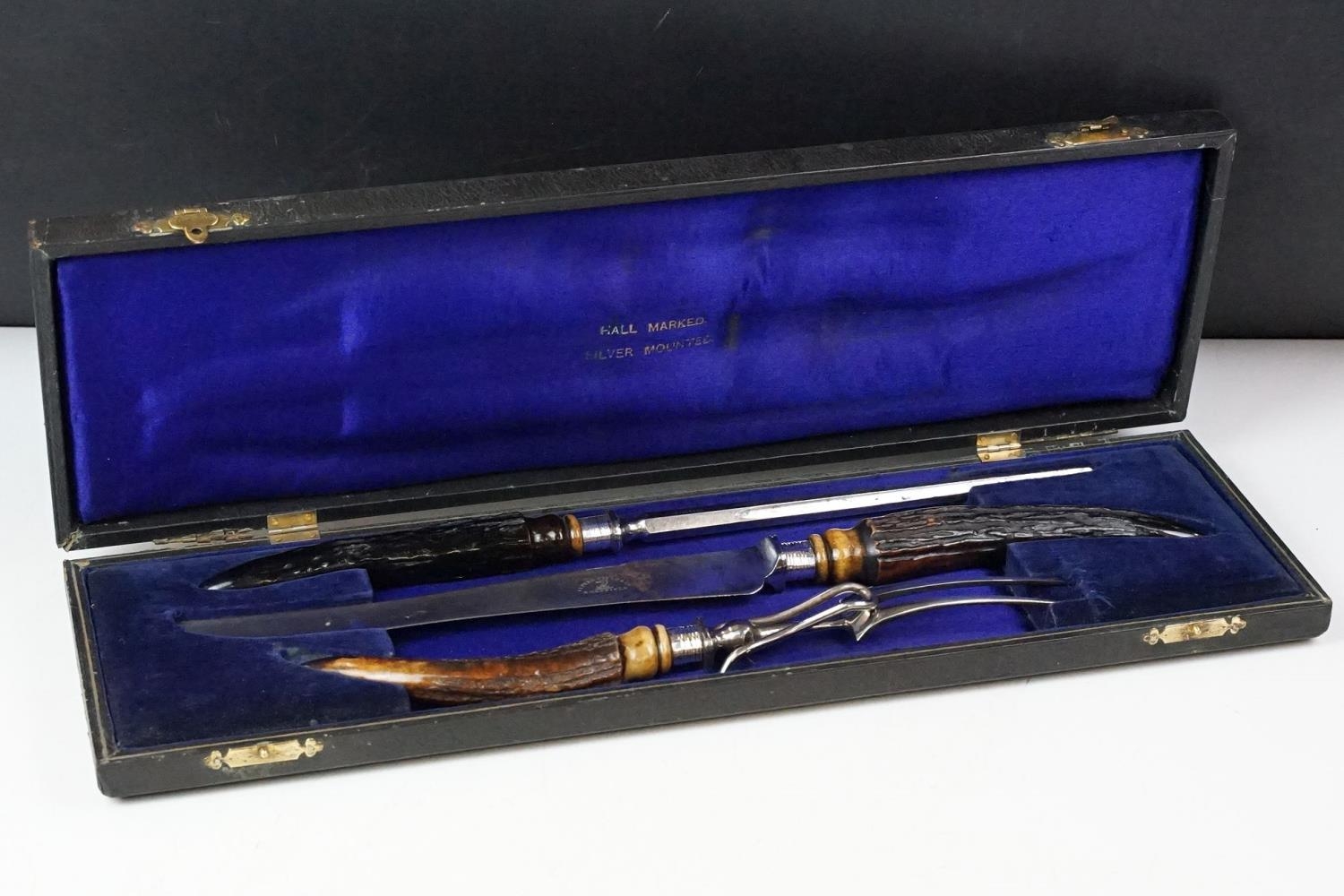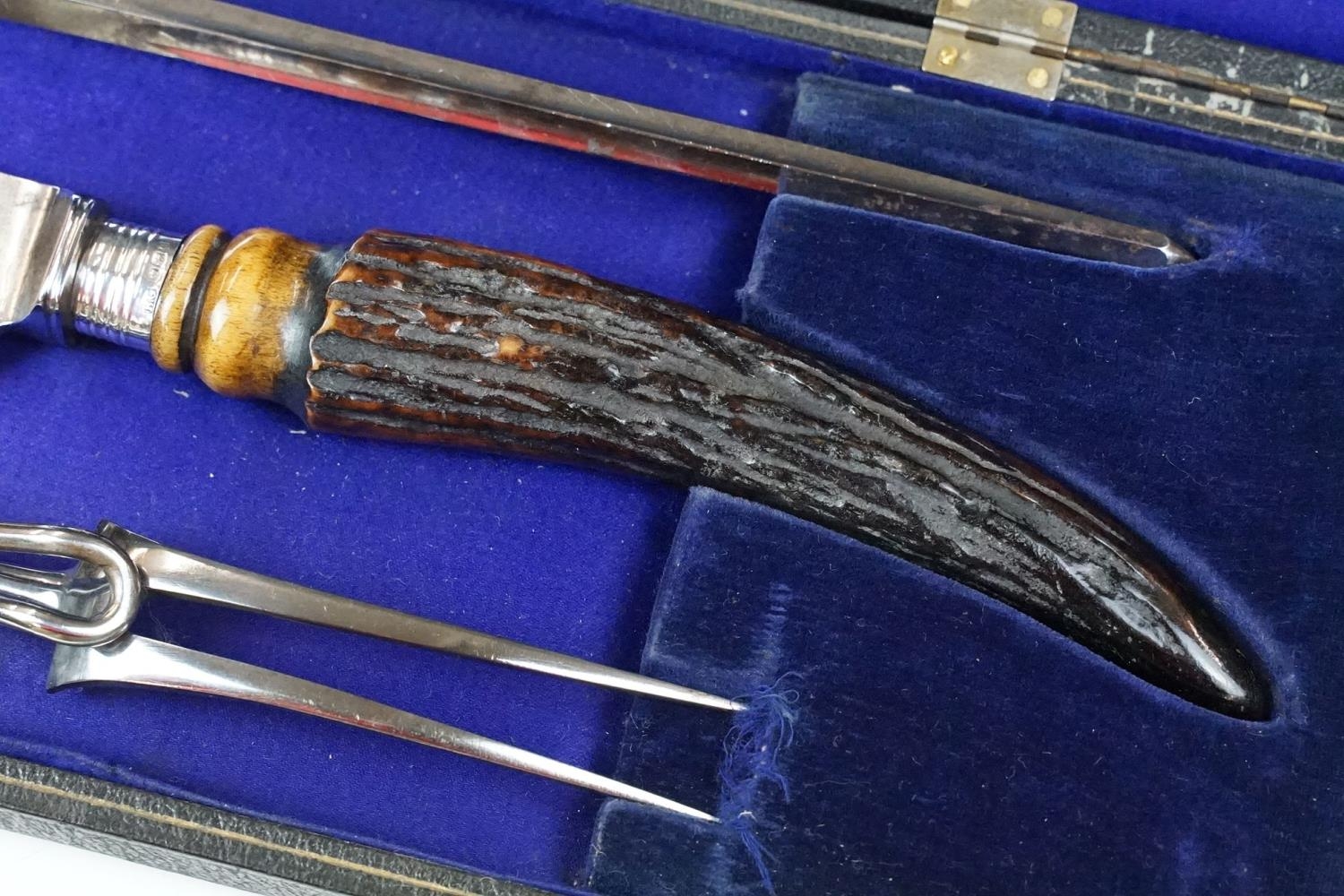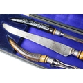 A cased carving set with antler handles and sterling silver mounts.
