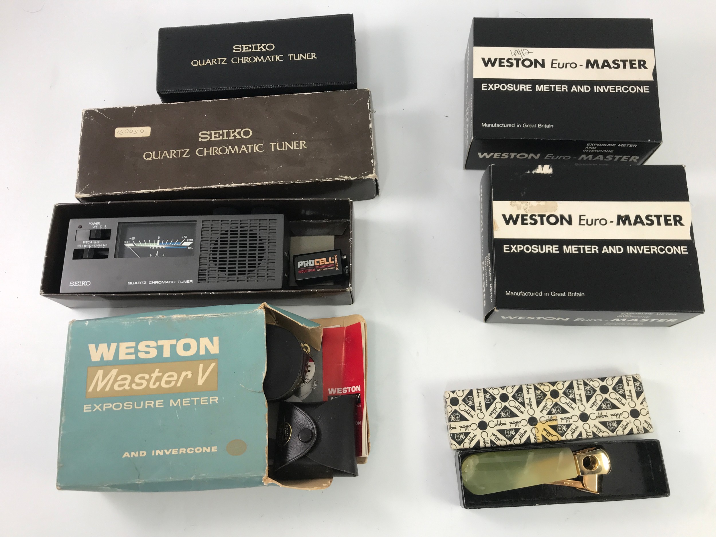 3 WESTON EXPOSURE METERS, A SEIKO CHROMATIC TUNER AND A CIGAR CUTTER