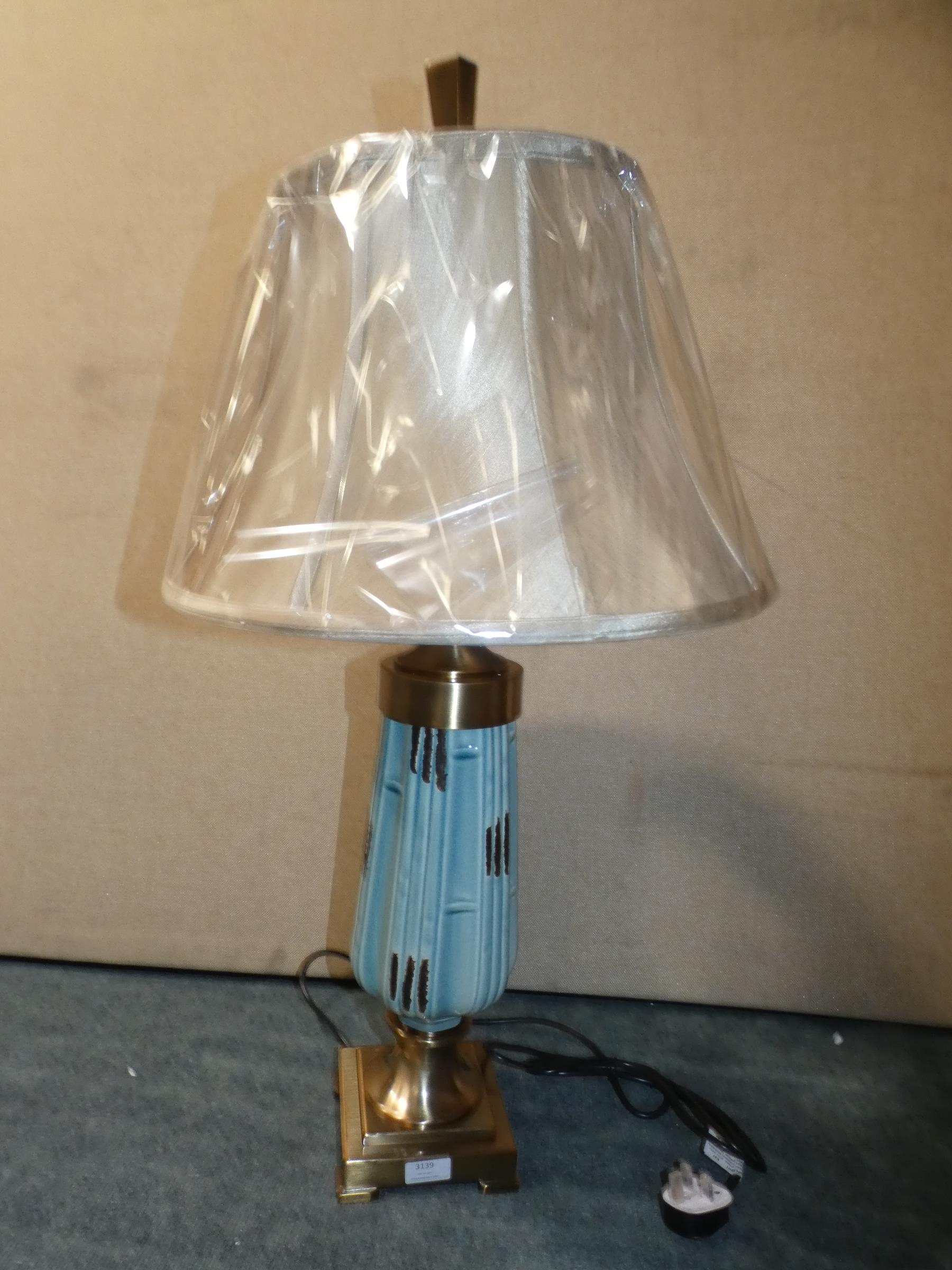 A bronze and ceramic table lamp with gold shade, 90cm tall * this lot is subject to VAT
