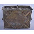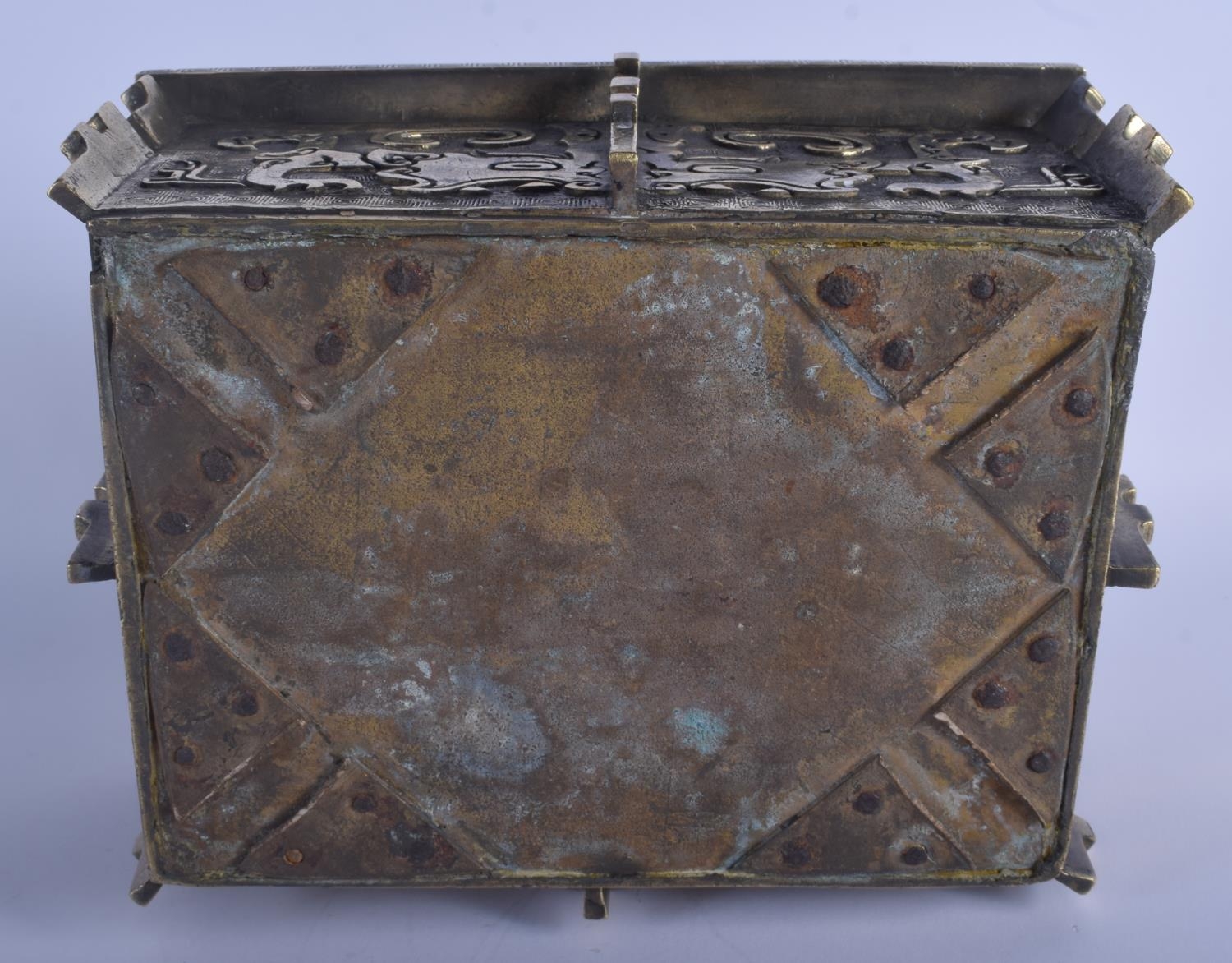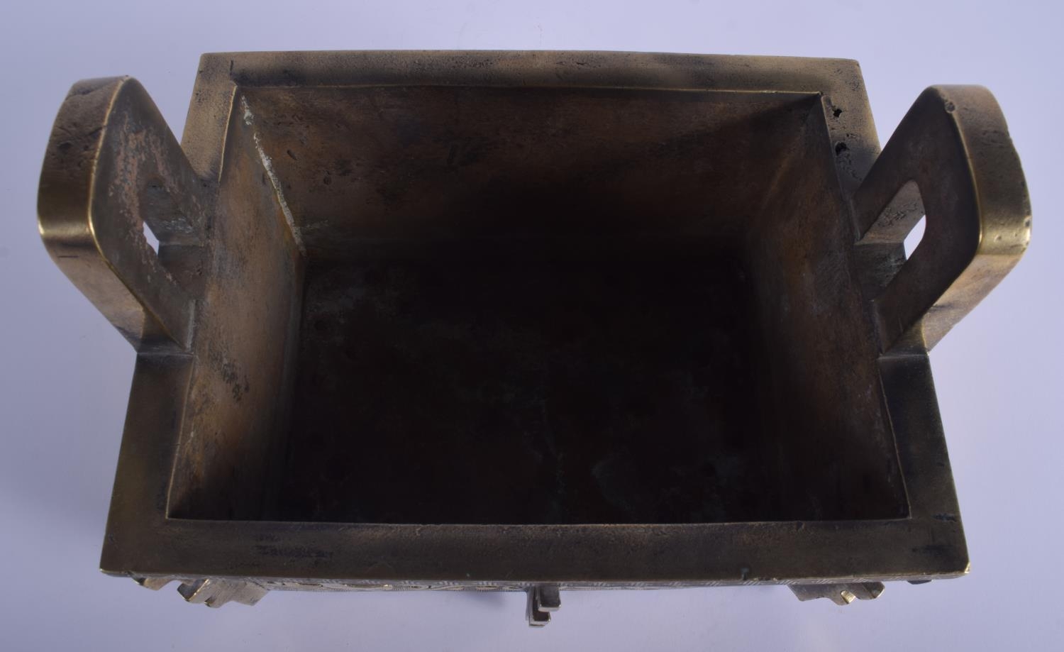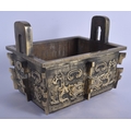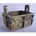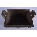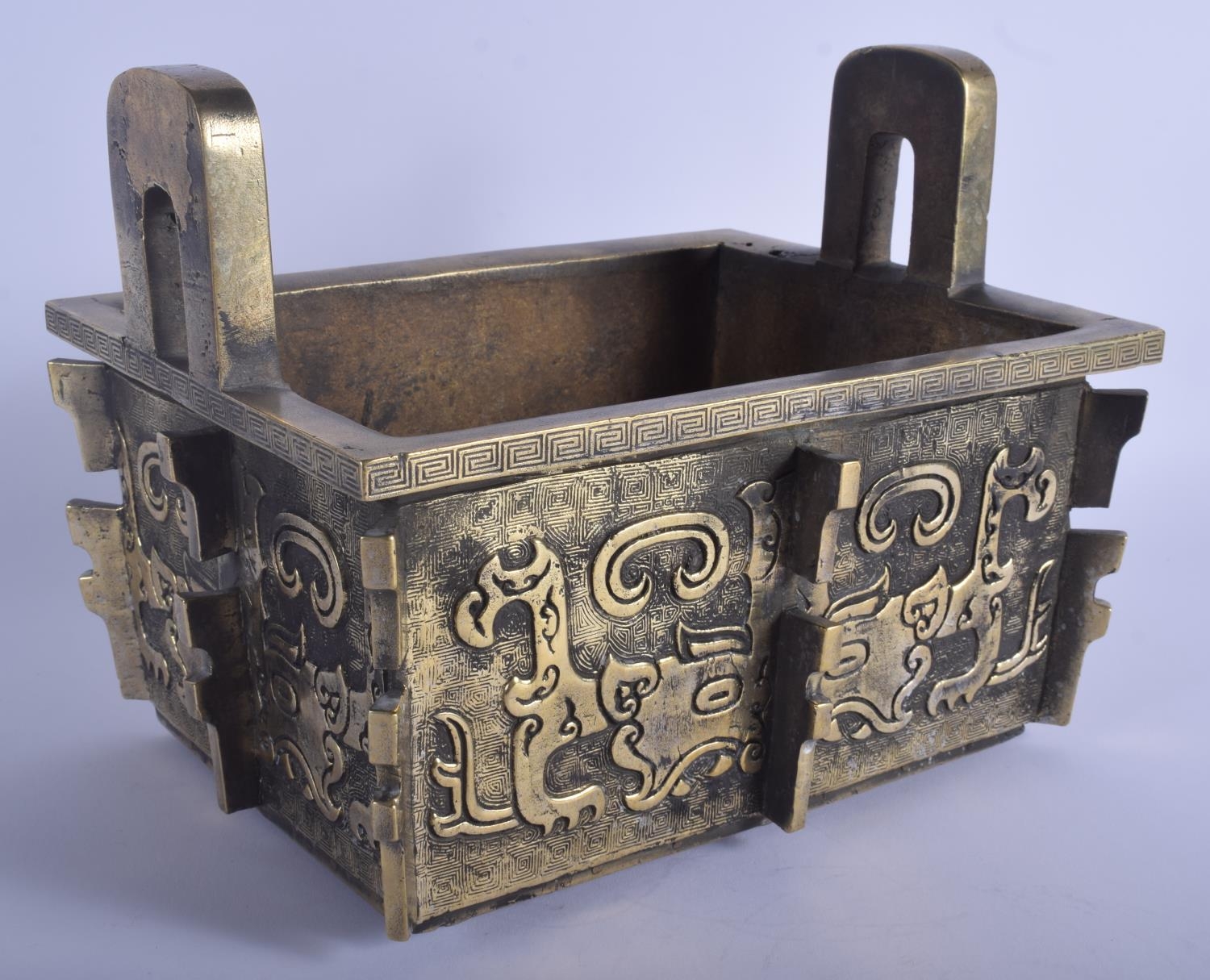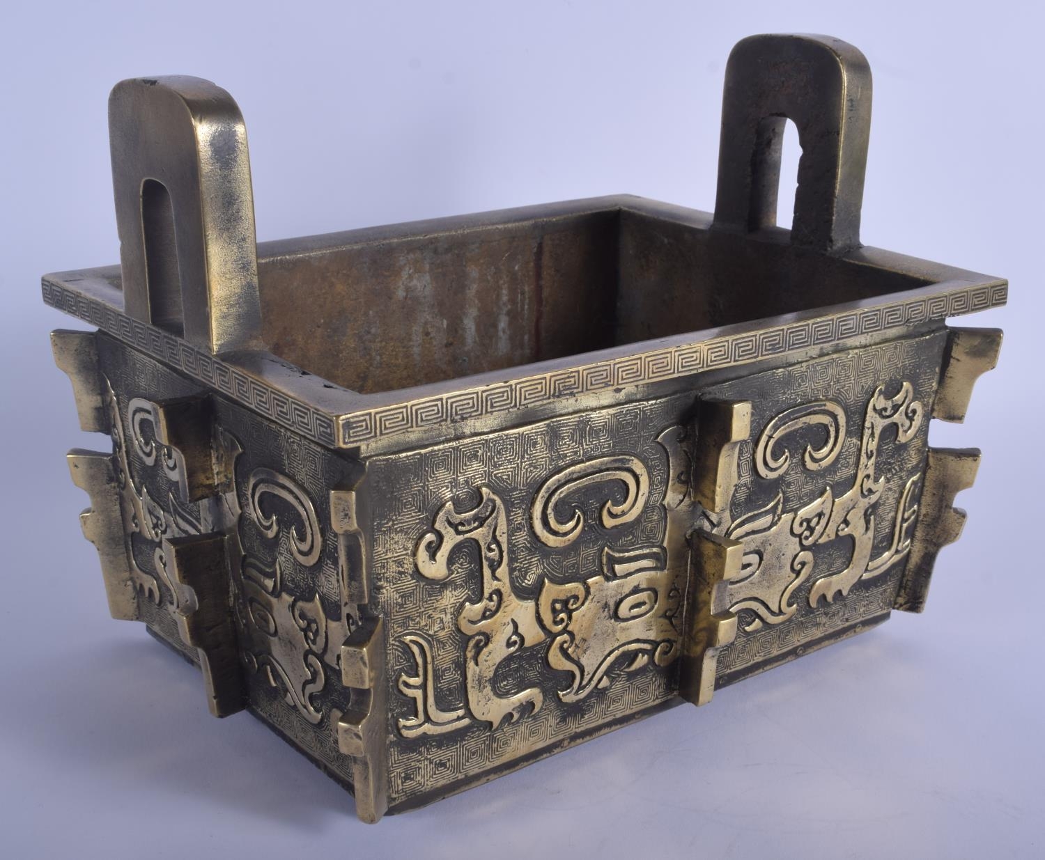 A LARGE 19TH CENTURY CHINESE TWIN HANDLED BRONZE CENSER Qing, of archaic form, decorated with mask heads. 27 cm x 24 m.