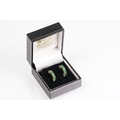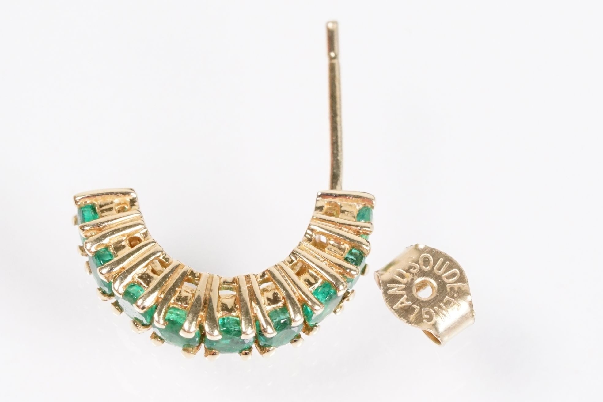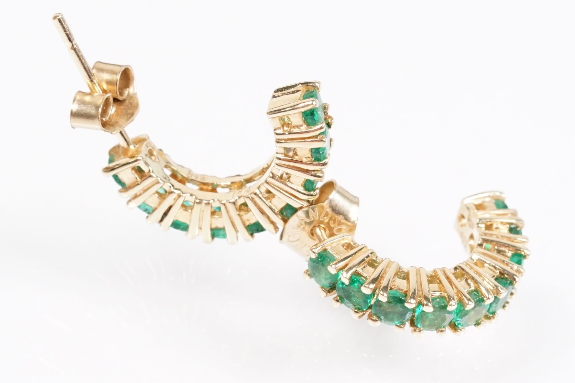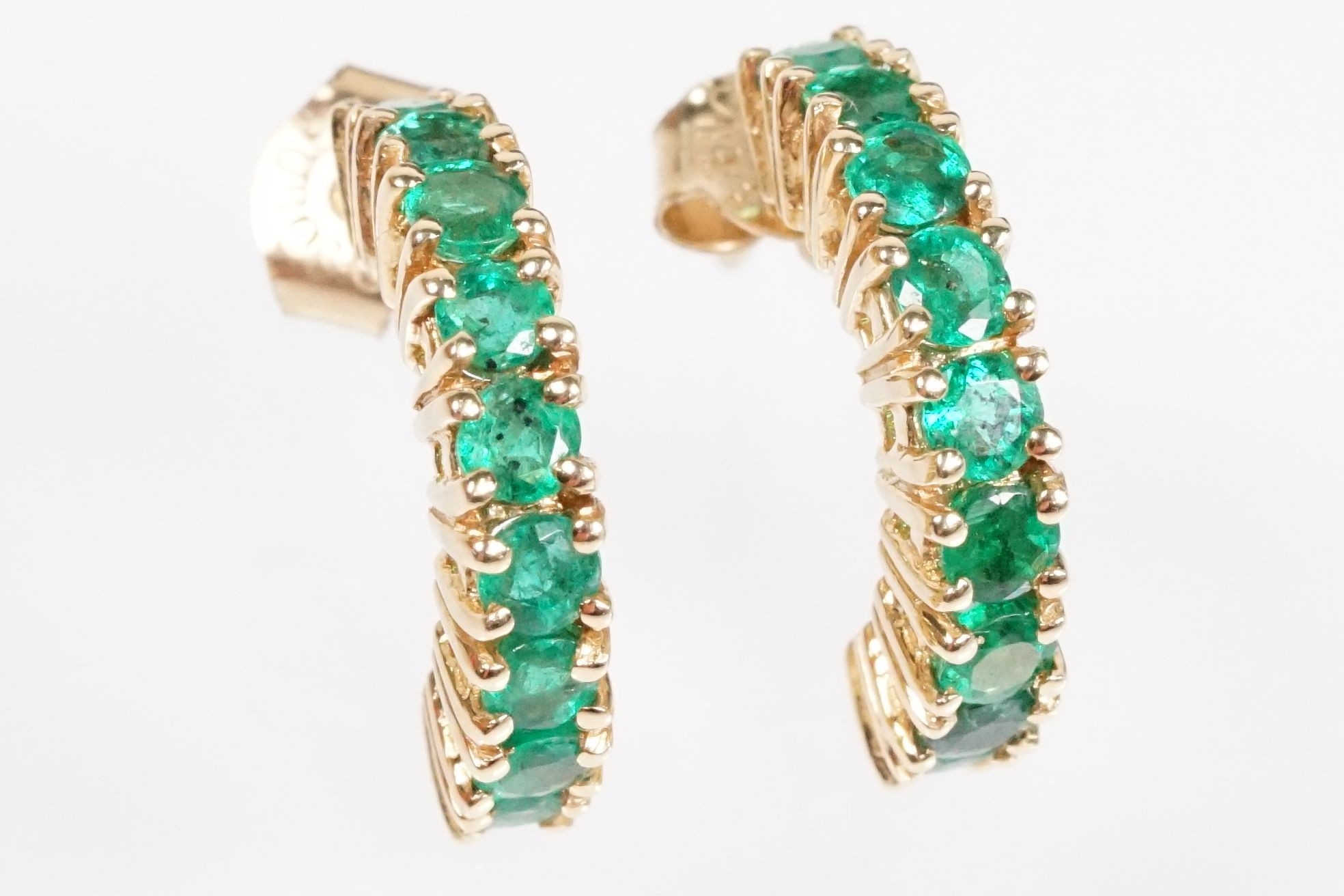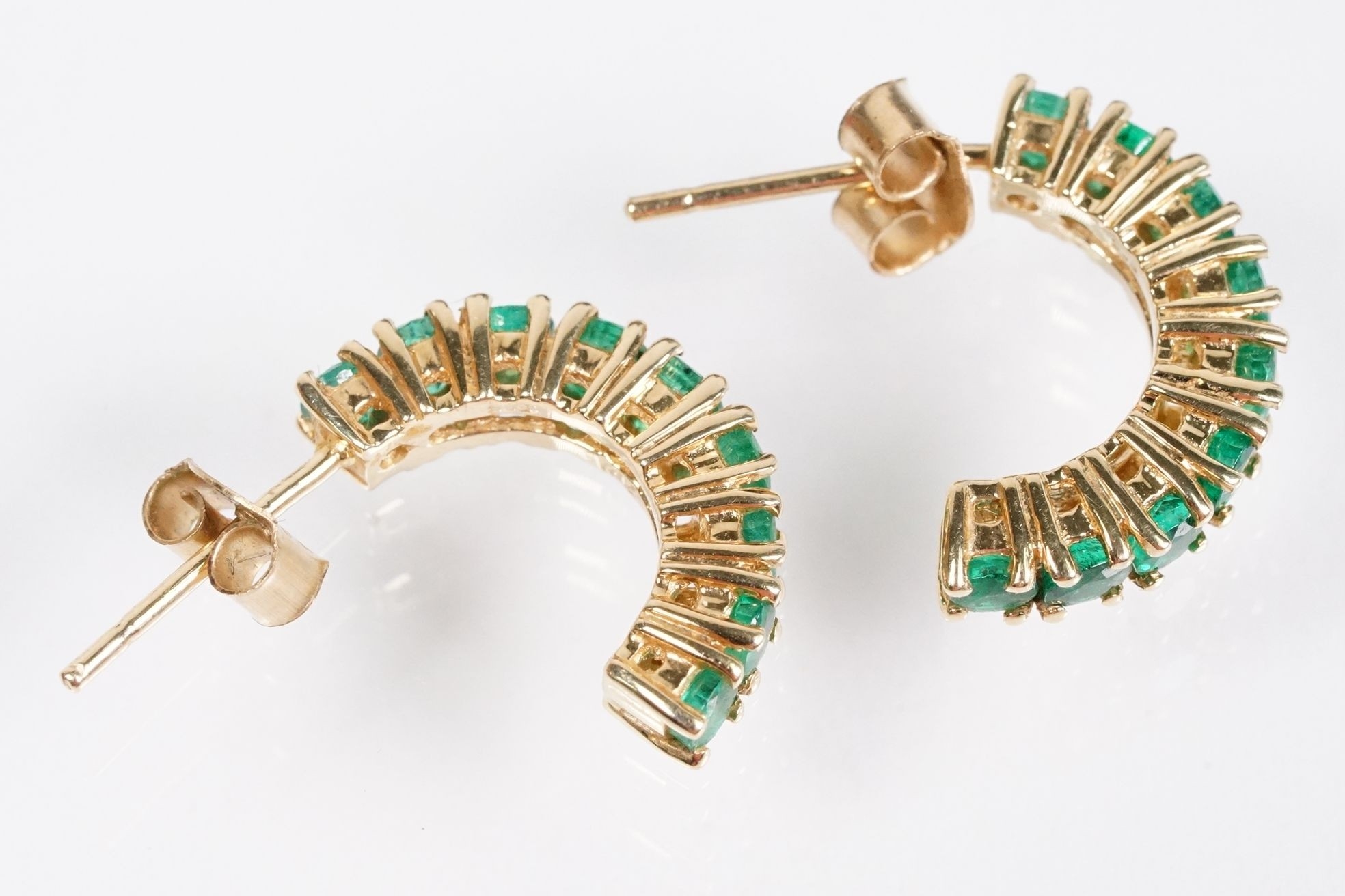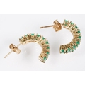 Pair of 14ct gold and emerald half hoop earrings being set with nine round cut emeralds. Marked 14k. Hoops measure 15mm. Emeralds approx 2.5mm diameter.