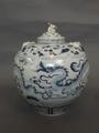 A Chinese blue and white bulbous jar and cover decorated with dragons to sides, 8' high