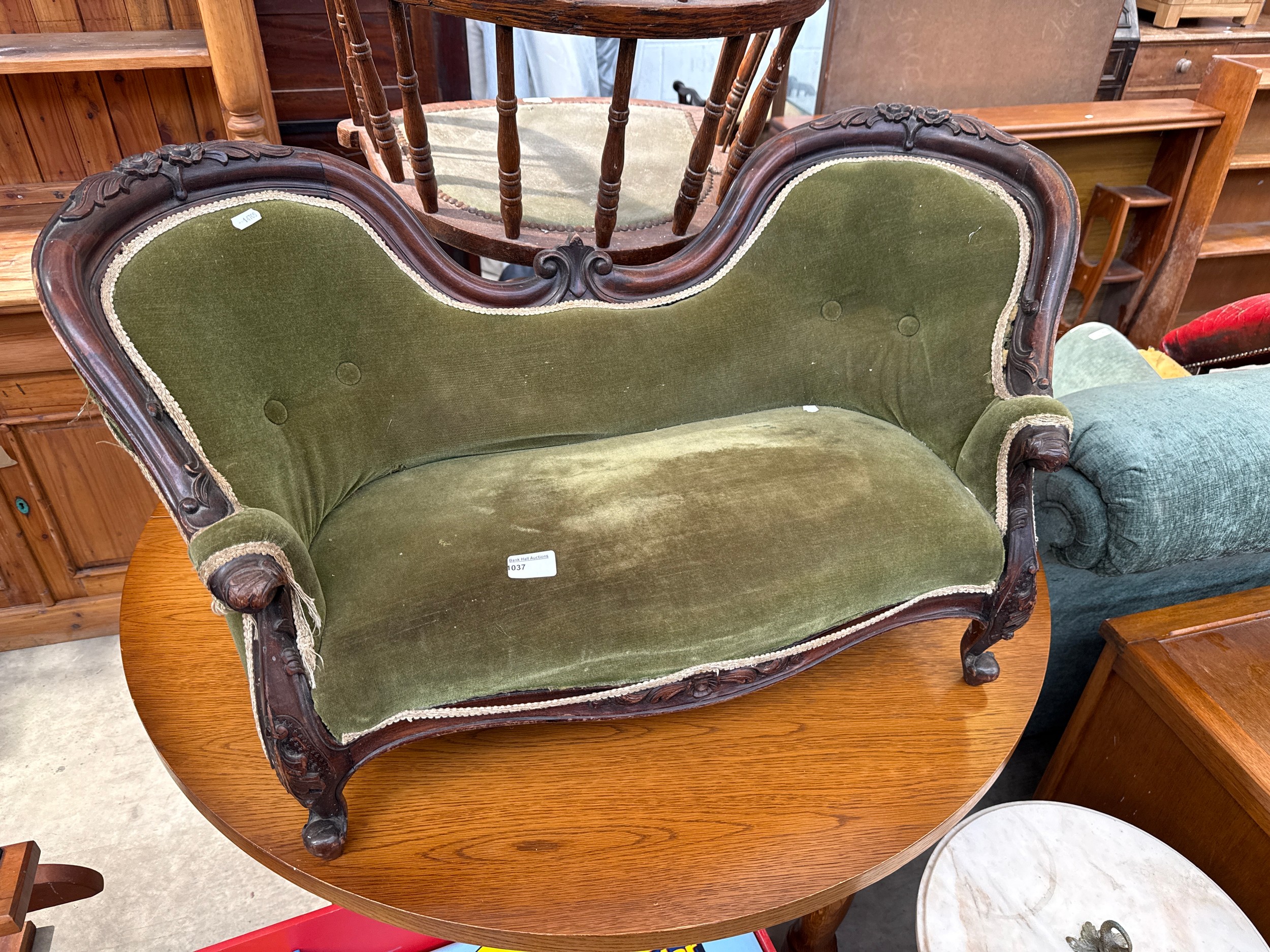 A small ornately carved Child's antique mahogany framed sofa