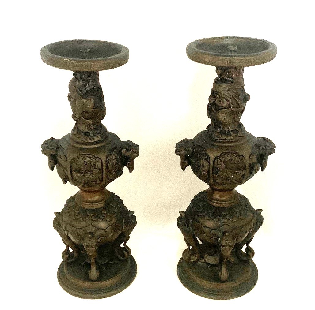 Pair of Chinese bronze candle sticks, late 19th century, with dragon mask handles, elephant trunks, beasts and turtles, set on stepped circular bases, 22.5cm high.