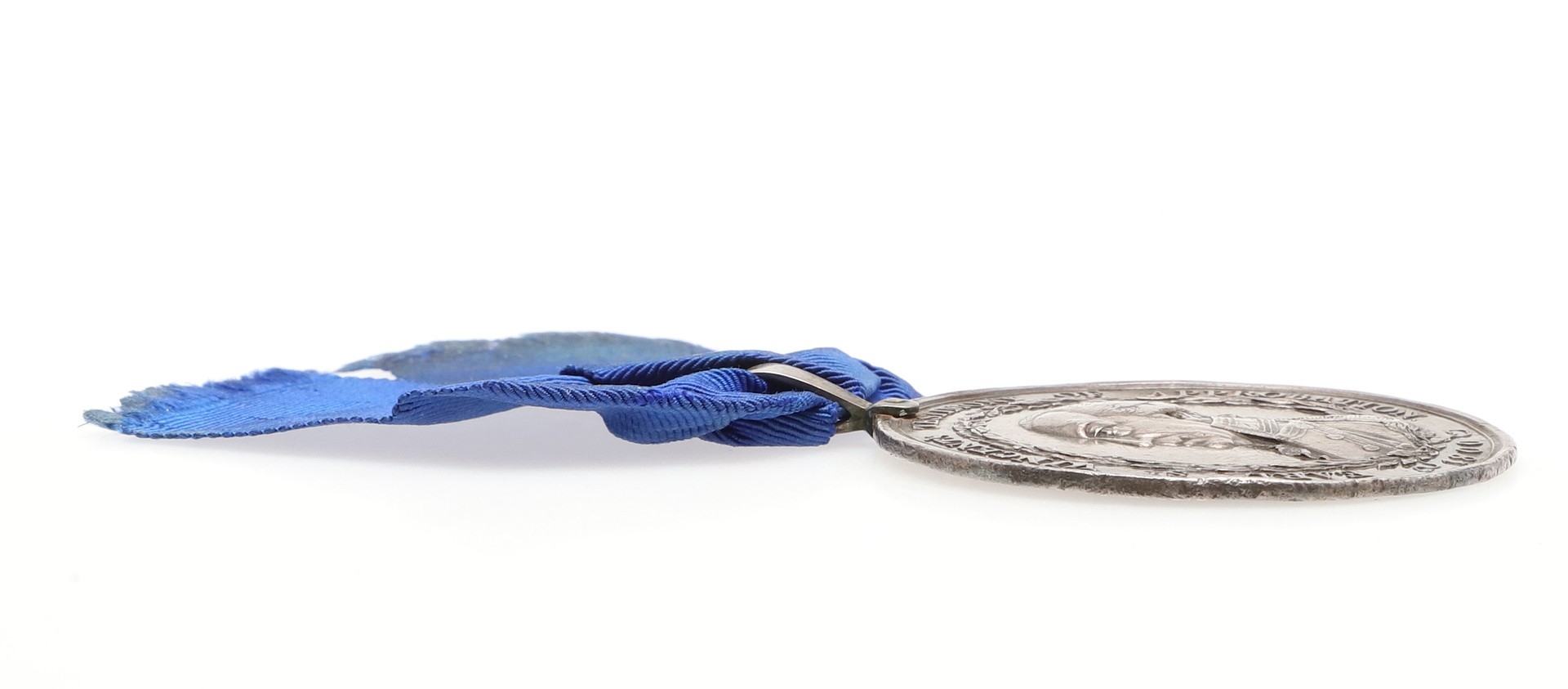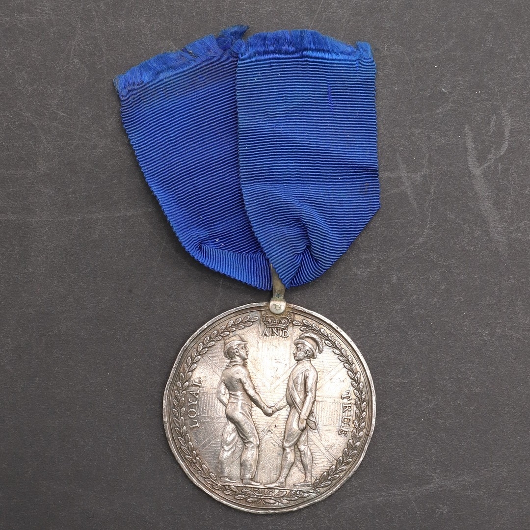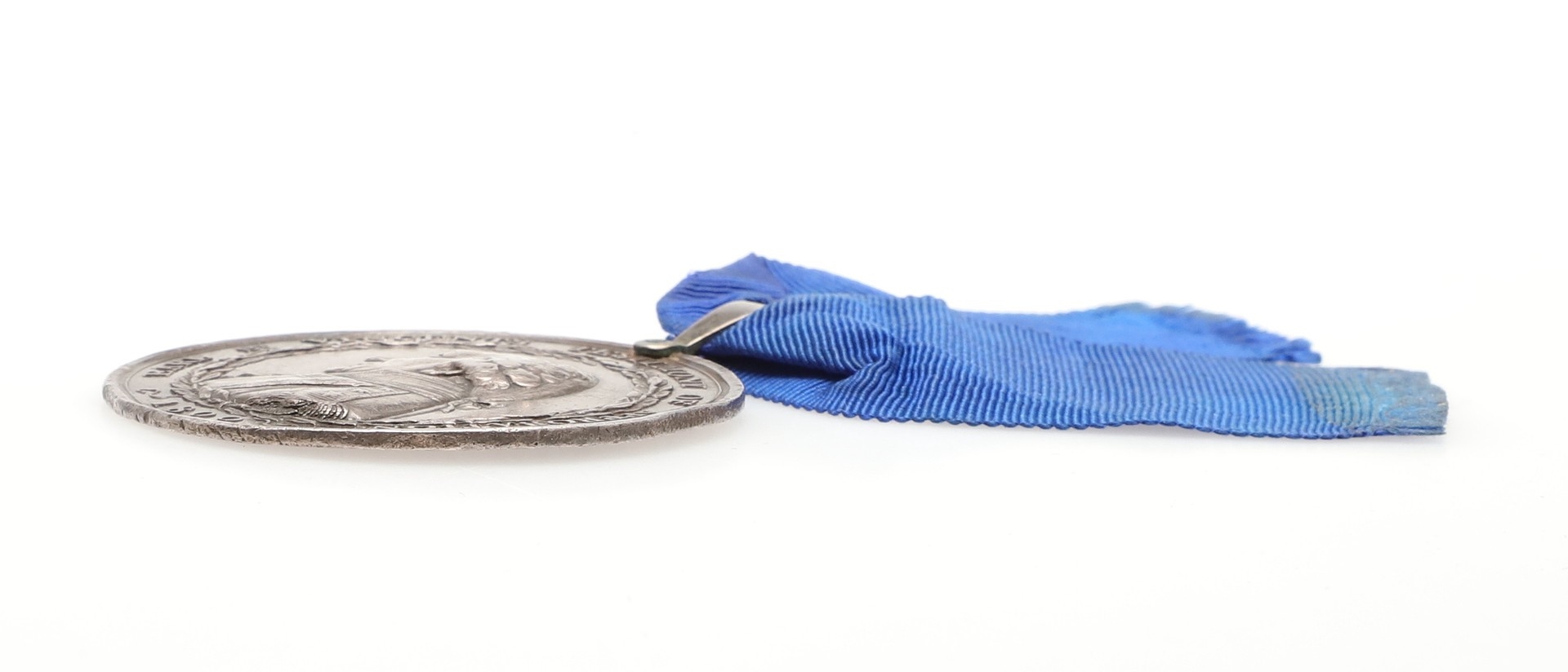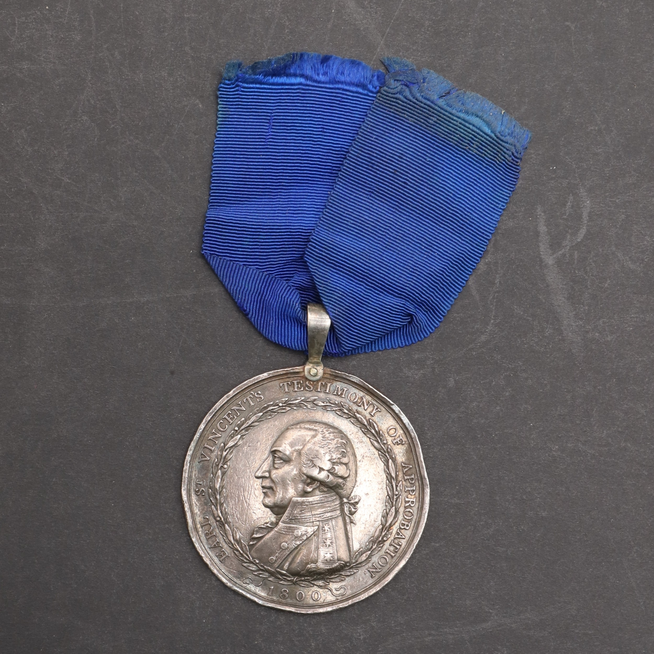 EARL ST. VINCENT'S MEDAL, TESTIMONY OF APPROBATION, 1800. A silver medal, portrait of the Admiral l. dated 1800, reverse two sailors shaking hands before the flag 'Loyal and True', with clip and blue ribbon, 4.8 cm. Soho Mint. The design by John Flaxman and Conrad Kuchler. Awarded to the members of the crew of Admiral Jervis's Earl St Vincent who followed him from his flagship 'Victory' to 'Ville de Paris' and stayed loyal during the 1797 mutiny at the Nore.