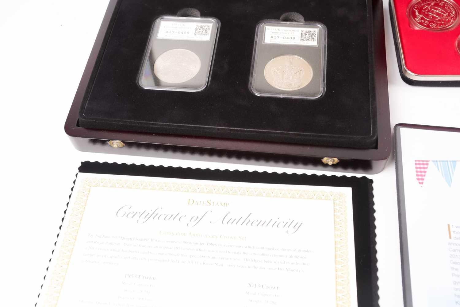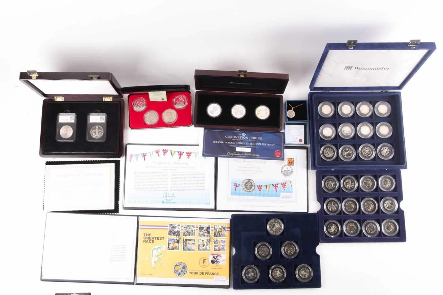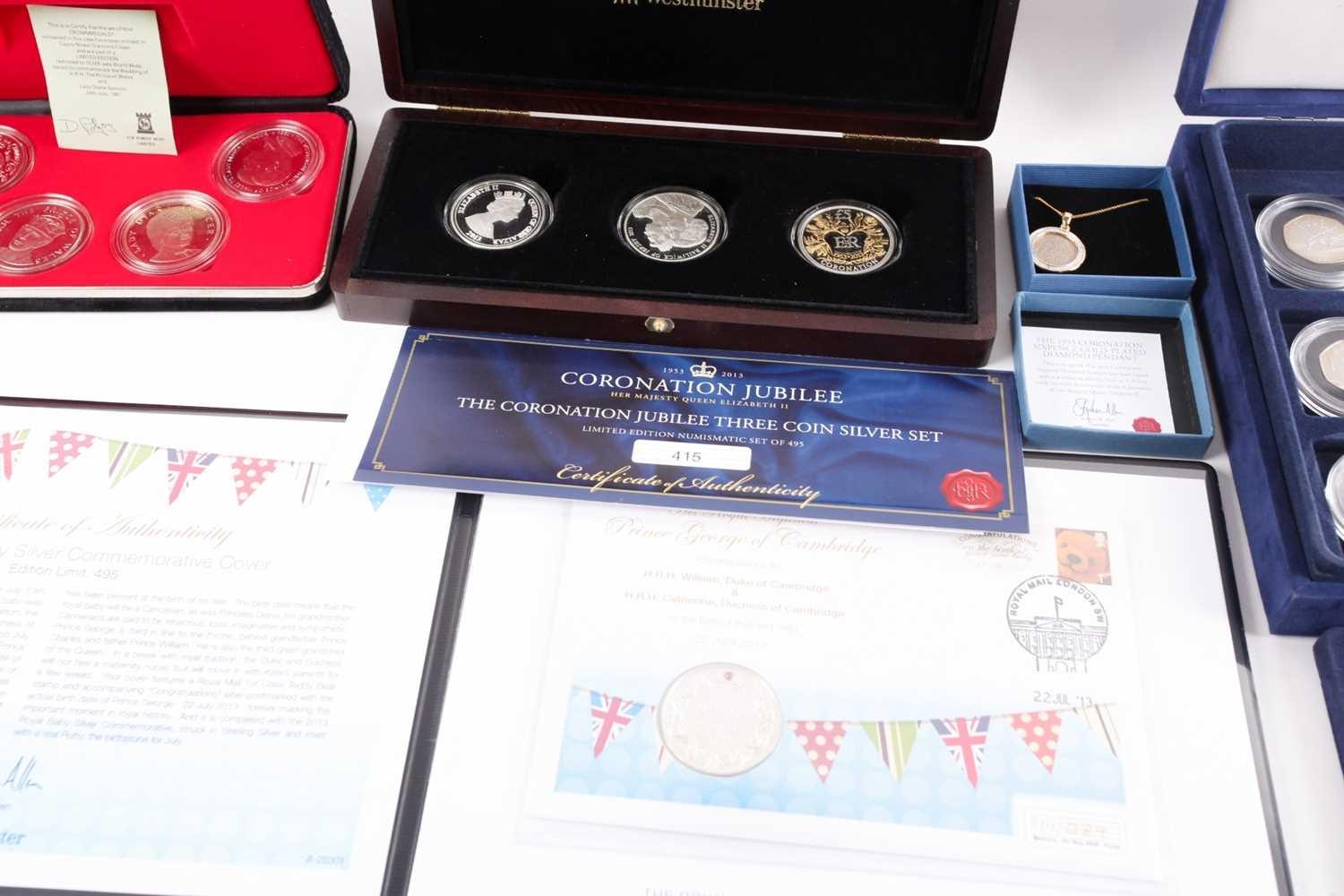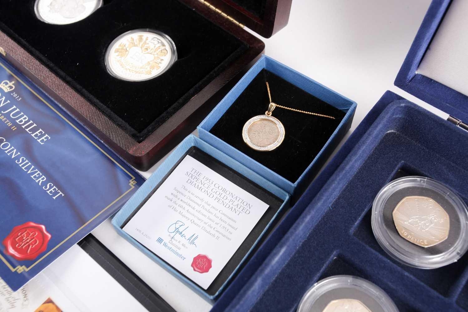 Seven boxed commemorative coin sets, comprising: 1953 Coronation Sixpence in gold-plated diamond pendant, Pobjoy Mint 'Four Crownmedals' for the 1981 Royal Wedding, Westminster Coronation Jubille three-coin silver set (415/495), Westminster 2011 issued coin set for the 2012 London Olympics, DateStamp Coronation Anniversary Crown Set (1953/2013), Westminster 2013 Coin and Stamp set for the 100th Tour de France and a Westminster 2013 coin and cover, for the birth of Prince George
