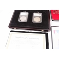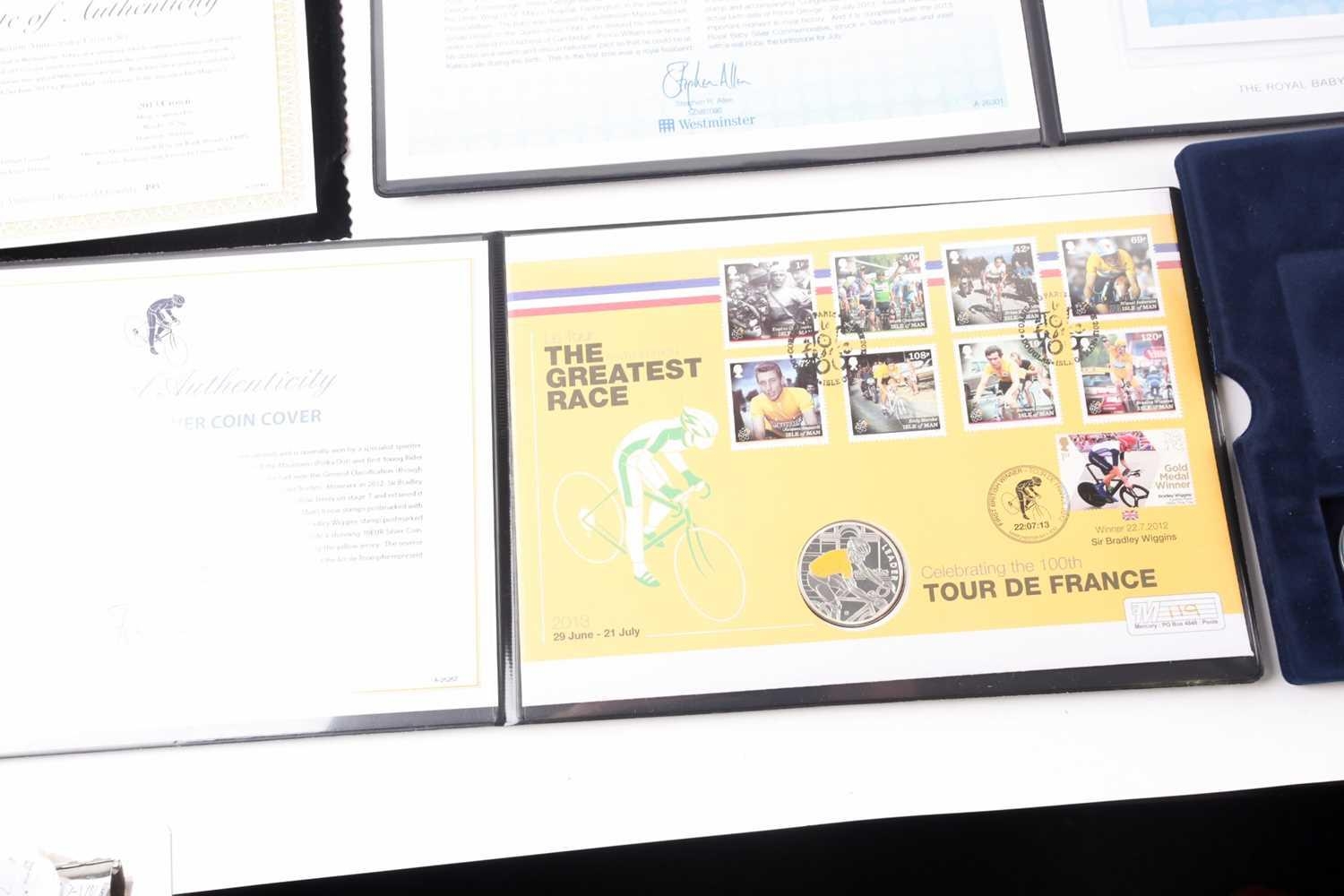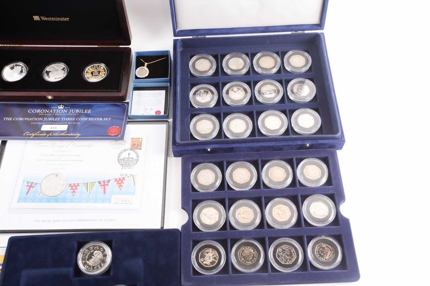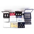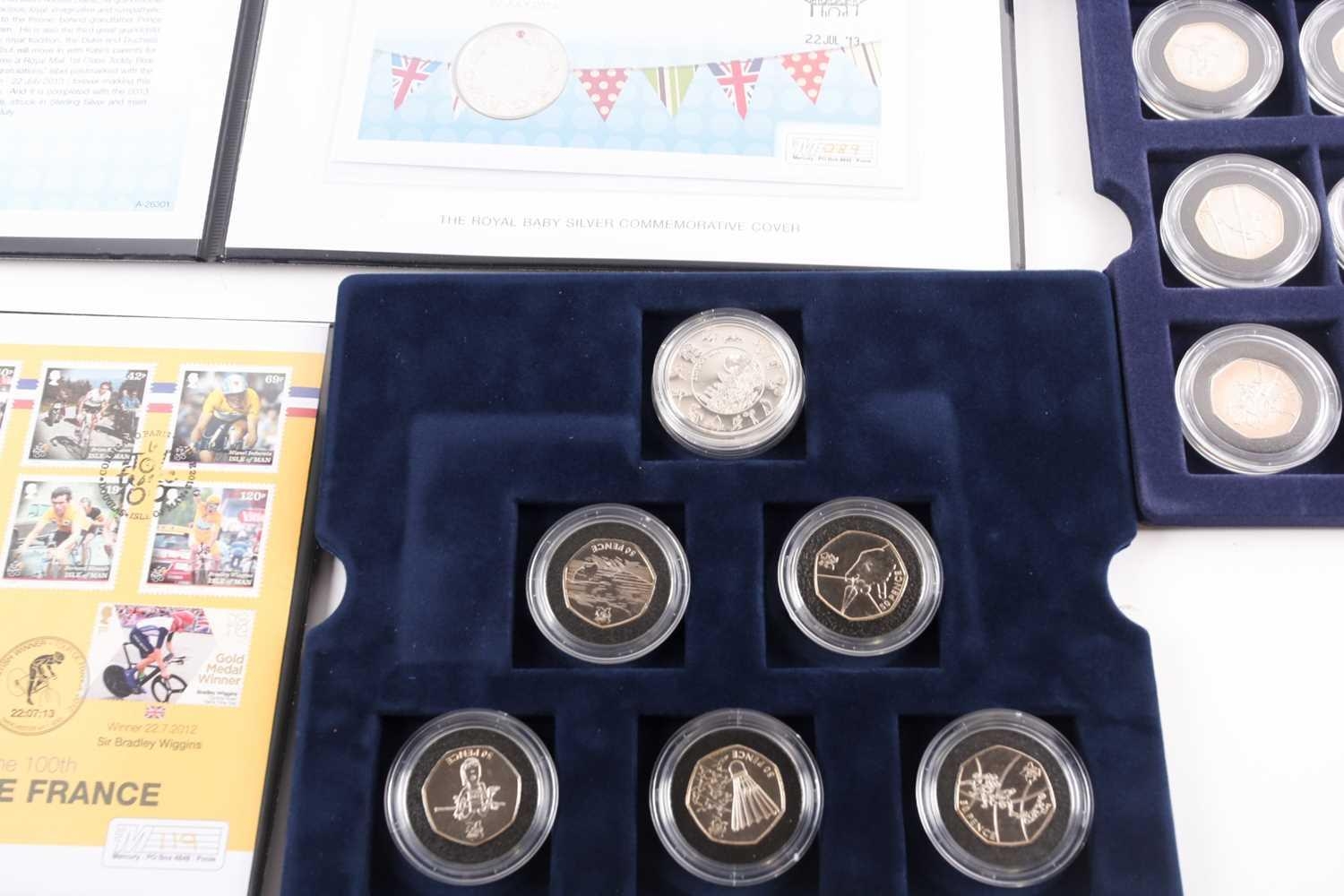 Seven boxed commemorative coin sets, comprising: 1953 Coronation Sixpence in gold-plated diamond pendant, Pobjoy Mint 'Four Crownmedals' for the 1981 Royal Wedding, Westminster Coronation Jubille three-coin silver set (415/495), Westminster 2011 issued coin set for the 2012 London Olympics, DateStamp Coronation Anniversary Crown Set (1953/2013), Westminster 2013 Coin and Stamp set for the 100th Tour de France and a Westminster 2013 coin and cover, for the birth of Prince George