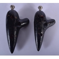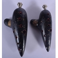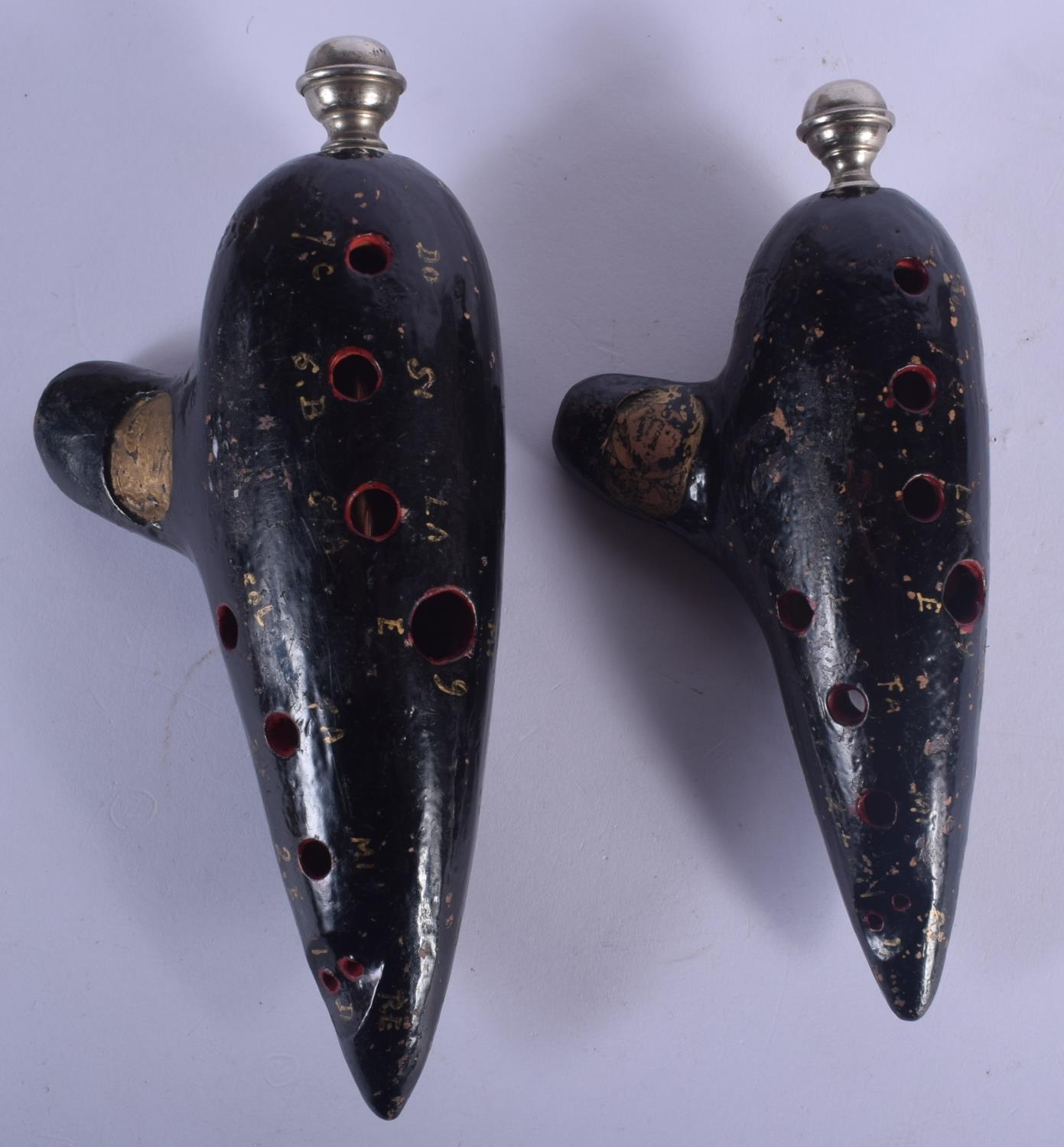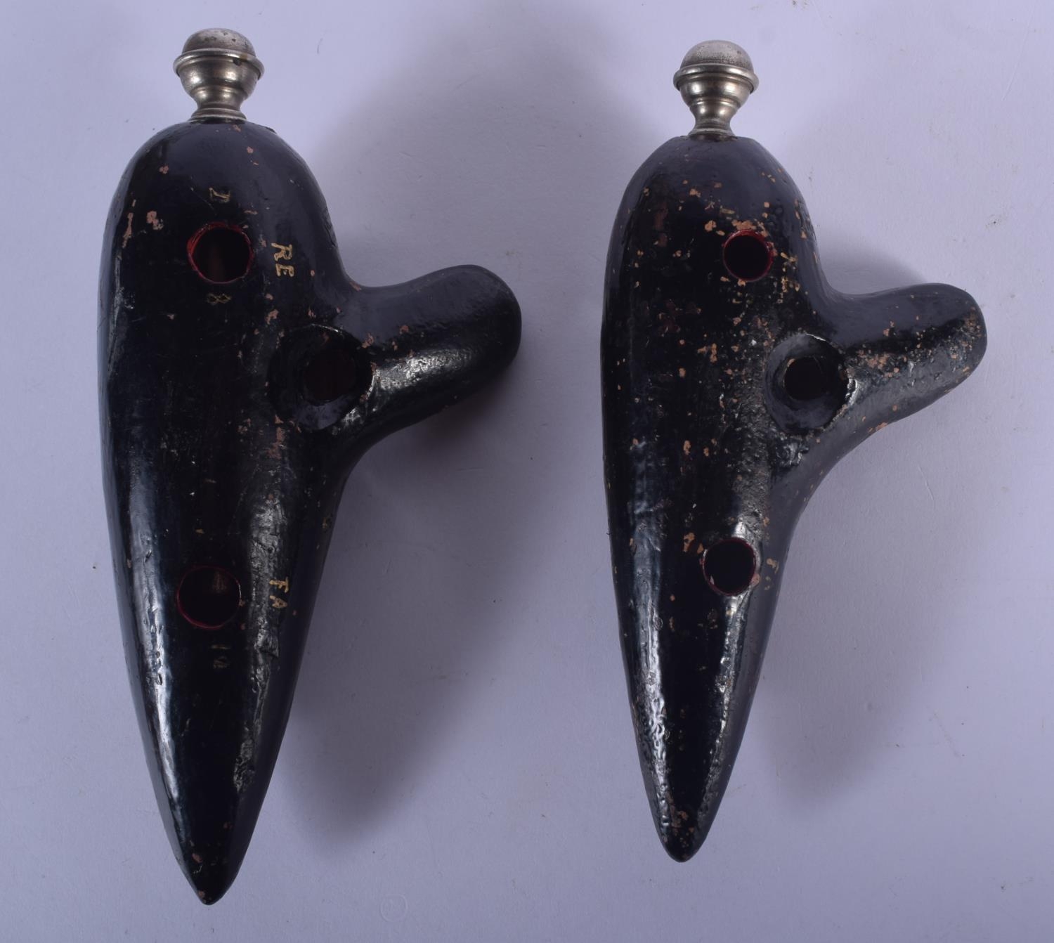 A RARE PAIR OF 19TH CENTURY FRENCH MEZZETTI OF PARIS POTTERY OCARINA INSTRUMENTS with gilded highlights. Largest 18 cm x 9 cm.