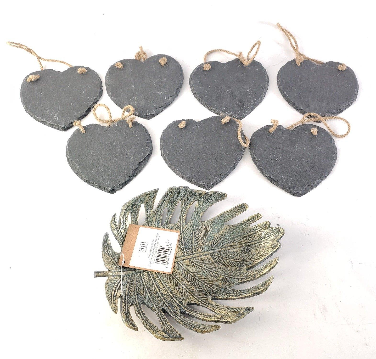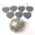 XMAS GIFTING IDEAS! Seven heart-shaped slate wall hangers approx 12cm, and a polyresin cheese plant leaf dish 22x18.5x5cm