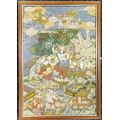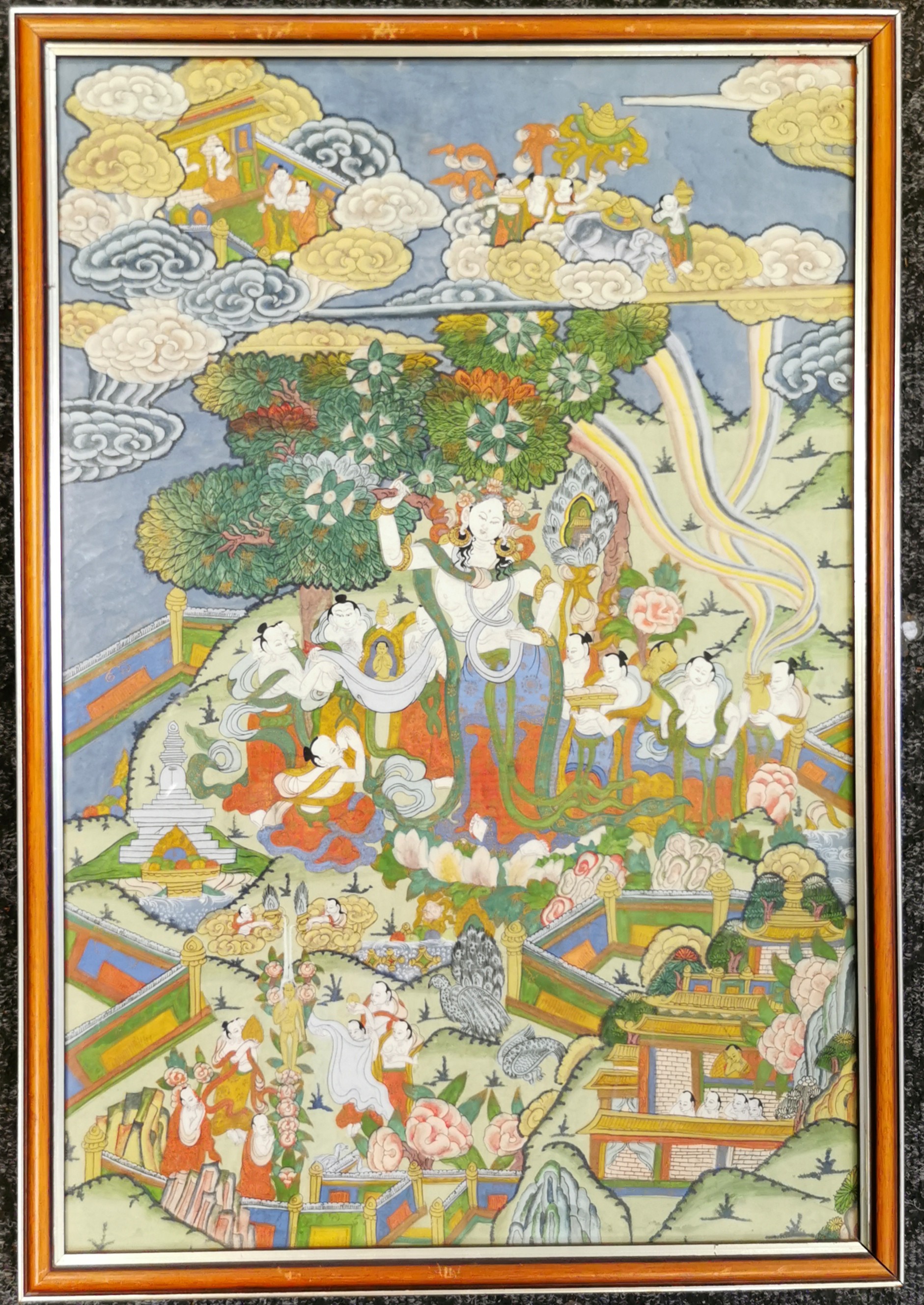Framed thangka of a deity with followers - 68cm x 47cm ~ scuffs to frame