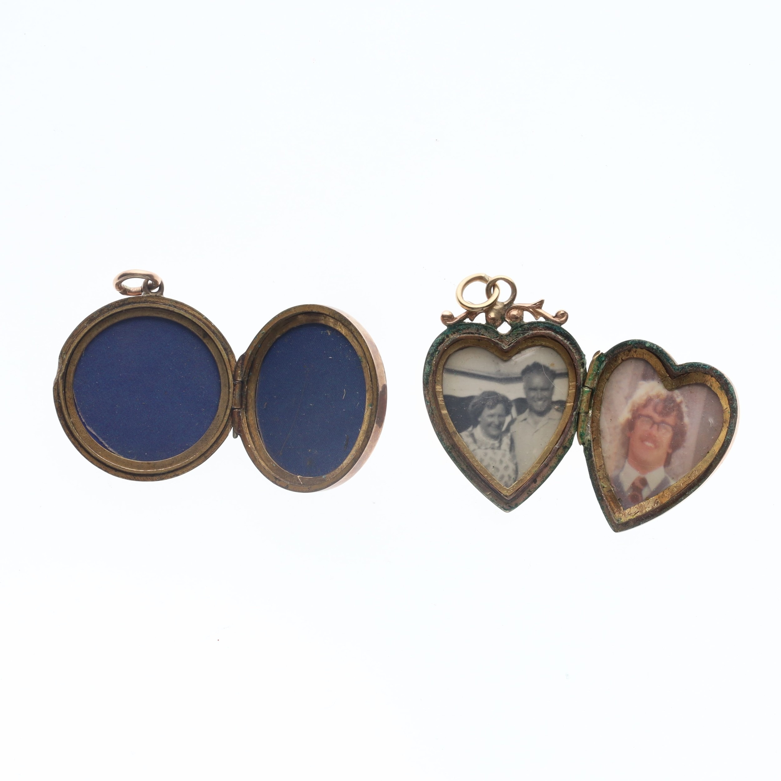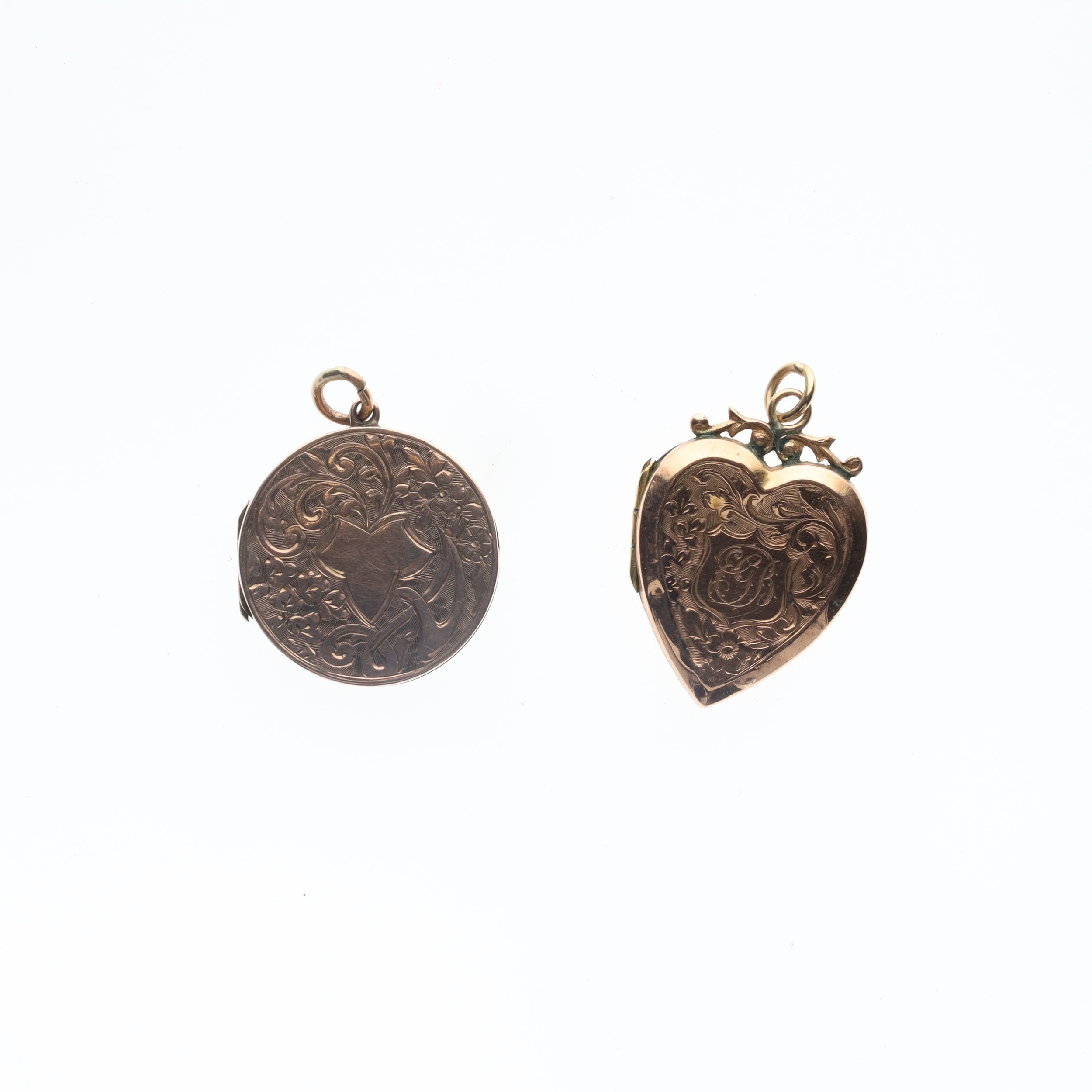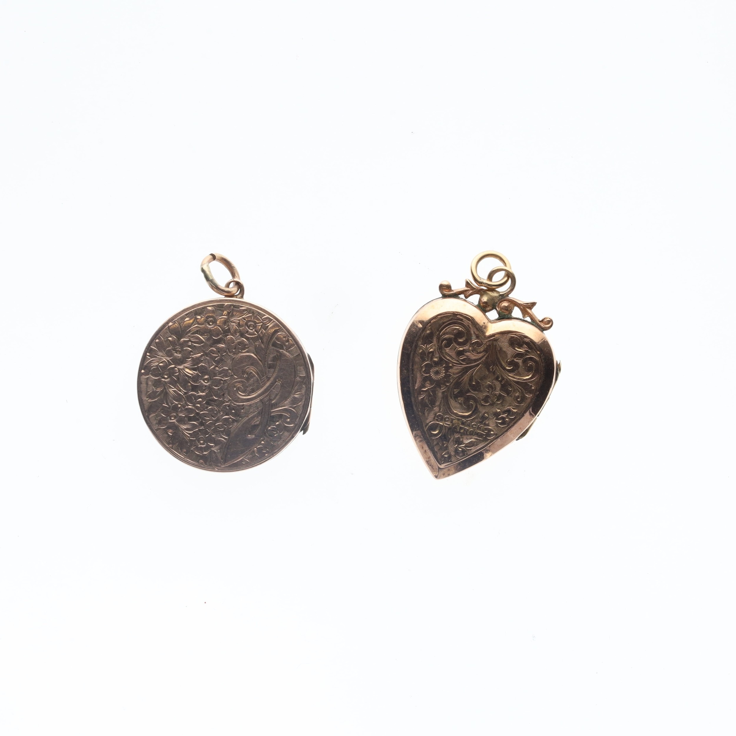 Antique 9ct Gold Back And Front Locket Pendant Pair inc. Victorian, Aesthetic. They have been tested as gold back and front, heart locket is stamped. All clasps are in working order. Weighs in total 8.6g.