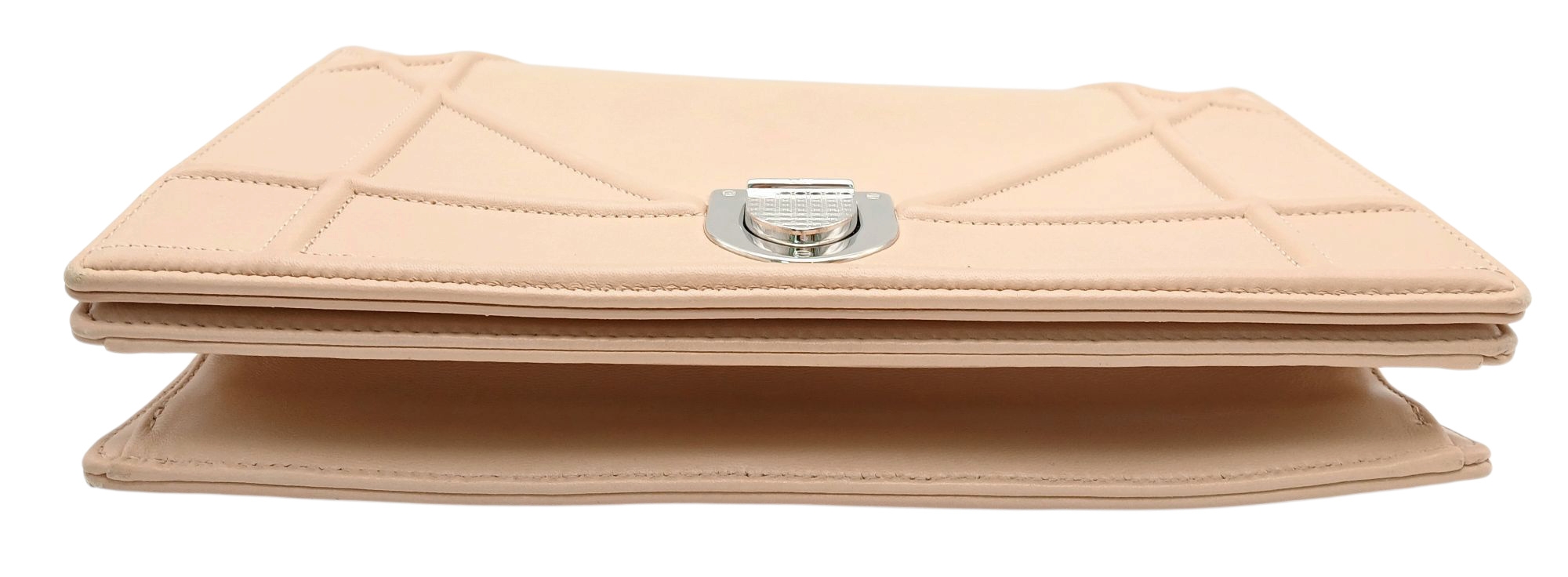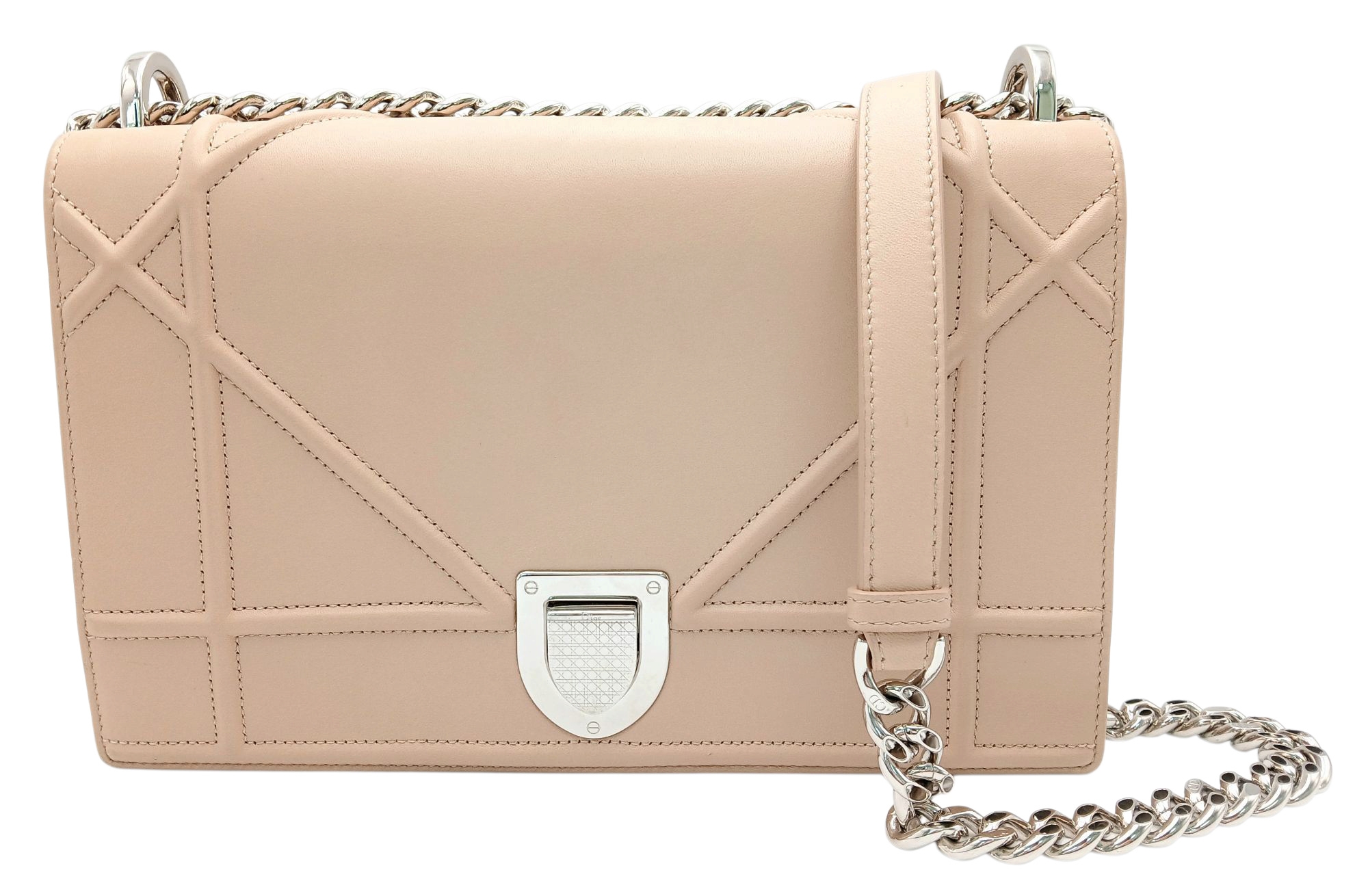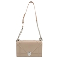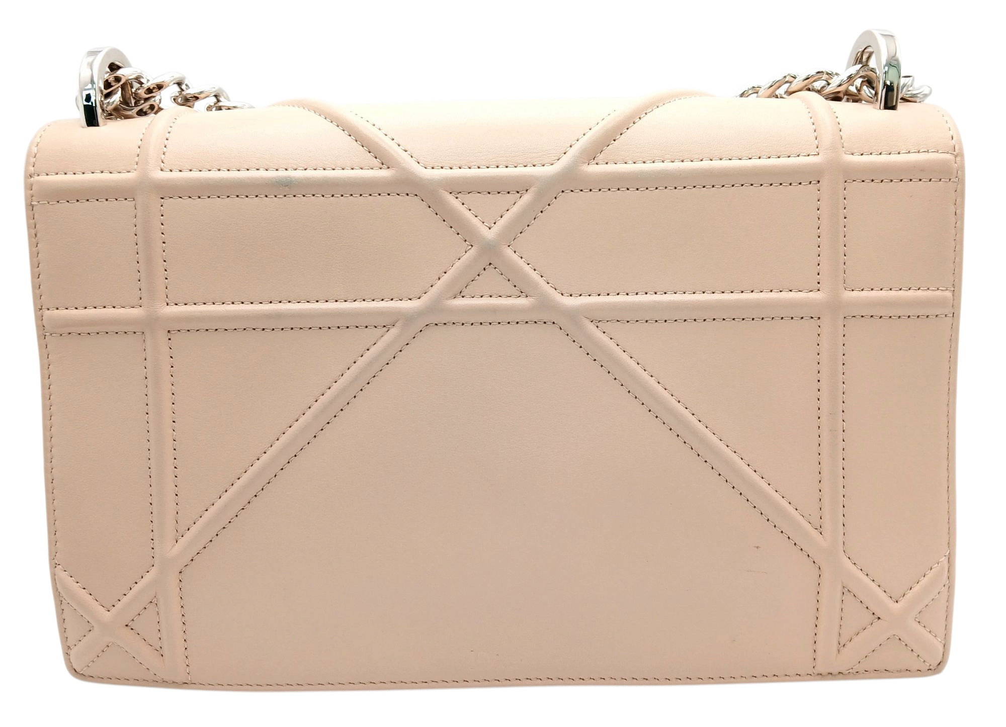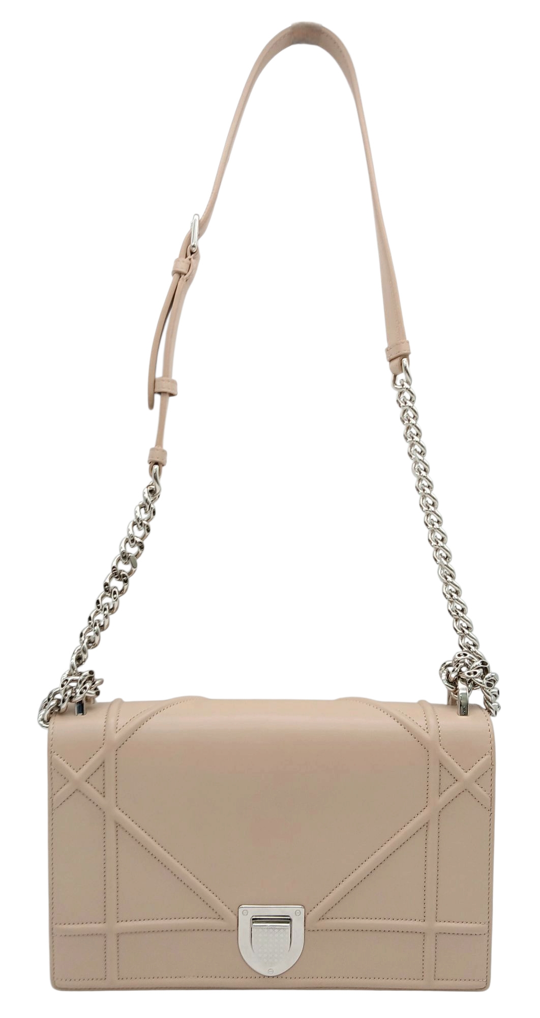 A Christian Dior Beige Leather Diorama Flap Bag. Beige leather exterior with silver-toned hardware. Features a chain and leather shoulder strap with push-lock clasp. Black textile interior includes one main compartment with an inner slip pocket and a zipped pocket. Some signs of wear and tear exterior. Approx 25cm width x 16cm height x 6cm depth. Please see photos or request a condition report. Ref: STK022962