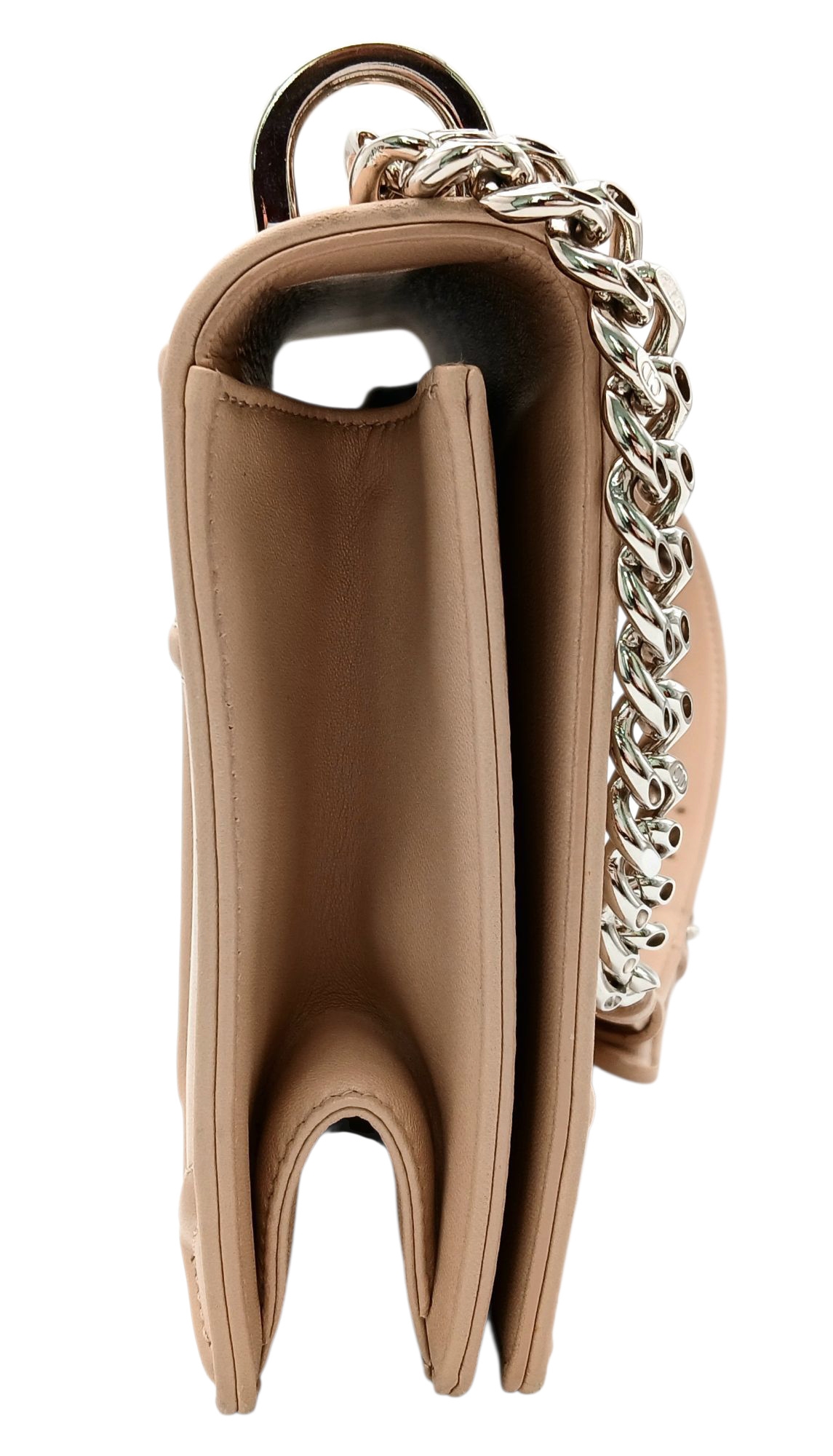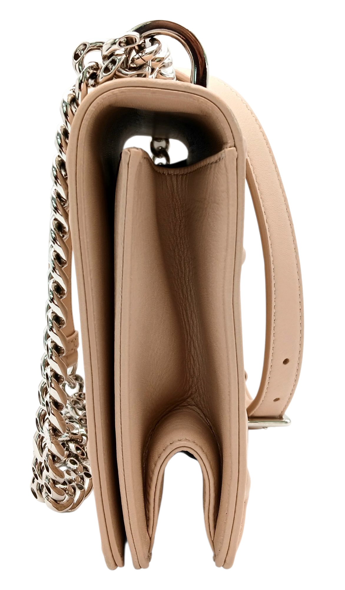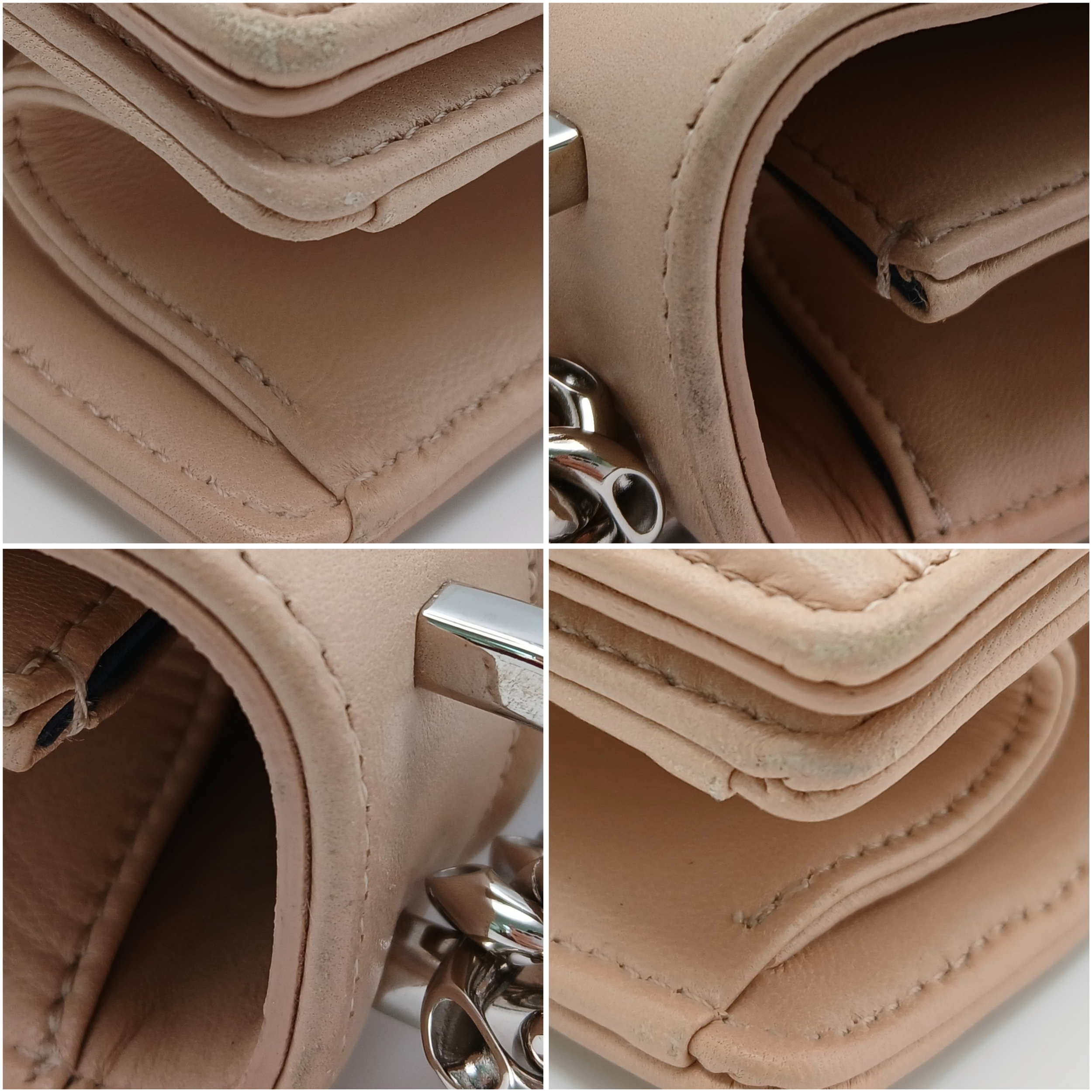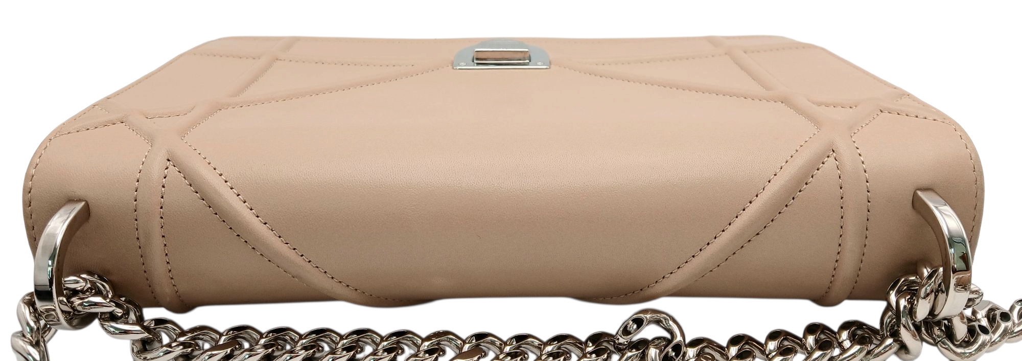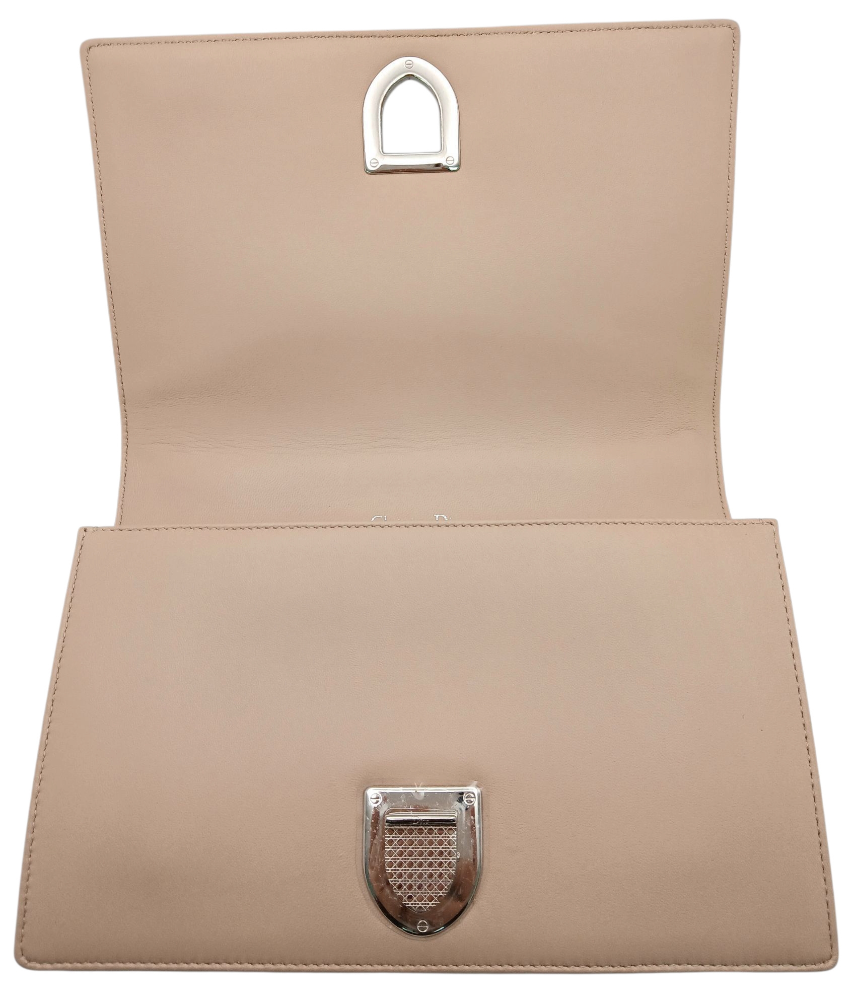 A Christian Dior Beige Leather Diorama Flap Bag. Beige leather exterior with silver-toned hardware. Features a chain and leather shoulder strap with push-lock clasp. Black textile interior includes one main compartment with an inner slip pocket and a zipped pocket. Some signs of wear and tear exterior. Approx 25cm width x 16cm height x 6cm depth. Please see photos or request a condition report. Ref: STK022962