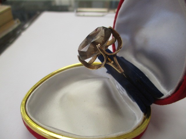 14CT GOLD RING WITH LARGE SMOKEY QUARTZ STONE SIZE Q