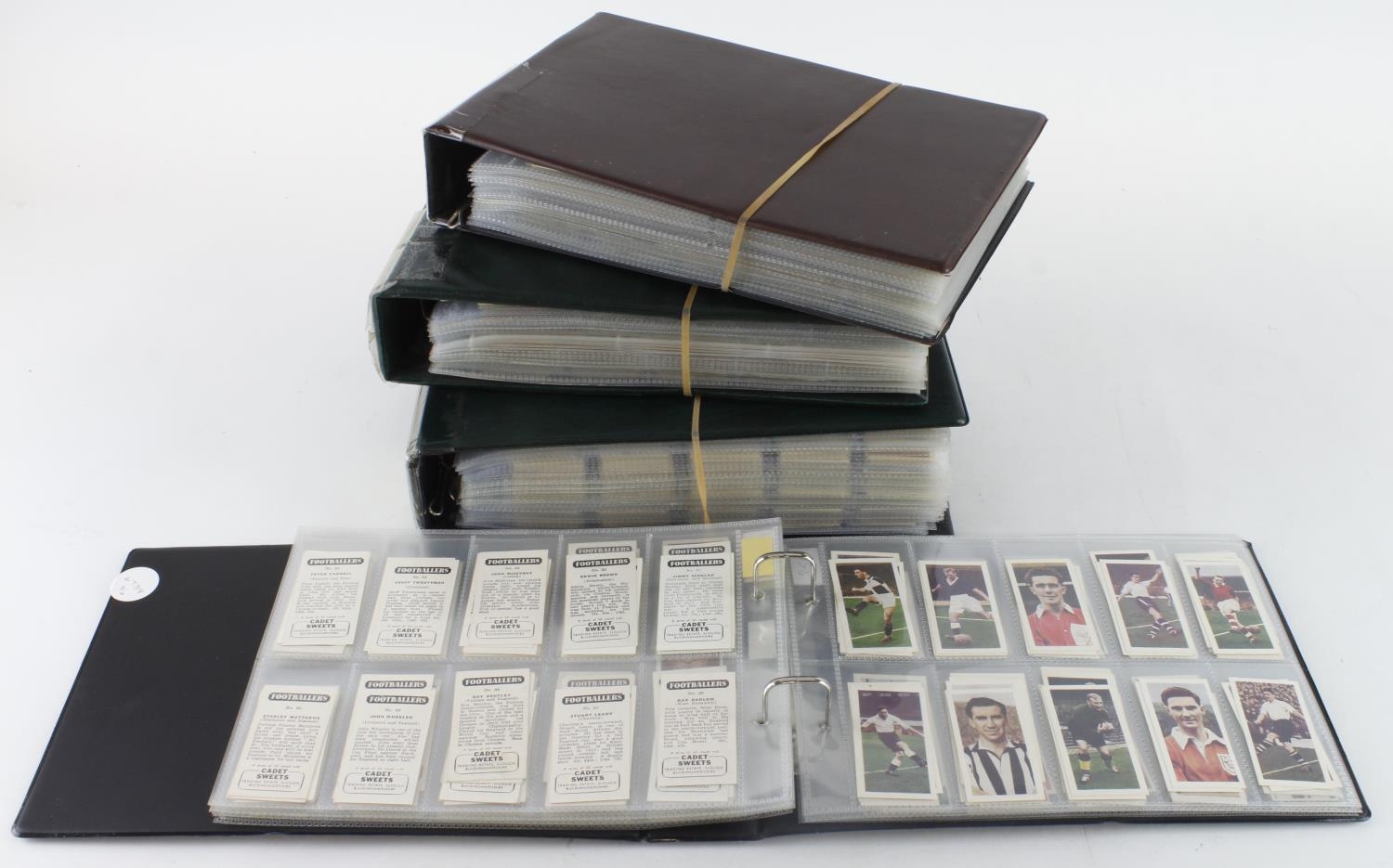 Football interest cards, very large quantity contained in 4 modern albums, tobacco & trade issues, approx 9 complete sets cat value approx £700 together with a quantity of part sets, many virtually complete, mixed condition many G - VG heavy duplication, worth viewing