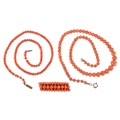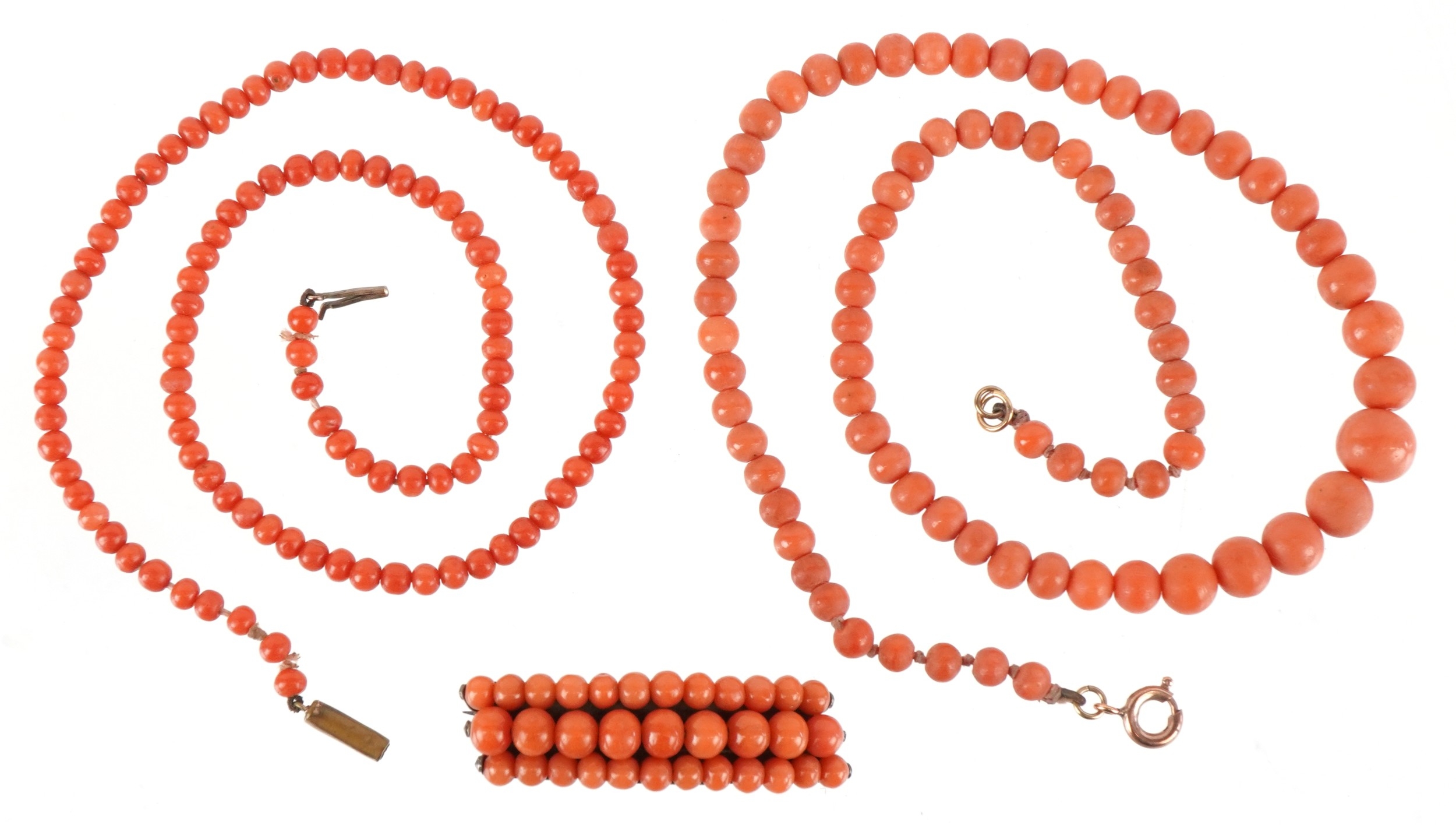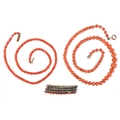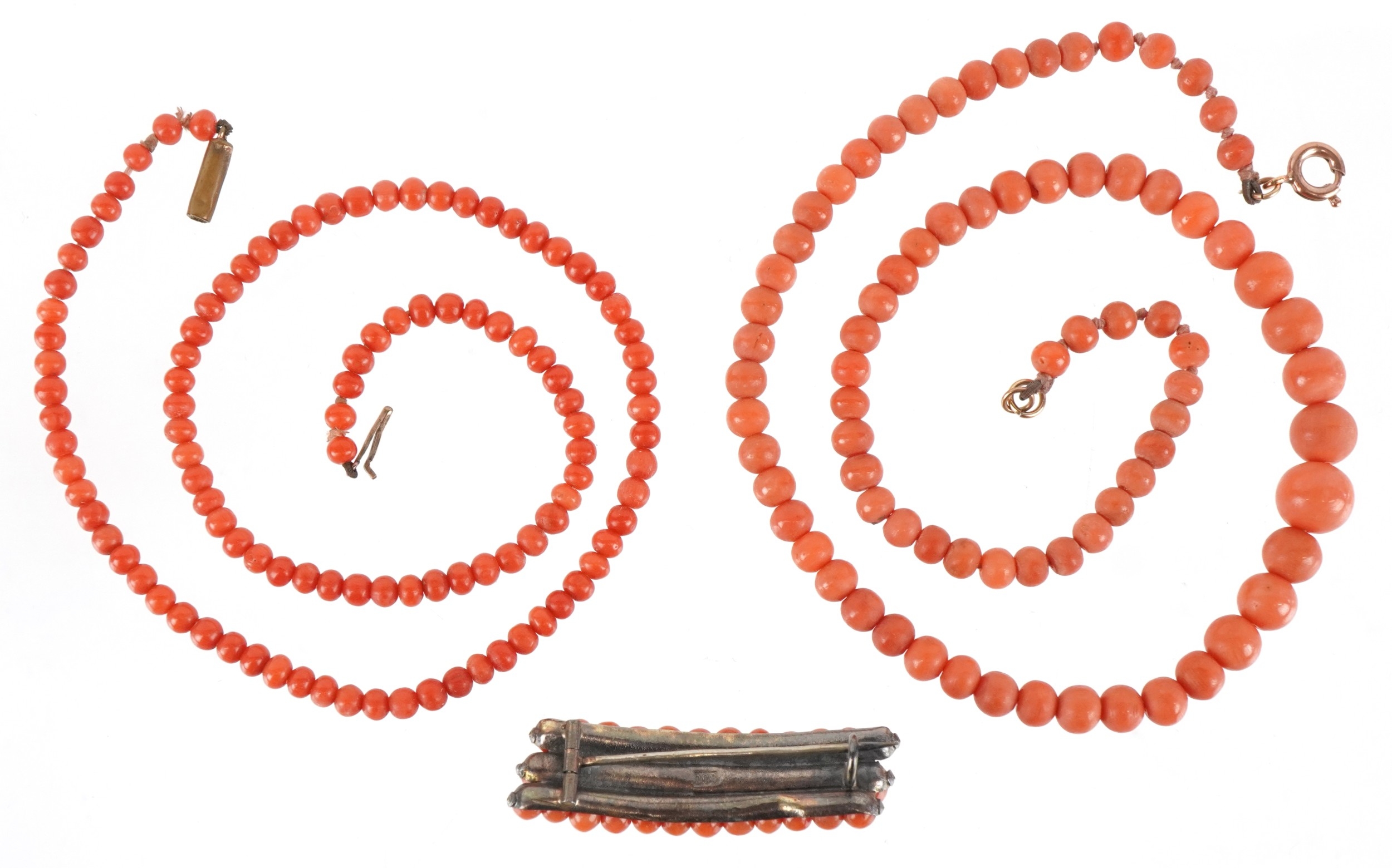 Coral bead jewellery including a graduated necklace and an 800 grade silver brooch, the largest 38cm in length, total 29.4g.