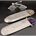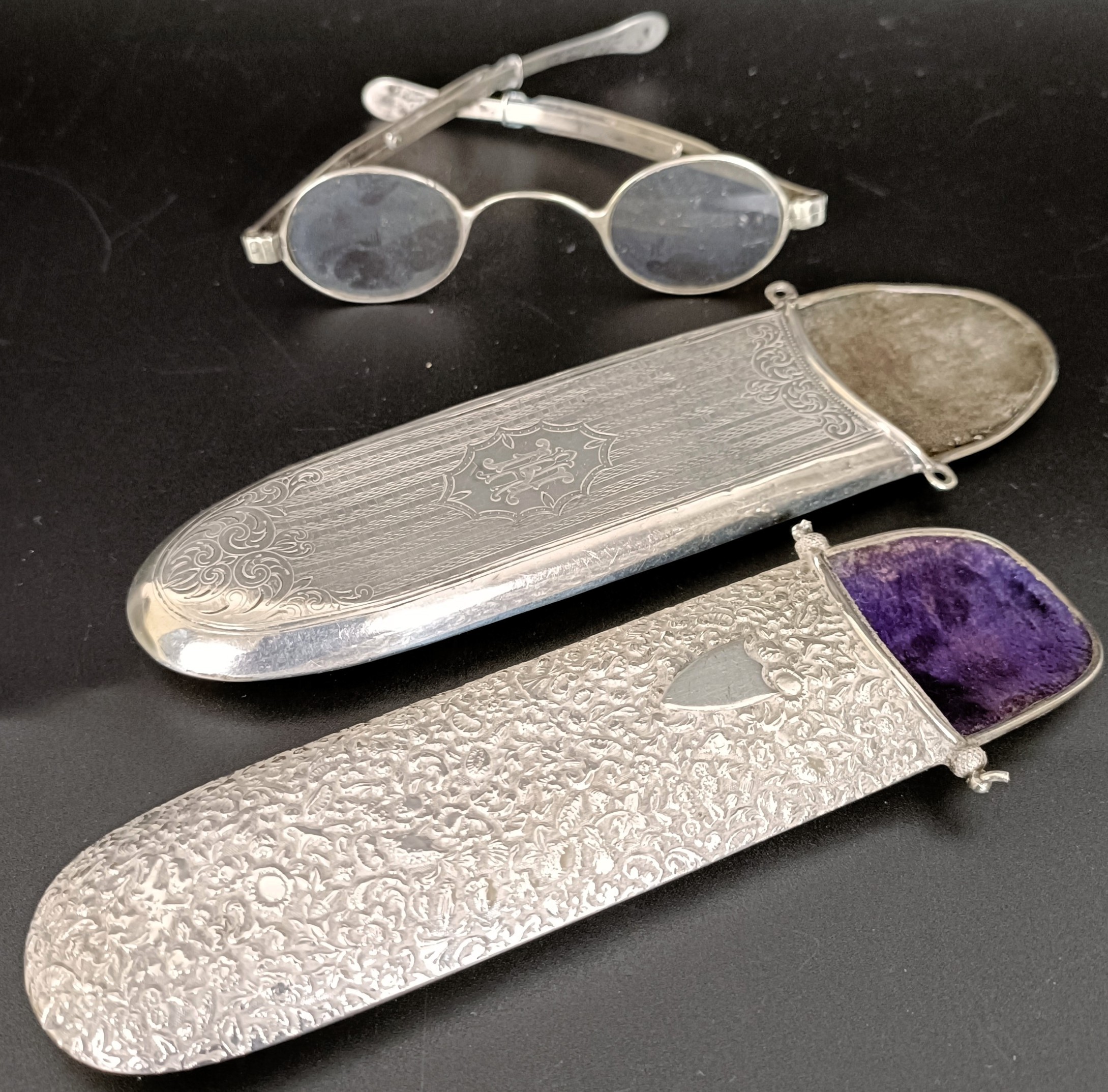 A pair of 19th century spectacles, and a silver mounted spectacle case and silver coloured metal case (3)