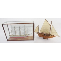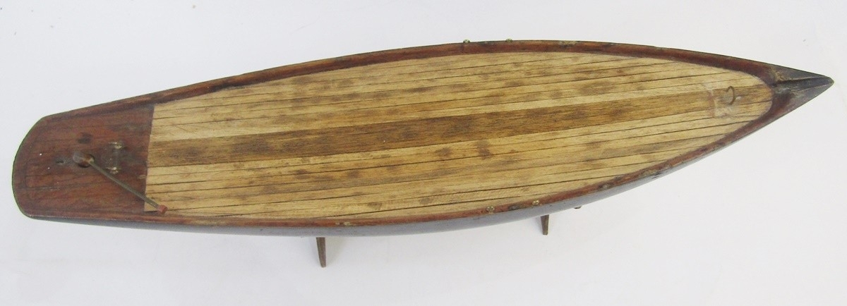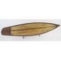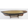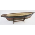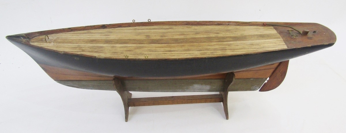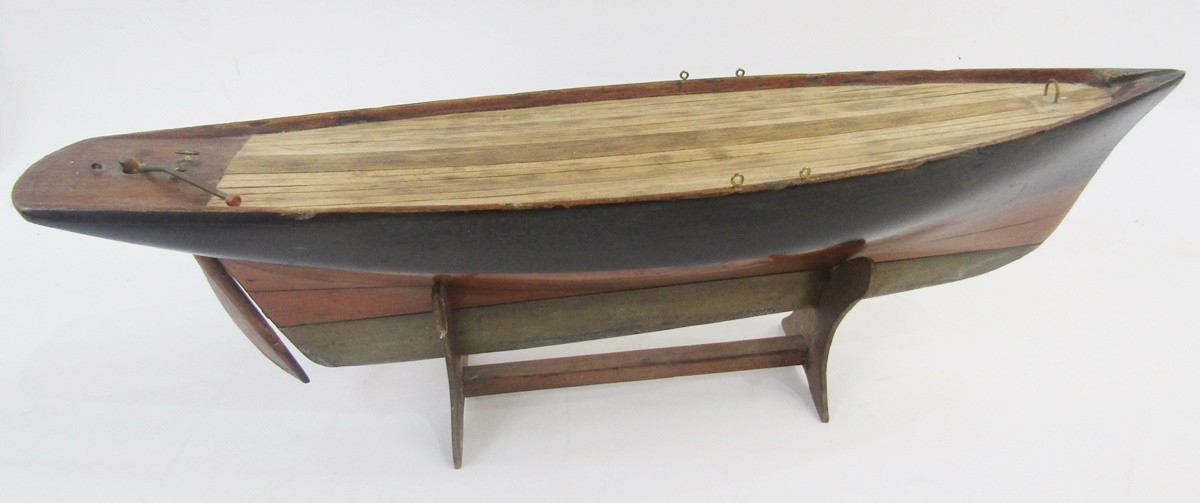 Vintage wooden pond yacht with weighted base and rudder, 56cm long on stained wood stand