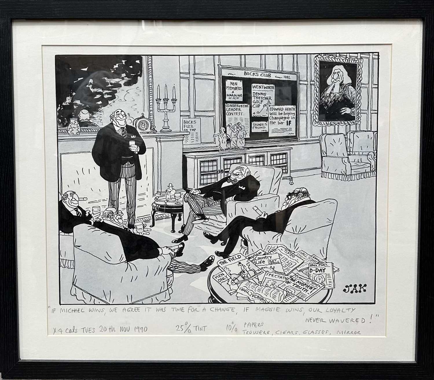 JAK (Raymond Allen Jackson) (British, 1927-1997), three political cartoons of the Thatcher cabinet, 'If Michael wins, we agree it's time for a change, If Maggie wins, our loyalty never wavered!', monogram signed l.r. and dated 1990, watercolour and pen on paper with title and notes for print at the bottom in pencil, 50 by 58cm, framed