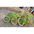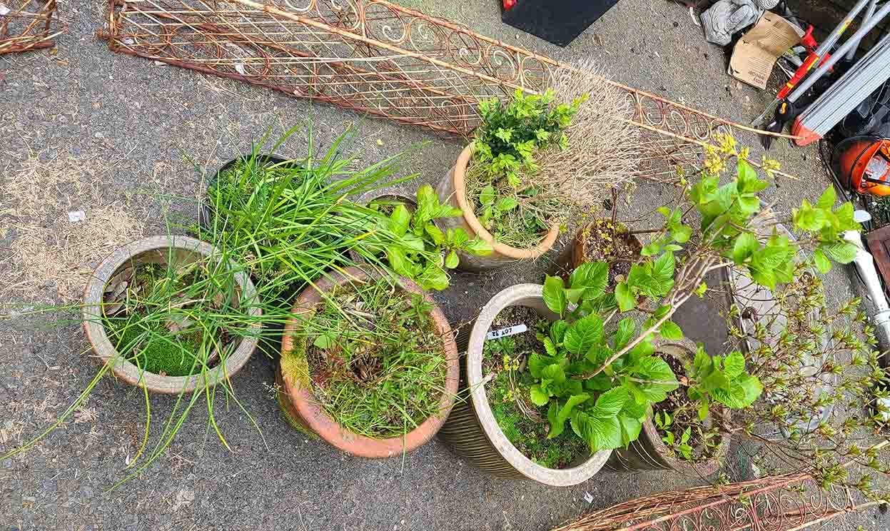 Eight assorted garden pots containing various shrubs including two Azaleas and a Hydrangea, etc.