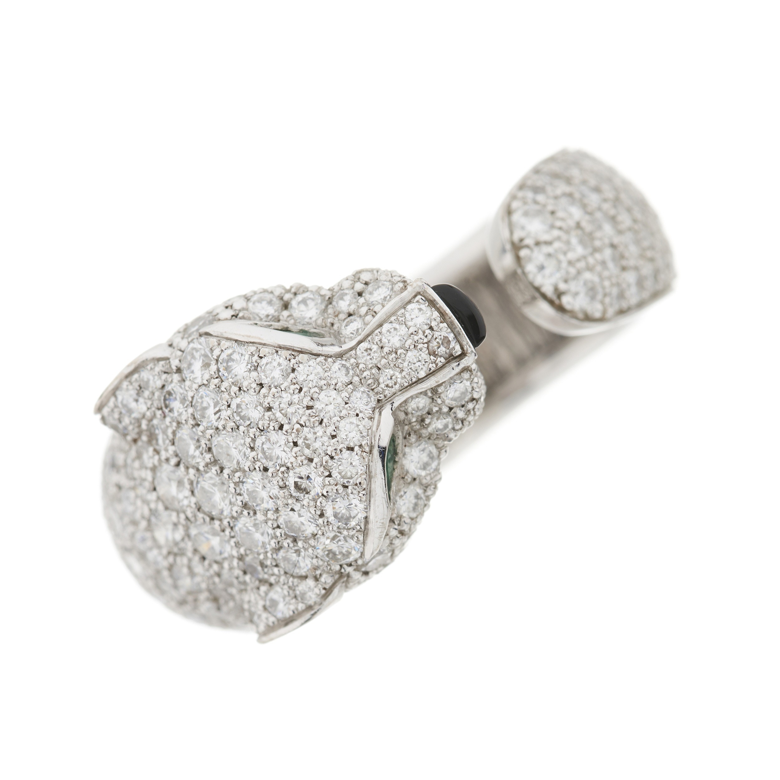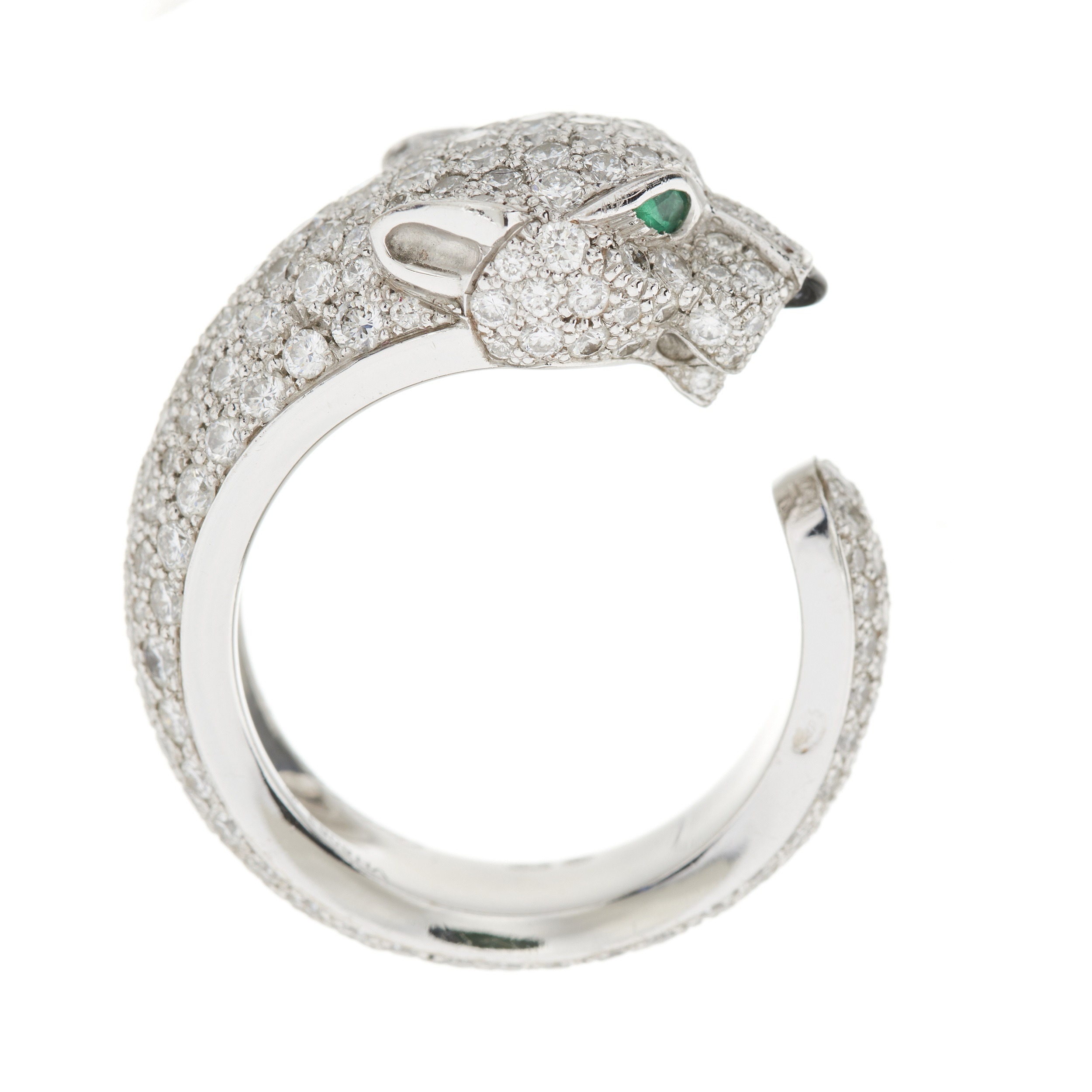 Cartier, an 18ct white gold pave-set diamond Panthere de Cartier ring, medium model, with emerald eyes and onyx cabochon nose, signed Cartier, serial VH8083, estimated total diamond weight 2.40ct, G-H colour, VS clarity, French assay marks, Cartier size 49, approximate ring size J1/2, with maker's case and original purchase receipt, 11g