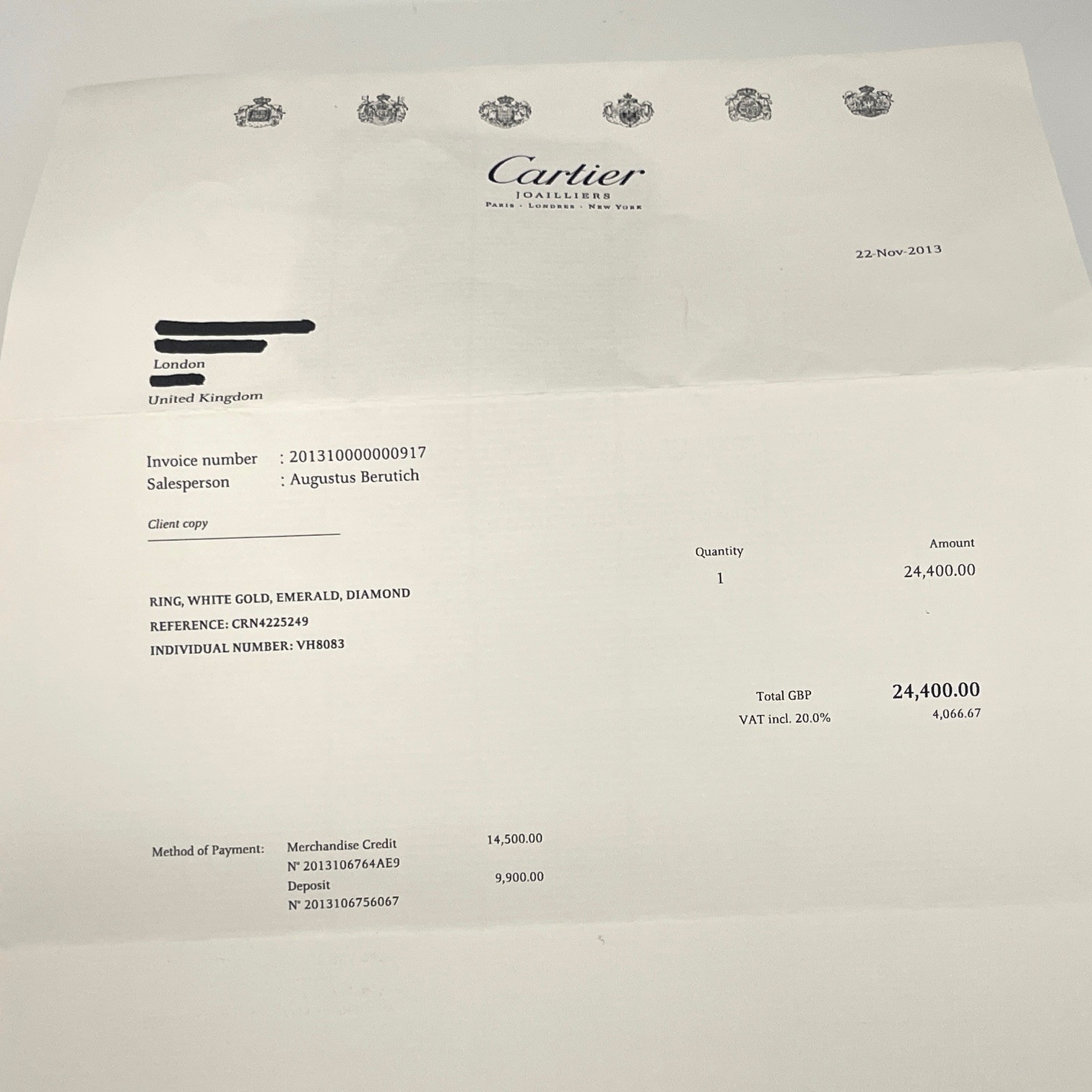 Overall good condition Light to moderate general wear Diamonds and emeralds in good condition and well matched. Diamonds bright and lively. Emeralds good clarity Enamel in good condition, no chips or scratches Original purchase receipt dated 22-Nov-2013 for an amount of £24,400 (incl. VAT) Clients are advised to view and inspect items before bidding and they must satisfy themselves as to the condition of every lot