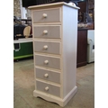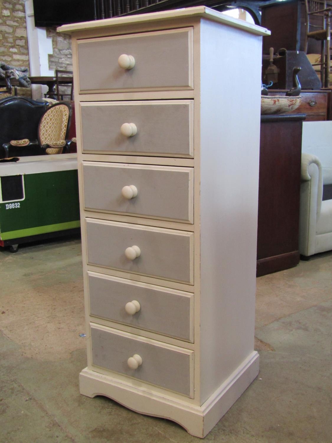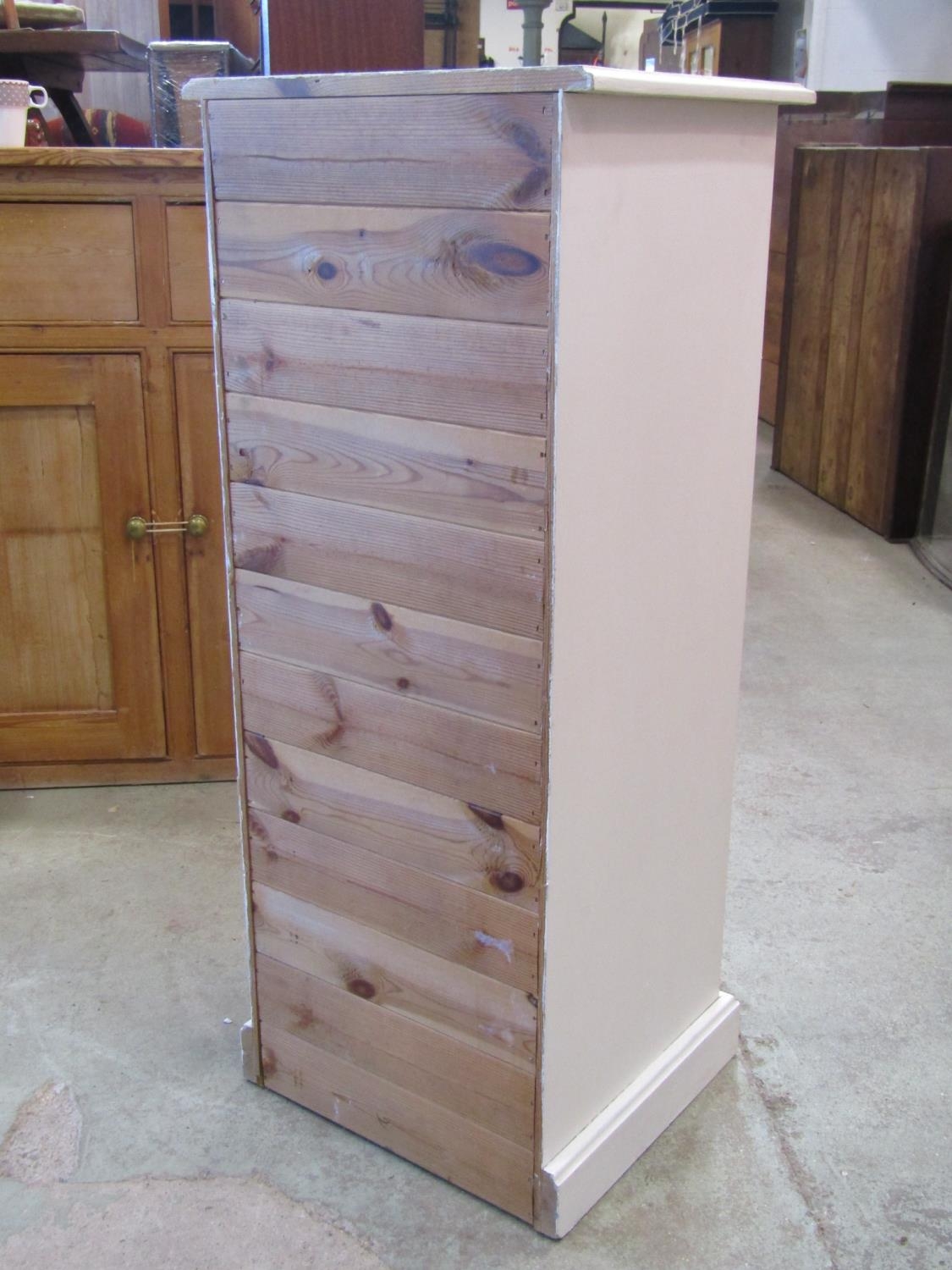 A painted pine pedestal chest of six long drawers set on a moulded plinth, 44 cm wide x 109 cm high