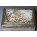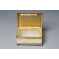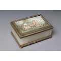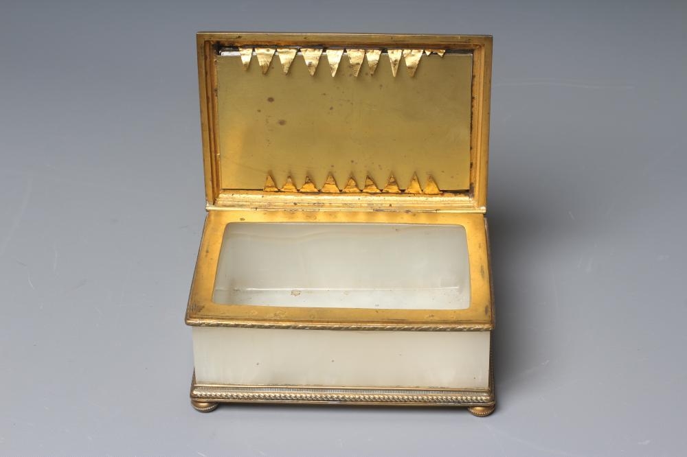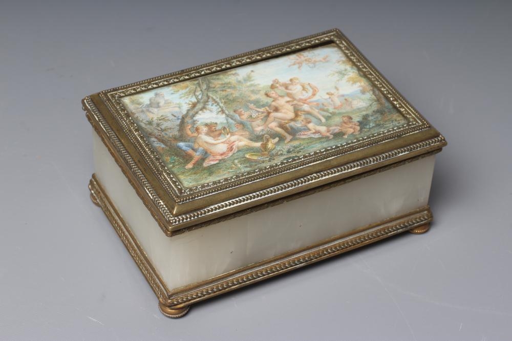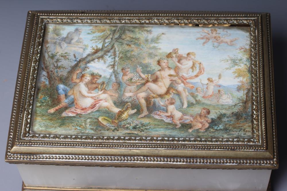 A DUNHILL ONYX CASKET, early 20th century, of plain oblong form with four polished panels inset to bead gilt metal mounts and raised upon four bun feet, the cover hinged and further inset with an ivory panel painted by J Kampf with a Bacchanalian feast in open landscape, 3" x 5", casket stamped Dunhill London and engraved T505, 6" wide Non transferable standard ivory exemption declaration number CTRRF1U6 (Est. plus 24% premium inc. VAT)