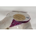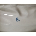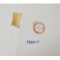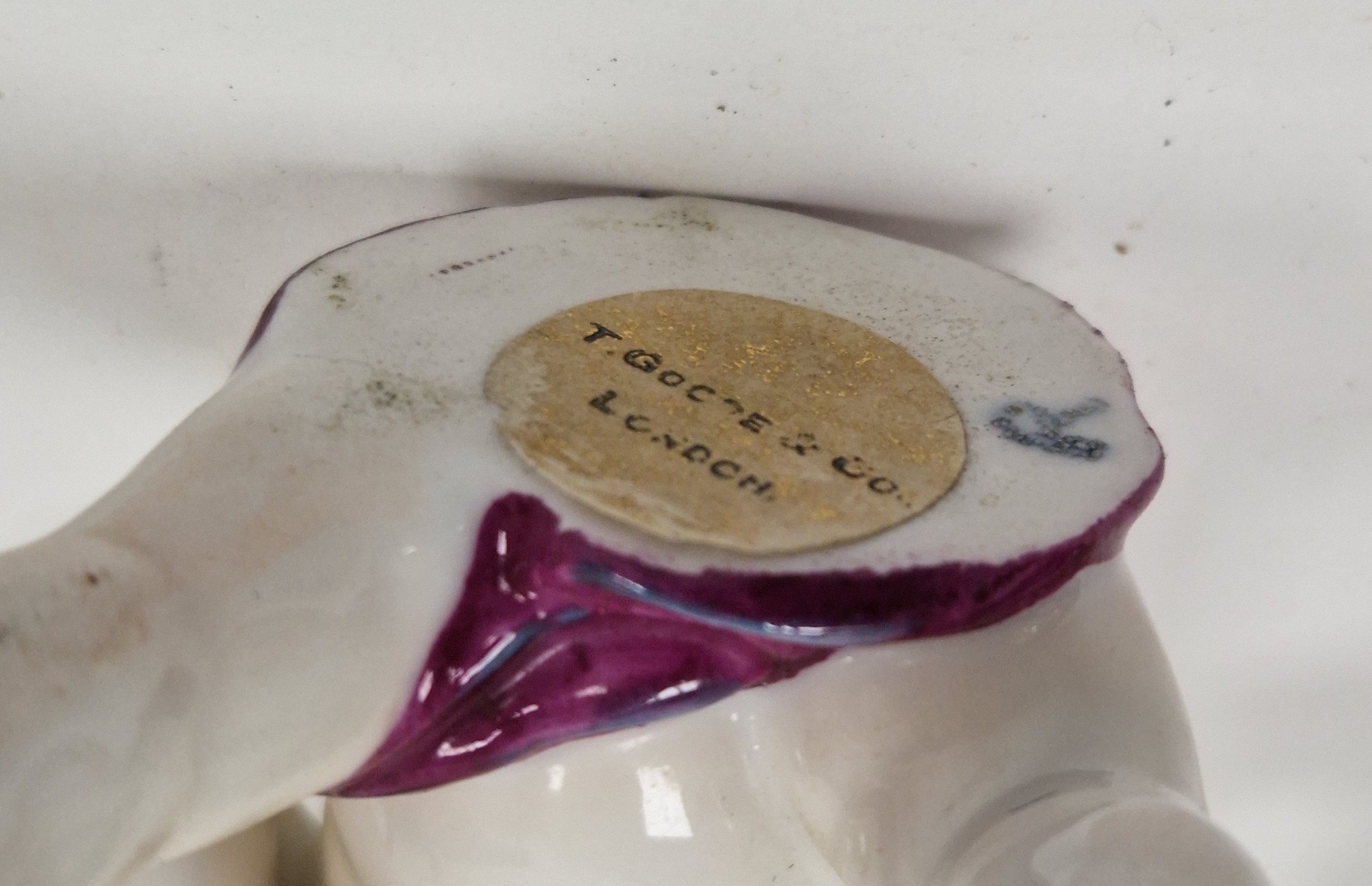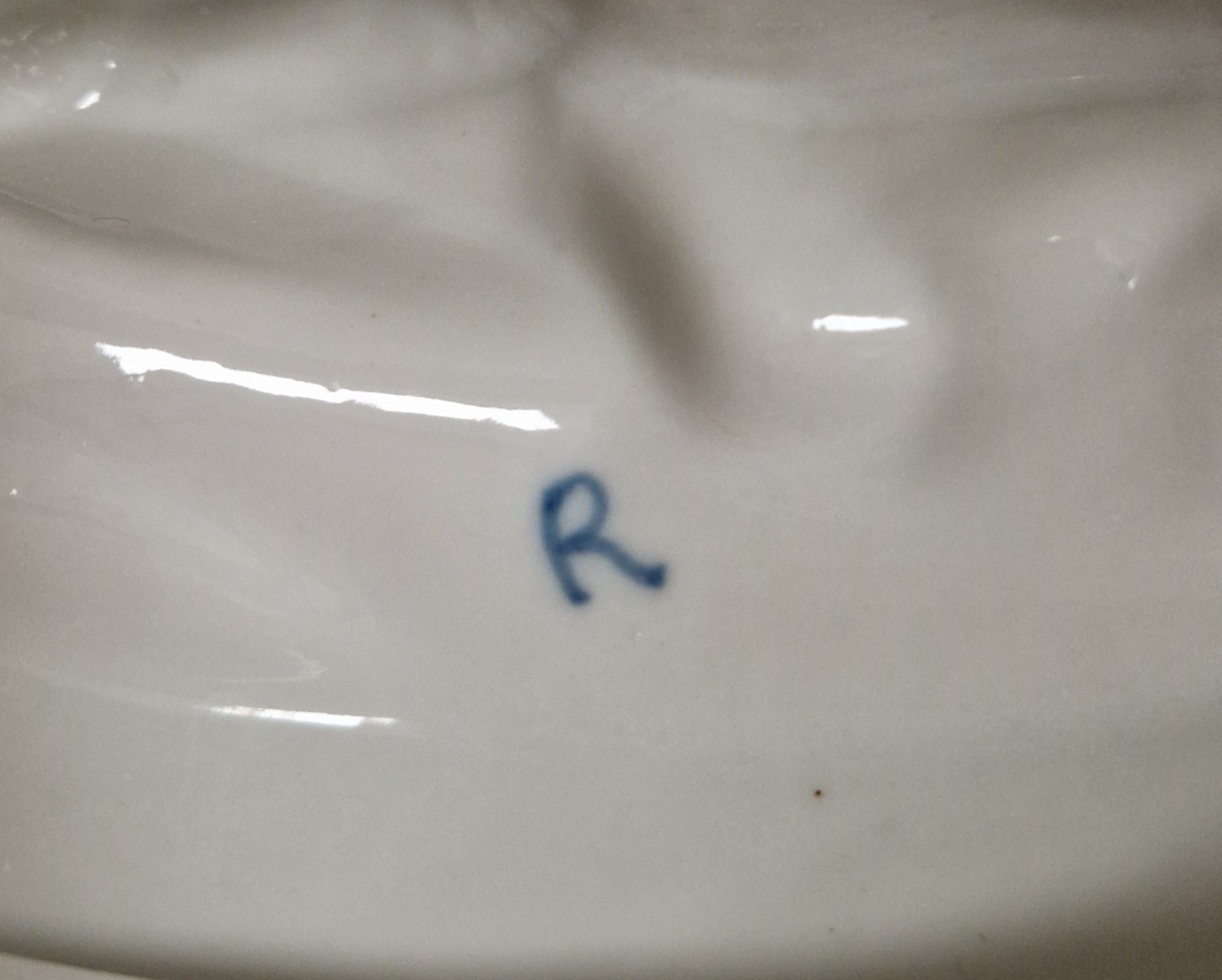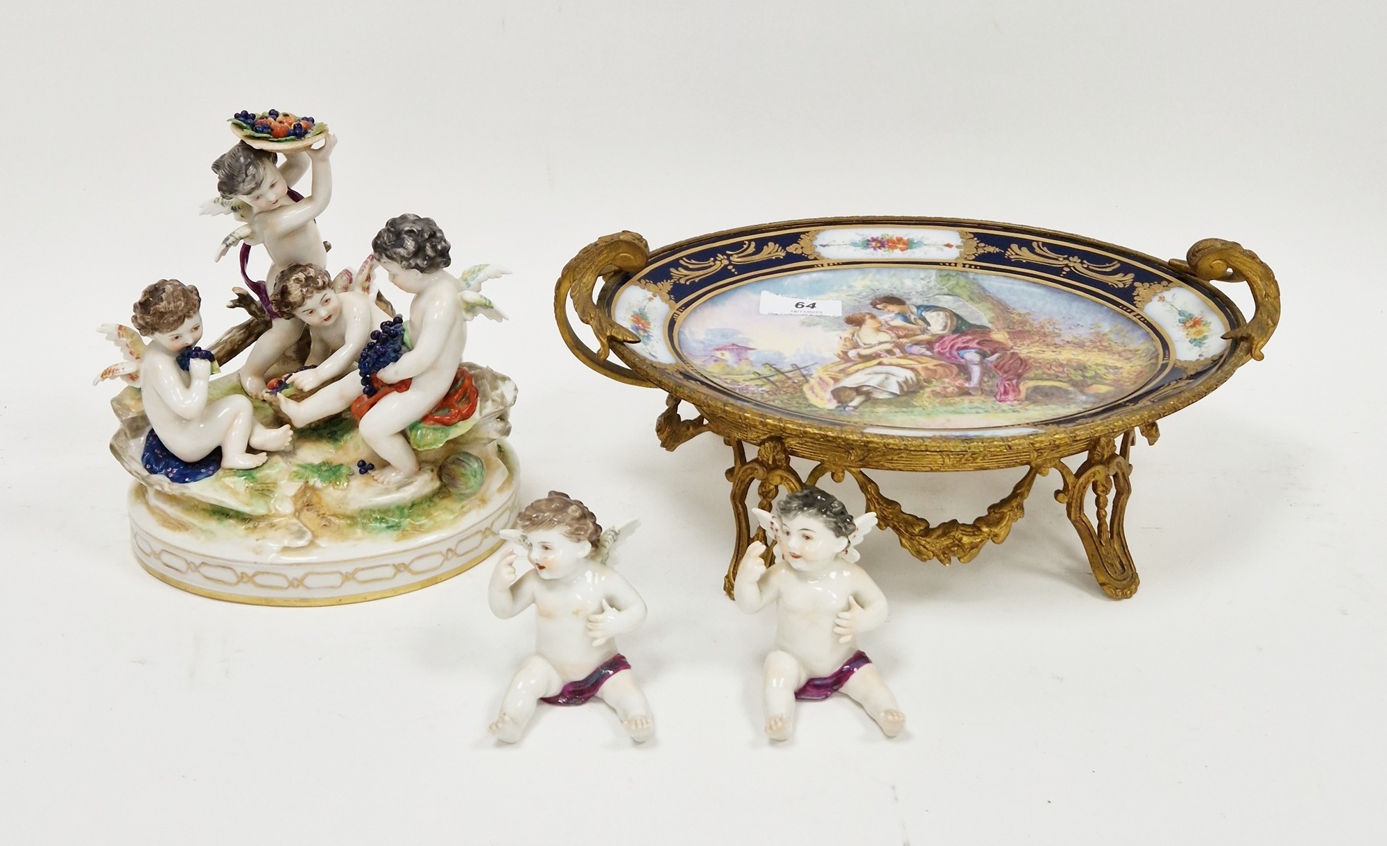 French porcelain Sevres-style gilt metal mounted oval footed dish, 20th century, spurious Chateau de Tuilerie mark in red, blue faience mark, painted with Watteauesque figure in parkland, signed A Gilbert within floral dark blue gilt scroll borders, 29cm wide and a continental porcelain figure of Bacchic putti, modelled seated on oval rockwork base, 17.5cm high together with two smaller seated winged putti, probably Rudolstadt, Germany, circa 1900 underglaze blue R mark, one bearing Thomas Goode & Co London retailers label (4)