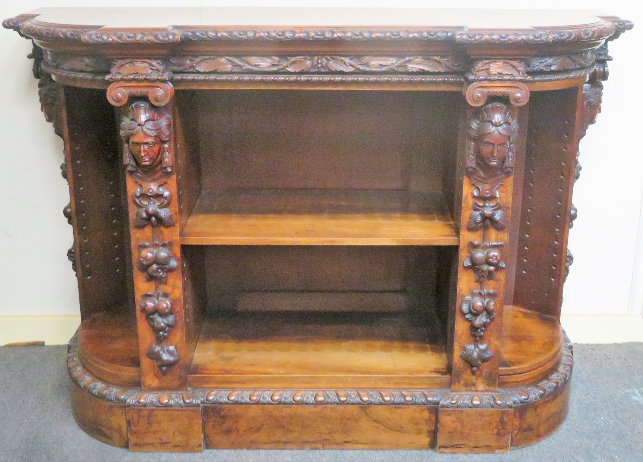 19th century Walnut veneered open bookcase, heavily carved with females masks and fruit and foliage. Approx. 94cm H x 137cm W x 49cm D