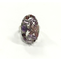 Silver ring with a wide bar of pink stones flanked by bands of clear glass stones. Size O.